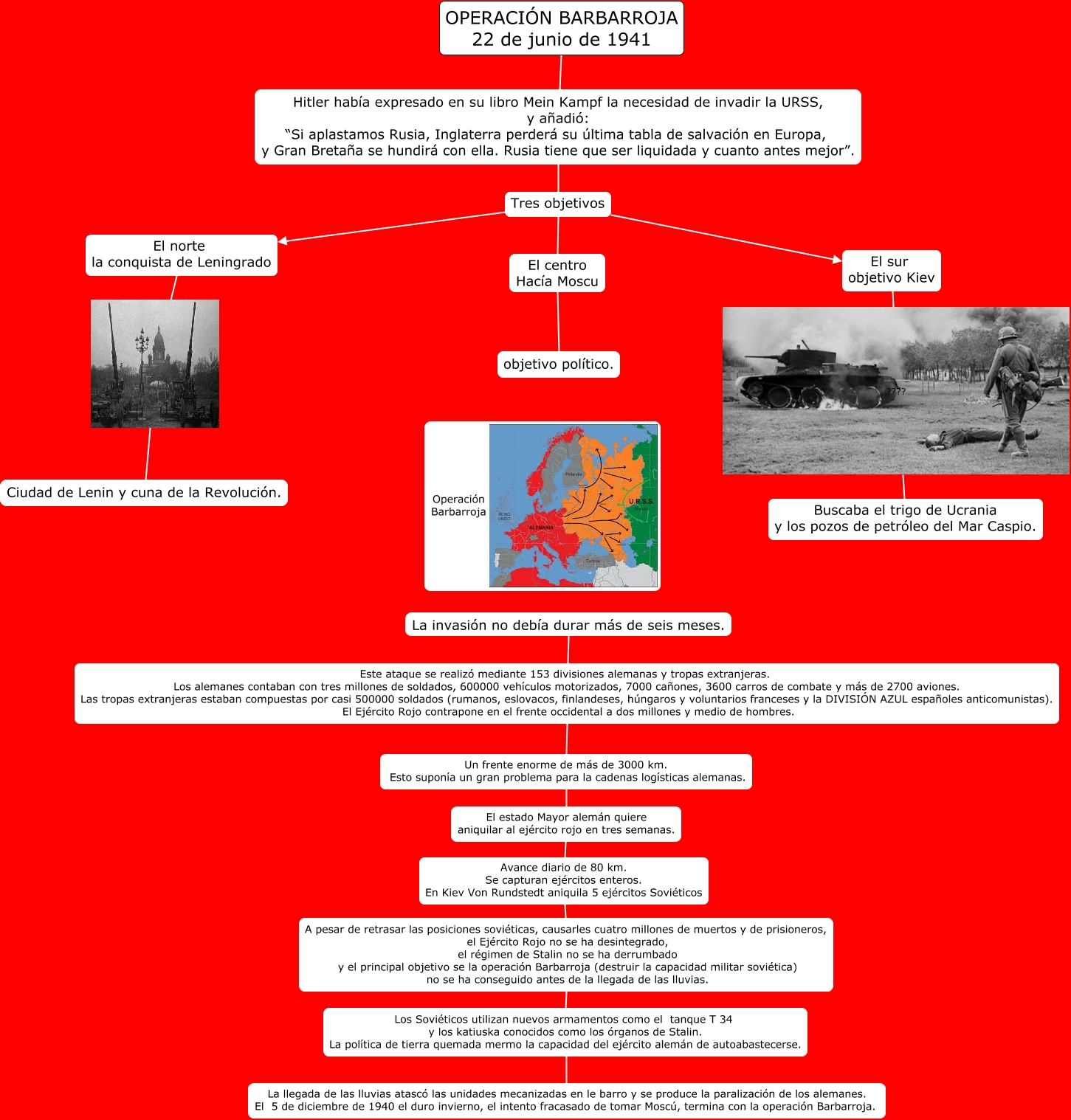 Este Cmap, tiene información relacionada con: La invasión de la URSS, OPERACIÓN BARBARROJA 22 de junio de 1941 Hitler había expresado en su libro Mein Kampf la necesidad de invadir la URSS, y añadió: “Si aplastamos Rusia, Inglaterra perderá su última tabla de salvación en Europa, y Gran Bretaña se hundirá con ella. Rusia tiene que ser liquidada y cuanto antes mejor”., El estado Mayor alemán quiere aniquilar al ejército rojo en tres semanas. Avance diario de 80 km. Se capturan ejércitos enteros. En Kiev Von Rundstedt aniquila 5 ejércitos Soviéticos, Un frente enorme de más de 3000 km. Esto suponía un gran problema para la cadenas logísticas alemanas. El estado Mayor alemán quiere aniquilar al ejército rojo en tres semanas., Hitler había expresado en su libro Mein Kampf la necesidad de invadir la URSS, y añadió: “Si aplastamos Rusia, Inglaterra perderá su última tabla de salvación en Europa, y Gran Bretaña se hundirá con ella. Rusia tiene que ser liquidada y cuanto antes mejor”. Tres objetivos, Tres objetivos El norte la conquista de Leningrado, Tres objetivos El centro Hacía Moscu, Tres objetivos El sur objetivo Kiev, Los Soviéticos utilizan nuevos armamentos como el tanque T 34 y los katiuska conocidos como los órganos de Stalin. La política de tierra quemada mermo la capacidad del ejército alemán de autoabastecerse. La llegada de las lluvias atascó las unidades mecanizadas en le barro y se produce la paralización de los alemanes. El 5 de diciembre de 1940 el duro invierno, el intento fracasado de tomar Moscú, termina con la operación Barbarroja., La invasión no debía durar más de seis meses. Este ataque se realizó mediante 153 divisiones alemanas y tropas extranjeras. Los alemanes contaban con tres millones de soldados, 600000 vehículos motorizados, 7000 cañones, 3600 carros de combate y más de 2700 aviones. Las tropas extranjeras estaban compuestas por casi 500000 soldados (rumanos, eslovacos, finlandeses, húngaros y voluntarios franceses y la DIVISIÓN AZUL españoles anticomunistas). El Ejército Rojo contrapone en el frente occidental a dos millones y medio de hombres., Avance diario de 80 km. Se capturan ejércitos enteros. En Kiev Von Rundstedt aniquila 5 ejércitos Soviéticos A pesar de retrasar las posiciones soviéticas, causarles cuatro millones de muertos y de prisioneros, el Ejército Rojo no se ha desintegrado, el régimen de Stalin no se ha derrumbado y el principal objetivo se la operación Barbarroja (destruir la capacidad militar soviética) no se ha conseguido antes de la llegada de las lluvias., El centro Hacía Moscu objetivo político., Este ataque se realizó mediante 153 divisiones alemanas y tropas extranjeras. Los alemanes contaban con tres millones de soldados, 600000 vehículos motorizados, 7000 cañones, 3600 carros de combate y más de 2700 aviones. Las tropas extranjeras estaban compuestas por casi 500000 soldados (rumanos, eslovacos, finlandeses, húngaros y voluntarios franceses y la DIVISIÓN AZUL españoles anticomunistas). El Ejército Rojo contrapone en el frente occidental a dos millones y medio de hombres. Un frente enorme de más de 3000 km. Esto suponía un gran problema para la cadenas logísticas alemanas., El norte la conquista de Leningrado Ciudad de Lenin y cuna de la Revolución., El sur objetivo Kiev ???? Buscaba el trigo de Ucrania y los pozos de petróleo del Mar Caspio., A pesar de retrasar las posiciones soviéticas, causarles cuatro millones de muertos y de prisioneros, el Ejército Rojo no se ha desintegrado, el régimen de Stalin no se ha derrumbado y el principal objetivo se la operación Barbarroja (destruir la capacidad militar soviética) no se ha conseguido antes de la llegada de las lluvias. Los Soviéticos utilizan nuevos armamentos como el tanque T 34 y los katiuska conocidos como los órganos de Stalin. La política de tierra quemada mermo la capacidad del ejército alemán de autoabastecerse.