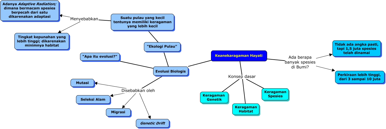 This Concept Map, created with IHMC CmapTools, has information related to: Keanekaragaman hayati, Suatu pulau yang kecil tentunya memiliki keragaman yang lebih kecil Menyebabkan Tingkat kepunahan yang lebih tinggi; dikarenakan minimnya habitat, Evolusi Biologis Disebabkan oleh Genetic Drift, Keanekaragaman Hayati Konsep dasar Keragaman Spesies, Keanekaragaman Hayati Konsep dasar Keragaman Genetik, Evolusi Biologis Disebabkan oleh Mutasi, Evolusi Biologis ???? "Apa itu evolusi?", Keanekaragaman Hayati Ada berapa banyak spesies di Bumi? Perkiraan lebih tinggi, dari 3 sampai 10 juta, Evolusi Biologis Disebabkan oleh Seleksi Alam, Evolusi Biologis Disebabkan oleh Migrasi, Suatu pulau yang kecil tentunya memiliki keragaman yang lebih kecil Menyebabkan Adanya Adaptive Radiation; dimana bermacam spesies berpecah dari satu dikarenakan adaptasi, Keanekaragaman Hayati Ada berapa banyak spesies di Bumi? Tidak ada angka pasti, tapi 1,5 juta spesies telah dinamai, Keanekaragaman Hayati Konsep dasar Keragaman Habitat, Evolusi Biologis ???? "Ekologi Pulau", "Ekologi Pulau" ???? Suatu pulau yang kecil tentunya memiliki keragaman yang lebih kecil, Keanekaragaman Hayati ???? Evolusi Biologis