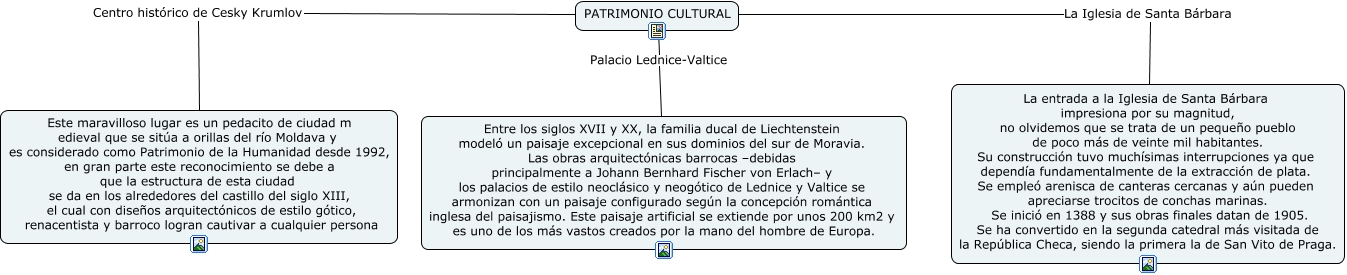 Este Cmap, tiene información relacionada con: Patrimonio Cultural de la Republica Checa, PATRIMONIO CULTURAL Centro histórico de Cesky Krumlov Este maravilloso lugar es un pedacito de ciudad m edieval que se sitúa a orillas del río Moldava y es considerado como Patrimonio de la Humanidad desde 1992, en gran parte este reconocimiento se debe a que la estructura de esta ciudad se da en los alrededores del castillo del siglo XIII, el cual con diseños arquitectónicos de estilo gótico, renacentista y barroco logran cautivar a cualquier persona, PATRIMONIO CULTURAL Palacio Lednice-Valtice Entre los siglos XVII y XX, la familia ducal de Liechtenstein modeló un paisaje excepcional en sus dominios del sur de Moravia. Las obras arquitectónicas barrocas –debidas principalmente a Johann Bernhard Fischer von Erlach– y los palacios de estilo neoclásico y neogótico de Lednice y Valtice se armonizan con un paisaje configurado según la concepción romántica inglesa del paisajismo. Este paisaje artificial se extiende por unos 200 km2 y es uno de los más vastos creados por la mano del hombre de Europa., PATRIMONIO CULTURAL La Iglesia de Santa Bárbara La entrada a la Iglesia de Santa Bárbara impresiona por su magnitud, no olvidemos que se trata de un pequeño pueblo de poco más de veinte mil habitantes. Su construcción tuvo muchísimas interrupciones ya que dependía fundamentalmente de la extracción de plata. Se empleó arenisca de canteras cercanas y aún pueden apreciarse trocitos de conchas marinas. Se inició en 1388 y sus obras finales datan de 1905. Se ha convertido en la segunda catedral más visitada de la República Checa, siendo la primera la de San Vito de Praga.