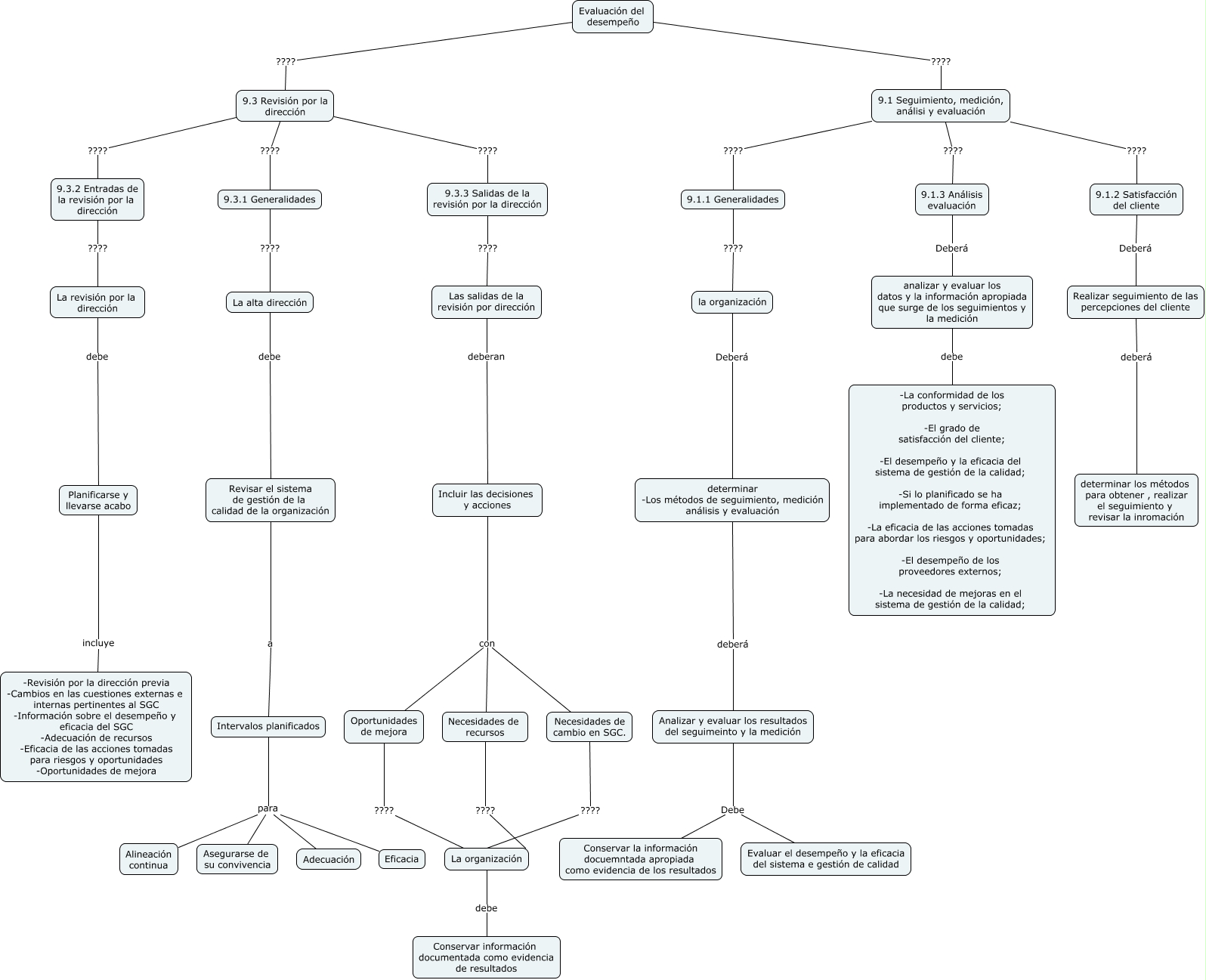 Este Cmap, tiene información relacionada con: Sin Título, 9.1.2 Satisfacción del cliente Deberá Realizar seguimiento de las percepciones del cliente, Revisar el sistema de gestión de la calidad de la organización a Intervalos planificados, Oportunidades de mejora ???? La organización, analizar y evaluar los datos y la información apropiada que surge de los seguimientos y la medición debe -La conformidad de los productos y servicios; -El grado de satisfacción del cliente; -El desempeño y la eficacia del sistema de gestión de la calidad; -Si lo planificado se ha implementado de forma eficaz; -La eficacia de las acciones tomadas para abordar los riesgos y oportunidades; -El desempeño de los proveedores externos; -La necesidad de mejoras en el sistema de gestión de la calidad;, Evaluación del desempeño ???? 9.3 Revisión por la dirección, la organización Deberá determinar -Los métodos de seguimiento, medición análisis y evaluación, Planificarse y llevarse acabo incluye -Revisión por la dirección previa -Cambios en las cuestiones externas e internas pertinentes al SGC -Información sobre el desempeño y eficacia del SGC -Adecuación de recursos -Eficacia de las acciones tomadas para riesgos y oportunidades -Oportunidades de mejora, Incluir las decisiones y acciones con Necesidades de recursos, 9.3 Revisión por la dirección ???? 9.3.3 Salidas de la revisión por la dirección, 9.1 Seguimiento, medición, análisi y evaluación ???? 9.1.2 Satisfacción del cliente, 9.1.3 Análisis evaluación Deberá analizar y evaluar los datos y la información apropiada que surge de los seguimientos y la medición, Intervalos planificados para Asegurarse de su convivencia, 9.1 Seguimiento, medición, análisi y evaluación ???? 9.1.1 Generalidades, La alta dirección debe Revisar el sistema de gestión de la calidad de la organización, Intervalos planificados para Alineación continua, Analizar y evaluar los resultados del seguimeinto y la medición Debe Evaluar el desempeño y la eficacia del sistema e gestión de calidad, Necesidades de recursos ???? La organización, La organización debe Conservar información documentada como evidencia de resultados, Las salidas de la revisión por dirección deberan Incluir las decisiones y acciones, Necesidades de cambio en SGC. ???? La organización