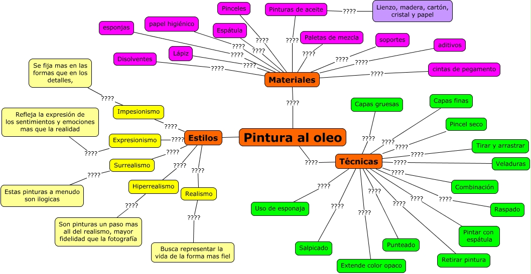 Este Cmap, tiene información relacionada con: pintura ela, Pintura al oleo ???? Materiales, Técnicas ???? Combinación, Materiales ???? Pinturas de aceite, Estilos ???? Expresionismo, Materiales ???? esponjas, Materiales ???? Pinceles, Técnicas ???? Pintar con espátula, Técnicas ???? Veladuras, Pintura al oleo ???? Estilos, Expresionismo ???? Refleja la expresión de los sentimientos y emociones mas que la realidad, Estilos ???? Hiperrealismo, Materiales ???? papel higiénico, Materiales ???? soportes, Pintura al oleo ???? Técnicas, Técnicas ???? Punteado, Materiales ???? cintas de pegamento, Materiales ???? Lápiz, Materiales ???? Disolventes, Técnicas ???? Pincel seco, Impesionismo ???? Se fija mas en las formas que en los detalles,