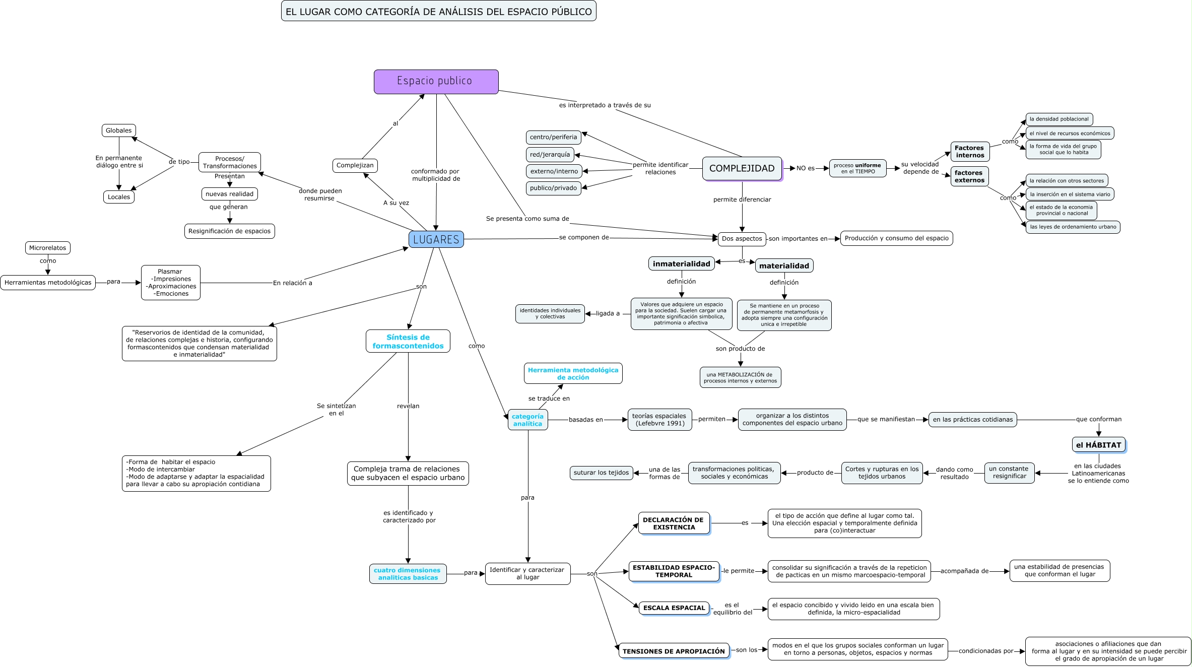 Este Cmap, tiene información relacionada con: TEXTO_el lugar como categoria de análisis del espacio público, Procesos/ Transformaciones Presentan nuevas realidad, materialidad definición Se mantiene en un proceso de permanente metamorfosis y adopta siempre una configuración unica e irrepetible, nuevas realidad que generan Resignificación de espacios, Cortes y rupturas en los tejidos urbanos producto de transformaciones politicas, sociales y económicas, proceso uniforme en el TIEMPO su velocidad depende de Factores internos, COMPLEJIDAD permite identificar relaciones publico/privado, transformaciones politicas, sociales y económicas una de las formas de suturar los tejidos, LUGARES se componen de Dos aspectos, categoría analítica se traduce en Herramienta metodológica de acción, factores externos como la inserción en el sistema viario, Identificar y caracterizar al lugar son TENSIONES DE APROPIACIÓN, Factores internos como la forma de vida del grupo social que lo habita, Factores internos como el nivel de recursos económicos, LUGARES como categoría analítica, categoría analítica para Identificar y caracterizar al lugar, Espacio publico es interpretado a través de su COMPLEJIDAD, Identificar y caracterizar al lugar son ESTABILIDAD ESPACIO- TEMPORAL, Herramientas metodológicas para Plasmar -Impresiones -Aproximaciones -Emociones, Compleja trama de relaciones que subyacen el espacio urbano es identificado y caracterizado por cuatro dimensiones analiticas basicas, COMPLEJIDAD permite diferenciar Dos aspectos