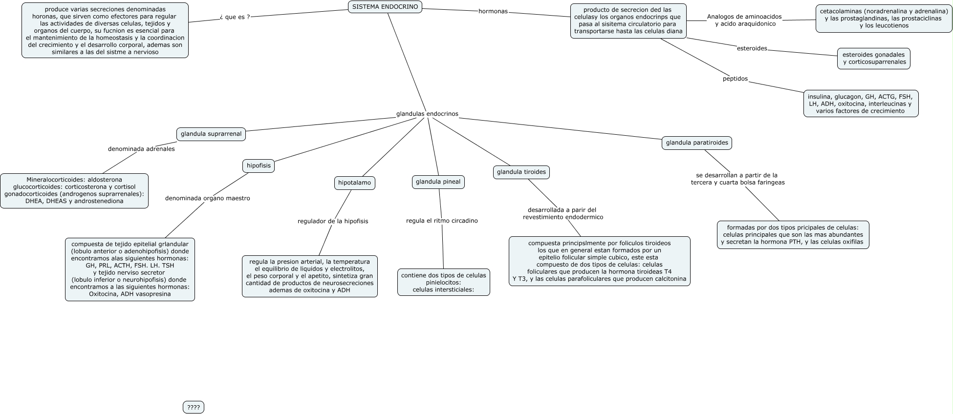 Este Cmap, tiene información relacionada con: sistema endocrino, producto de secrecion ded las celulasy los organos endocrinps que pasa al sisitema circulatorio para transportarse hasta las celulas diana esteroides esteroides gonadales y corticosuparrenales, SISTEMA ENDOCRINO glandulas endocrinos glandula tiroides, glandula paratiroides se desarrollan a partir de la tercera y cuarta bolsa faringeas formadas por dos tipos pricipales de celulas: celulas principales que son las mas abundantes y secretan la hormona PTH, y las celulas oxifilas, SISTEMA ENDOCRINO glandulas endocrinos glandula pineal, SISTEMA ENDOCRINO hormonas producto de secrecion ded las celulasy los organos endocrinps que pasa al sisitema circulatorio para transportarse hasta las celulas diana, glandula suprarrenal denominada adrenales Mineralocorticoides: aldosterona glucocorticoides: corticosterona y cortisol gonadocorticoides (androgenos suprarrenales): DHEA, DHEAS y androstenediona, SISTEMA ENDOCRINO glandulas endocrinos hipotalamo, producto de secrecion ded las celulasy los organos endocrinps que pasa al sisitema circulatorio para transportarse hasta las celulas diana Analogos de aminoacidos y acido araquidonico cetacolaminas (noradrenalina y adrenalina) y las prostaglandinas, las prostaciclinas y los leucotienos, SISTEMA ENDOCRINO glandulas endocrinos hipofisis, glandula tiroides desarrollada a parir del revestimiento endodermico compuesta principslmente por foliculos tiroideos los que en general estan formados por un epitelio folicular simple cubico, este esta compuesto de dos tipos de celulas: celulas foliculares que producen la hormona tiroideas T4 Y T3, y las celulas parafoliculares que producen calcitonina, SISTEMA ENDOCRINO glandulas endocrinos glandula paratiroides, producto de secrecion ded las celulasy los organos endocrinps que pasa al sisitema circulatorio para transportarse hasta las celulas diana peptidos insulina, glucagon, GH, ACTG, FSH, LH, ADH, oxitocina, interleucinas y varios factores de crecimiento, hipofisis denominada organo maestro compuesta de tejido epitelial grlandular (lobulo anterior o adenohipofisis) donde encontramos alas siguientes hormonas: GH, PRL, ACTH, FSH. LH. TSH y tejido nerviso secretor (lobulo inferior o neurohipofisis) donde encontramos a las siguientes hormonas: Oxitocina, ADH vasopresina, SISTEMA ENDOCRINO ¿ que es ? produce varias secreciones denominadas horonas, que sirven como efectores para regular las actividades de diversas celulas, tejidos y organos del cuerpo, su fucnion es esencial para el mantenimiento de la homeostasis y la coordinacion del crecimiento y el desarrollo corporal, ademas son similares a las del sistme a nervioso, hipotalamo regulador de la hipofisis regula la presion arterial, la temperatura el equilibrio de liquidos y electrolitos, el peso corporal y el apetito, sintetiza gran cantidad de productos de neurosecreciones ademas de oxitocina y ADH, SISTEMA ENDOCRINO glandulas endocrinos glandula suprarrenal, glandula pineal regula el ritmo circadino contiene dos tipos de celulas pinielocitos: celulas intersticiales: