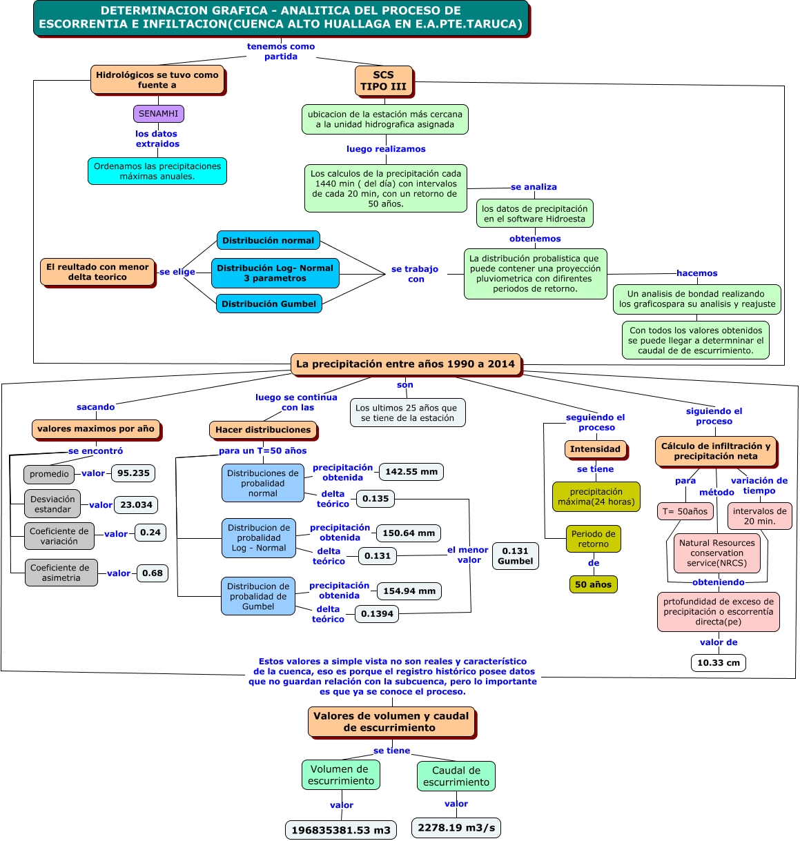 Este Cmap, tiene información relacionada con: Mapa 2 de Hidrología general cuest. 6, prtofundidad de exceso de precipitación o escorrentía directa(pe) valor de 10.33 cm, Hidrológicos se tuvo como fuente a La precipitación entre años 1990 a 2014, Distribución Log- Normal 3 parametros se trabajo con, los datos de precipitación en el software Hidroesta obtenemos La distribución probalistica que puede contener una proyección pluviometrica con difirentes periodos de retorno., Natural Resources conservation service(NRCS) obteniendo prtofundidad de exceso de precipitación o escorrentía directa(pe), ubicacion de la estación más cercana a la unidad hidrografica asignada luego realizamos Los calculos de la precipitación cada 1440 min ( del día) con intervalos de cada 20 min, con un retorno de 50 años., 0.135 el menor valor 0.131 Gumbel, Coeficiente de variación valor 0.24, Volumen de escurrimiento valor 196835381.53 m3, Valores de volumen y caudal de escurrimiento se tiene Volumen de escurrimiento, DETERMINACION GRAFICA - ANALITICA DEL PROCESO DE ESCORRENTIA E INFILTACION(CUENCA ALTO HUALLAGA EN E.A.PTE.TARUCA) tenemos como partida Hidrológicos se tuvo como fuente a, Cálculo de infiltración y precipitación neta para T= 50años, Los calculos de la precipitación cada 1440 min ( del día) con intervalos de cada 20 min, con un retorno de 50 años. se analiza los datos de precipitación en el software Hidroesta, Distribucion de probalidad Log - Normal precipitación obtenida 150.64 mm, La precipitación entre años 1990 a 2014 son Los ultimos 25 años que se tiene de la estación, Caudal de escurrimiento valor 2278.19 m3/s, promedio valor 95.235, La precipitación entre años 1990 a 2014 sacando valores maximos por año, valores maximos por año se encontró Coeficiente de variación, Hidrológicos se tuvo como fuente a SENAMHI