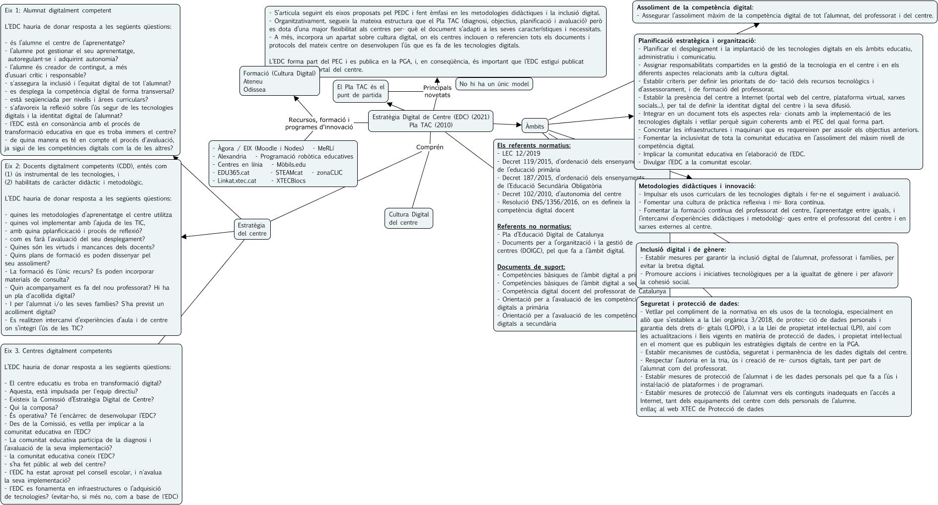 Aquest mapa conceptual conté informació relacionada amb: EDC, Estratègia Digital de Centre (EDC) (2021) Pla TAC (2010) Principals novetats - S’articula seguint els eixos proposats pel PEDC i fent èmfasi en les metodologies didàctiques i la inclusió digital. - Organitzativament, segueix la mateixa estructura que el Pla TAC (diagnosi, objectius, planificació i avaluació) però es dota d’una major flexibilitat als centres per- què el document s’adapti a les seves característiques i necessitats. - A més, incorpora un apartat sobre cultura digital, on els centres inclouen o referencien tots els documents i protocols del mateix centre on desenvolupen l’ús que es fa de les tecnologies digitals. L’EDC forma part del PEC i es publica en la PGA, i, en conseqüència, és important que l’EDC estigui publicat en obert en el portal del centre., Estratègia Digital de Centre (EDC) (2021) Pla TAC (2010) Àmbits, Estratègia del centre Eix 3. Centres digitalment competents L’EDC hauria de donar resposta a les següents qüestions: - El centre educatiu es troba en transformació digital? - Aquesta, està impulsada per l'equip directiu? - Existeix la Comissió d’Estratègia Digital de Centre? - Qui la composa? - És operativa? Té l'encàrrec de desenvolupar l’EDC? - Des de la Comissió, es vetlla per implicar a la comunitat educativa en l’EDC? - La comunitat educativa participa de la diagnosi i l’avaluació de la seva implementació? - la comunitat educativa coneix l'EDC? - s’ha fet públic al web del centre? - l'EDC ha estat aprovat pel consell escolar, i n'avalua la seva implementació? - l'EDC es fonamenta en infraestructures o l’adquisició de tecnologies? (evitar-ho, si més no, com a base de l'EDC), El Pla TAC és el punt de partida Principals novetats - S’articula seguint els eixos proposats pel PEDC i fent èmfasi en les metodologies didàctiques i la inclusió digital. - Organitzativament, segueix la mateixa estructura que el Pla TAC (diagnosi, objectius, planificació i avaluació) però es dota d’una major flexibilitat als centres per- què el document s’adapti a les seves característiques i necessitats. - A més, incorpora un apartat sobre cultura digital, on els centres inclouen o referencien tots els documents i protocols del mateix centre on desenvolupen l’ús que es fa de les tecnologies digitals. L’EDC forma part del PEC i es publica en la PGA, i, en conseqüència, és important que l’EDC estigui publicat en obert en el portal del centre., Estratègia Digital de Centre (EDC) (2021) Pla TAC (2010) Recursos, formació i programes d'innovació Formació (Cultura Digital) Ateneu Odissea, Estratègia Digital de Centre (EDC) (2021) Pla TAC (2010) Comprén Cultura Digital del centre, Àmbits Planificació estratègica i organització: - Planificar el desplegament i la implantació de les tecnologies digitals en els àmbits educatiu, administratiu i comunicatiu. - Assignar responsabilitats compartides en la gestió de la tecnologia en el centre i en els diferents aspectes relacionats amb la cultura digital. - Establir criteris per definir les prioritats de do- tació dels recursos tecnològics i d’assessorament, i de formació del professorat. - Establir la presència del centre a Internet (portal web del centre, plataforma virtual, xarxes socials...), per tal de definir la identitat digital del centre i la seva difusió. - Integrar en un document tots els aspectes rela- cionats amb la implementació de les tecnologies digitals i vetllar perquè siguin coherents amb el PEC del qual forma part. - Concretar les infraestructures i maquinari que es requereixen per assolir els objectius anteriors. - Fomentar la inclusivitat de tota la comunitat educativa en l’assoliment del màxim nivell de competència digital. - Implicar la comunitat educativa en l’elaboració de l’EDC. - Divulgar l’EDC a la comunitat escolar., Estratègia Digital de Centre (EDC) (2021) Pla TAC (2010) Els referents normatius: - LEC 12/2019 - Decret 119/2015, d’ordenació dels ensenyaments de l’educació primària - Decret 187/2015, d’ordenació dels ensenyaments de l’Educació Secundària Obligatòria - Decret 102/2010, d’autonomia del centre - Resolució ENS/1356/2016, on es defineix la competència digital docent Referents no normatius: - Pla d’Educació Digital de Catalunya - Documents per a l’organització i la gestió de centres (DOIGC), pel que fa a l’àmbit digital. Documents de suport: - Competències bàsiques de l’àmbit digital a primària - Competències bàsiques de l’àmbit digital a secundària - Competència digital docent del professorat de Catalunya - Orientació per a l’avaluació de les competències digitals a primària - Orientació per a l’avaluació de les competències digitals a secundària, Àmbits Assoliment de la competència digital: - Assegurar l’assoliment màxim de la competència digital de tot l’alumnat, del professorat i del centre., Estratègia Digital de Centre (EDC) (2021) Pla TAC (2010) Comprén Estratègia del centre, Estratègia Digital de Centre (EDC) (2021) Pla TAC (2010) Recursos, formació i programes d'innovació - Àgora / EIX (Moodle i Nodes) - MeRLí - Alexandria - Programació robòtica educatives - Centres en línia - Mòbils.edu - EDU365.cat - STEAMcat - zonaCLIC - Linkat.xtec.cat - XTECBlocs, Estratègia del centre Eix 1: Alumnat digitalment competent L’EDC hauria de donar resposta a les següents qüestions: - és l’alumne el centre de l’aprenentatge? - l’alumne pot gestionar el seu aprenentatge, autoregulant-se i adquirint autonomia? - l’alumne és creador de contingut, a més d’usuari crític i responsable? - s'assegura la inclusió i l’equitat digital de tot l'alumnat? - es desplega la competència digital de forma transversal? - està seqüenciada per nivells i àrees curriculars? - s'afavoreix la reflexió sobre l’ús segur de les tecnologies digitals i la identitat di