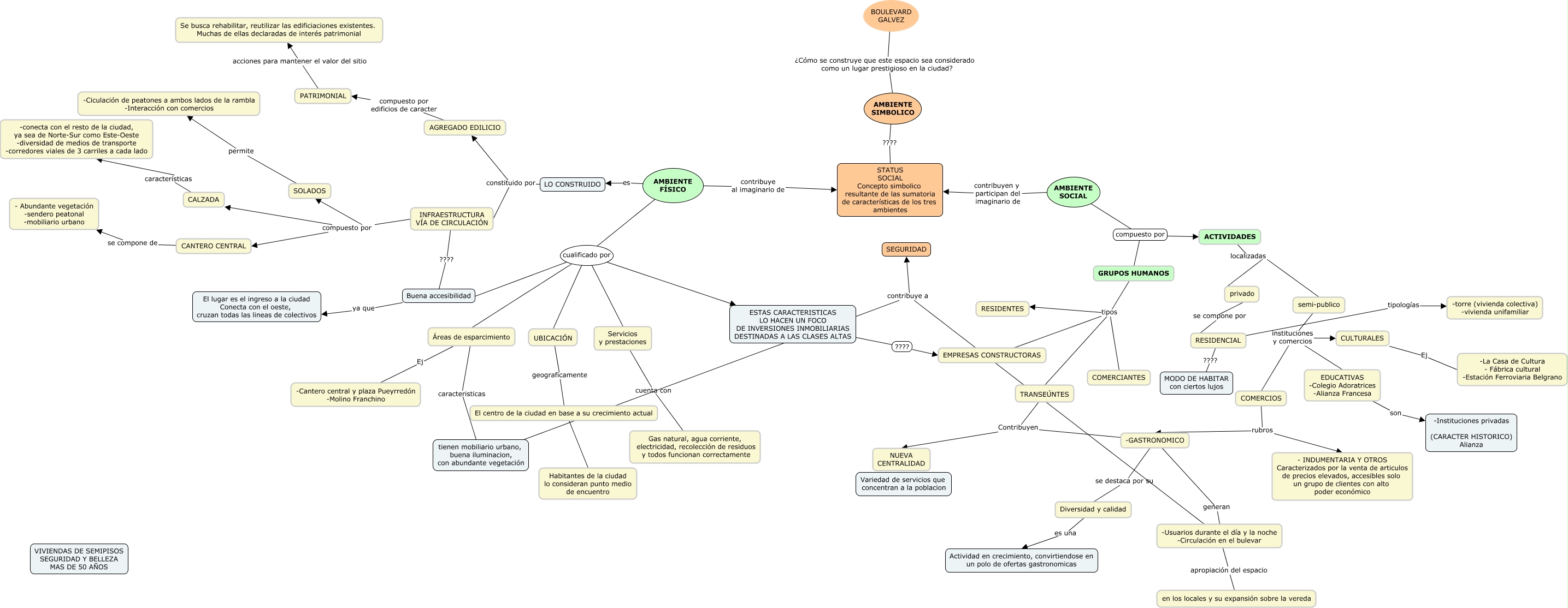 Este Cmap, tiene información relacionada con: NUEVO MAPA, CANTERO CENTRAL se compone de - Abundante vegetación -sendero peatonal -mobiliario urbano, semi-publico instituciones y comercios CULTURALES, AMBIENTE FÍSICO cualificado por UBICACIÓN, LO CONSTRUIDO constituido por INFRAESTRUCTURA VÍA DE CIRCULACIÓN, AMBIENTE FÍSICO cualificado por ESTAS CARACTERISTICAS LO HACEN UN FOCO DE INVERSIONES INMOBILIARIAS DESTINADAS A LAS CLASES ALTAS, CALZADA características -conecta con el resto de la ciudad, ya sea de Norte-Sur como Este-Oeste -diversidad de medios de transporte -corredores viales de 3 carriles a cada lado, AMBIENTE SIMBOLICO ???? STATUS SOCIAL Concepto simbolico resultante de las sumatoria de características de los tres ambientes, GRUPOS HUMANOS tipos EMPRESAS CONSTRUCTORAS, Áreas de esparcimiento Ej -Cantero central y plaza Pueyrredón -Molino Franchino, INFRAESTRUCTURA VÍA DE CIRCULACIÓN ???? Buena accesibilidad, El centro de la ciudad en base a su crecimiento actual ???? Habitantes de la ciudad lo consideran punto medio de encuentro, Servicios y prestaciones cuenta con Gas natural, agua corriente, electricidad, recolección de residuos y todos funcionan correctamente, BOULEVARD GALVEZ ¿Cómo se construye que este espacio sea considerado como un lugar prestigioso en la ciudad? AMBIENTE SIMBOLICO, LO CONSTRUIDO constituido por AGREGADO EDILICIO, privado se compone por RESIDENCIAL, COMERCIOS rubros -GASTRONOMICO, AMBIENTE FÍSICO es LO CONSTRUIDO, INFRAESTRUCTURA VÍA DE CIRCULACIÓN compuesto por SOLADOS, Áreas de esparcimiento caracteristicas tienen mobiliario urbano, buena iluminacion, con abundante vegetación, GRUPOS HUMANOS tipos COMERCIANTES