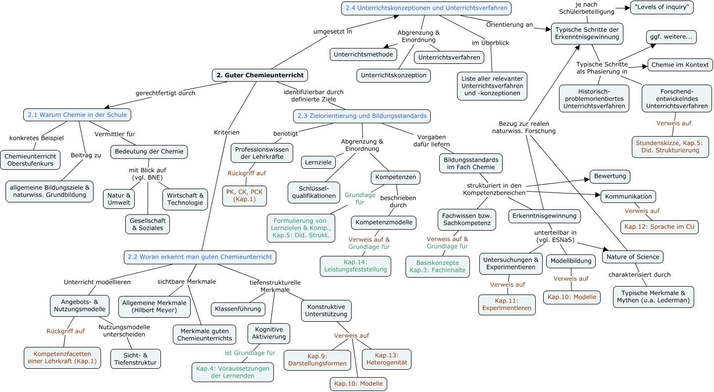 Dieses mit IHMC CmapTools erstellte CMap hat Informationen bezüglich: 2 Guter Chemieunterricht, 2.3 Zielorientierung und Bildungsstandards benötigt Professionswissen der Lehrkräfte, 2.4 Unterrichtskonzeptionen und Unterrichtsverfahren Abgrenzung & Einordnung Unterrichtskonzeption, Bildungsstandards im Fach Chemie strukturiert in den Kompetenzbereichen Kommunikation, 2.1 Warum Chemie in der Schule konkretes Beispiel Chemieunterricht Oberstufenkurs, Kompetenzmodelle Verweis auf & Grundlage für Kap.14: Leistungsfeststellung, Bildungsstandards im Fach Chemie strukturiert in den Kompetenzbereichen Erkenntnisgewinnung, Erkenntnisgewinnung unterteilbar in (vgl. ESNaS) Nature of Science, Modellbildung Verweis auf Kap.10: Modelle, 2.1 Warum Chemie in der Schule Vermittler für Bedeutung der Chemie, Bedeutung der Chemie mit Blick auf (vgl. BNE) Wirtschaft & Technologie, Kognitive Aktivierung ist Grundlage für Kap.4: Voraussetzungen der Lernenden, Bildungsstandards im Fach Chemie strukturiert in den Kompetenzbereichen Bewertung, 2.2 Woran erkennt man guten Chemieunterricht sichtbare Merkmale Allgemeine Merkmale (Hilbert Meyer), 2.4 Unterrichtskonzeptionen und Unterrichtsverfahren Abgrenzung & Einordnung Unterrichtsverfahren, Typische Schritte der Erkenntnisgewinnung Typische Schritte als Phasierung in Historisch- problemorientiertes Unterrichtsverfahren, 2.4 Unterrichtskonzeptionen und Unterrichtsverfahren Abgrenzung & Einordnung Unterrichtsmethode, 2.2 Woran erkennt man guten Chemieunterricht tiefenstrukturelle Merkmale Klassenführung, Kompetenzen Grundlage für Formulierung von Lernzielen & Komp., Kap.5: Did. Strukt., Bedeutung der Chemie mit Blick auf (vgl. BNE) Natur & Umwelt, Forschend- entwickelndes Unterrichtsverfahren Verweis auf Stundenskizze, Kap.5: Did. Strukturierung