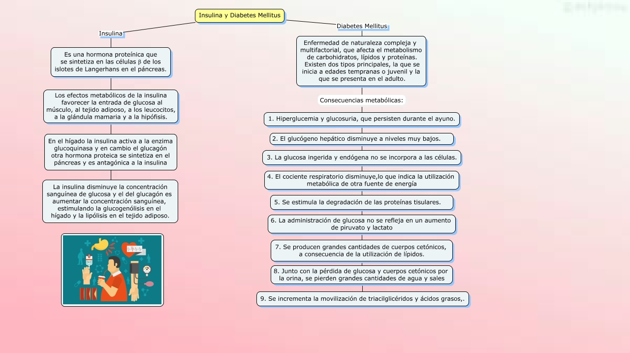 Este Cmap, tiene información relacionada con: Insulina y diabetes mapa 2, En el hígado la insulina activa a la enzima glucoquinasa y en cambio el glucagón otra hormona proteica se sintetiza en el páncreas y es antagónica a la insulina ???? La insulina disminuye la concentración sanguínea de glucosa y el del glucagón es aumentar la concentración sanguínea, estimulando la glucogenólisis en el hígado y la lipólisis en el tejido adiposo., Enfermedad de naturaleza compleja y multifactorial, que afecta el metabolismo de carbohidratos, lípidos y proteínas. Existen dos tipos principales, la que se inicia a edades tempranas o juvenil y la que se presenta en el adulto. Consecuencias metabólicas: 1. Hiperglucemia y glucosuria, que persisten durante el ayuno., Es una hormona proteínica que se sintetiza en las células β de los islotes de Langerhans en el páncreas. Los efectos metabólicos de la insulina favorecer la entrada de glucosa al músculo, al tejido adiposo, a los leucocitos, a la glándula mamaria y a la hipófisis. En el hígado la insulina activa a la enzima glucoquinasa y en cambio el glucagón otra hormona proteica se sintetiza en el páncreas y es antagónica a la insulina, 1. Hiperglucemia y glucosuria, que persisten durante el ayuno. 2. El glucógeno hepático disminuye a niveles muy bajos. 3. La glucosa ingerida y endógena no se incorpora a las células., Insulina y Diabetes Mellitus Diabetes Mellitus Enfermedad de naturaleza compleja y multifactorial, que afecta el metabolismo de carbohidratos, lípidos y proteínas. Existen dos tipos principales, la que se inicia a edades tempranas o juvenil y la que se presenta en el adulto., 5. Se estimula la degradación de las proteínas tisulares. 6. La administración de glucosa no se refleja en un aumento de piruvato y lactato 7. Se producen grandes cantidades de cuerpos cetónicos, a consecuencia de la utilización de lípidos., Insulina y Diabetes Mellitus Insulina Es una hormona proteínica que se sintetiza en las células β de los islotes de Langerhans en el páncreas., 3. La glucosa ingerida y endógena no se incorpora a las células. 4. El cociente respiratorio disminuye,lo que indica la utilización metabólica de otra fuente de energía 5. Se estimula la degradación de las proteínas tisulares., 7. Se producen grandes cantidades de cuerpos cetónicos, a consecuencia de la utilización de lípidos. 8. Junto con la pérdida de glucosa y cuerpos cetónicos por la orina, se pierden grandes cantidades de agua y sales 9. Se incrementa la movilización de triacilglicéridos y ácidos grasos,.