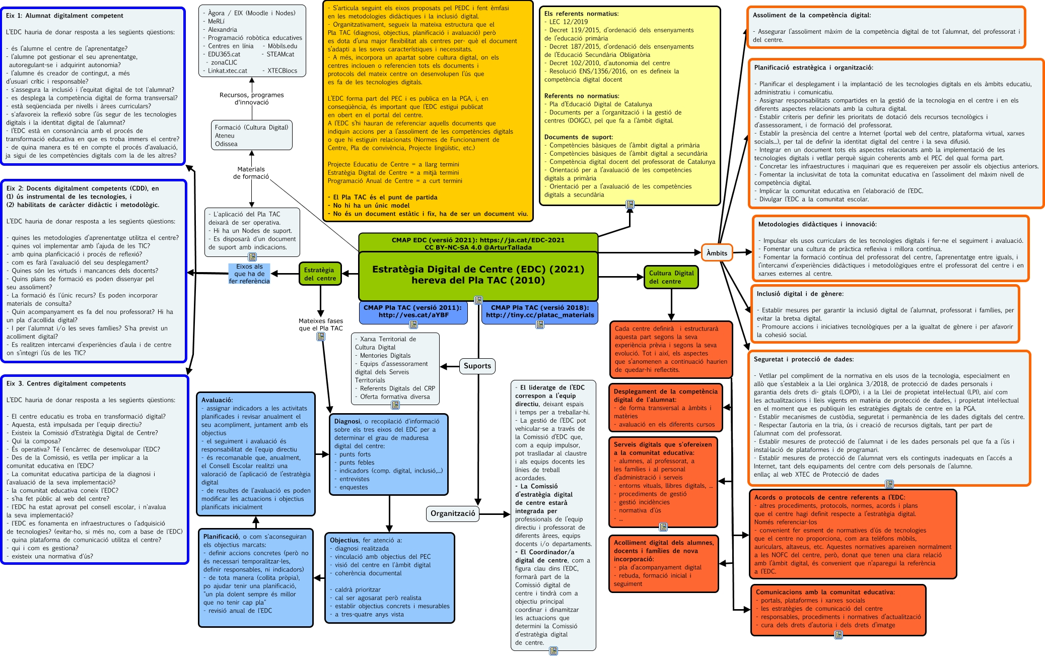 Aquest mapa conceptual conté informació relacionada amb: EDC-2021, Organització - El lideratge de l’EDC correspon a l’equip directiu, deixant espais i temps per a treballar-hi. - La gestió de l’EDC pot vehicular-se a través de la Comissió d’EDC que, com a equip impulsor, pot traslladar al claustre i als equips docents les línies de treball acordades. - La Comissió d’estratègia digital de centre estarà integrada per professionals de l’equip directiu i professorat de diferents àrees, equips docents i/o departaments. - El Coordinador/a digital de centre, com a figura clau dins l’EDC, formarà part de la Comissió digital de centre i tindrà com a objectiu principal coordinar i dinamitzar les actuacions que determini la Comissió d’estratègia digital de centre., Diagnosi, o recopilació d'informació sobre els tres eixos del EDC per a determinar el grau de maduresa digital del centre: - punts forts - punts febles - indicadors (comp. digital, inclusió,...) - entrevistes - enquestes Objectius, fer atenció a: - diagnosi realitzada - vinculació amb objectius del PEC - visió del centre en l'àmbit digital - coherència documental - caldrà prioritzar - cal ser agosarat però realista - establir objectius concrets i mesurables - a tres-quatre anys vista, Àmbits Metodologies didàctiques i innovació: - Impulsar els usos curriculars de les tecnologies digitals i fer-ne el seguiment i avaluació. - Fomentar una cultura de pràctica reflexiva i millora contínua. - Fomentar la formació contínua del professorat del centre, l’aprenentatge entre iguals, i l’intercanvi d’experiències didàctiques i metodològiques entre el professorat del centre i en xarxes externes al centre., Estratègia Digital de Centre (EDC) (2021) hereva del Pla TAC (2010) Organització, Suports - Xarxa Territorial de Cultura Digital - Mentories Digitals - Equips d’assessorament digital dels Serveis Territorials - Referents Digitals del CRP - Oferta formativa diversa, Estratègia del centre Eixos als que ha de fer referència Eix 1: Alumnat digitalment competent L’EDC hauria de donar resposta a les següents qüestions: - és l’alumne el centre de l’aprenentatge? - l’alumne pot gestionar el seu aprenentatge, autoregulant-se i adquirint autonomia? - l’alumne és creador de contingut, a més d’usuari crític i responsable? - s'assegura la inclusió i l’equitat digital de tot l'alumnat? - es desplega la competència digital de forma transversal? - està seqüenciada per nivells i àrees curriculars? - s'afavoreix la reflexió sobre l’ús segur de les tecnologies digitals i la identitat digital de l’alumnat? - l’EDC està en consonància amb el procés de transformació educativa en que es troba immers el centre? - de quina manera es té en compte el procés d'avaluació, ja sigui de les competències digitals com la de les altres?, Estratègia Digital de Centre (EDC) (2021) hereva del Pla TAC (2010) Estratègia del centre, Cada centre definirà i estructurarà aquesta part segons la seva experiència prèvia i segons la seva evolució. Tot i així, els aspectes que s’anomenen a continuació haurien de quedar-hi reflectits. Desplegament de la competència digital de l'alumnat: - de forma transversal a àmbits i matèries - avaluació en els diferents cursos, Estratègia Digital de Centre (EDC) (2021) hereva del Pla TAC (2010) Materials de formació Formació (Cultura Digital) Ateneu Odissea, Avaluació: - assignar indicadors a les activitats planificades i revisar anualment el seu acompliment, juntament amb els objectius - el seguiment i avaluació és responsabilitat de l'equip directiu - és recomanable que, anualment, el Consell Escolar realitzi una valoració de l’aplicació de l’estratègia digital - de resultes de l'avaluació es poden modificar les actuacions i objectius planificats inicialment Diagnosi, o recopilació d'informació sobre els tres eixos del EDC per a determinar el grau de maduresa digital del centre: - punts forts - punts febles - indicadors (comp. digital, inclusió,...) - entrevistes - enquestes, Cada centre definirà i estructurarà aquesta part segons la seva experiència prèvia i segons la seva evolució. Tot i així, els aspectes que s’anomenen a continuació haurien de quedar-hi reflectits. Acolliment digital dels alumnes, docents i famílies de nova incorporació: - pla d’acompanyament digital - rebuda, formació inicial i seguiment, Estratègia Digital de Centre (EDC) (2021) hereva del Pla TAC (2010) Cultura Digital del centre, Estratègia del centre Mateixes fases que el Pla TAC Diagnosi, o recopilació d'informació sobre els tres eixos del EDC per a determinar el grau de maduresa digital del centre: - punts forts - punts febles - indicadors (comp. digital, inclusió,...) - entrevistes - enquestes, Formació (Cultura Digital) Ateneu Odissea Recursos, programes d'innovació - Àgora / EIX (Moodle i Nodes) - MeRLí - Alexandria - Programació robòtica educatives - Centres en línia - Mòbils.edu - EDU365.cat - STEAMcat - zonaCLIC - Linkat.xtec.cat - XTECBlocs, Cada centre definirà i estructurarà aquesta part segons la seva experiència prèvia i segons la seva evolució. Tot i així, els aspectes que s’anomenen a continuació haurien de quedar-hi reflectits. Acords o protocols de centre referents a l’EDC: - altres procediments, protocols, normes, acords i plans que el centre hagi definit respecte a l’estratègia digital. Només referenciar-los - convenient fer esment de normatives d'ús de tecnologies que el centre no proporciona, com ara telèfons mòbils, auriculars, altaveus, etc. Aquestes normatives apareixen normalment a les NOFC del centre, però, donat que tenen una clara relació amb l’àmbit digital, és convenient que n’aparegui la referència a l’EDC., Cada centre definirà i estructurarà aquesta part segons la seva experiència prèvia i segons la seva evolució. Tot i així, els aspectes que s’anome