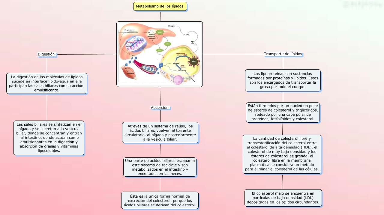 Este Cmap, tiene información relacionada con: Metabolismo de los lípidos mapa 2, Digestión La digestión de las moléculas de lípidos sucede en interface lípido-agua en ella participan las sales biliares con su acción emulsificante., Absorción Atreves de un sistema de reúso, los ácidos biliares vuelven al torrente circulatorio, al hígado y posteriormente a la vesícula biliar., La digestión de las moléculas de lípidos sucede en interface lípido-agua en ella participan las sales biliares con su acción emulsificante. = Las sales biliares se sintetizan en el hígado y se secretan a la vesícula biliar, donde se concentran y entran al intestino, donde actúan como emulsionantes en la digestión y absorción de grasas y vitaminas liposolubles., Atreves de un sistema de reúso, los ácidos biliares vuelven al torrente circulatorio, al hígado y posteriormente a la vesícula biliar. Una parte de ácidos biliares escapan a este sistema de reciclaje y son metabolizados en el intestino y excretados en las heces. Ésta es la única forma normal de excreción del colesterol, porque los ácidos biliares se derivan del colesterol., La cantidad de colesterol libre y transesterificación del colesterol entre el colesterol de alta densidad (HDL), el colesterol de muy baja densidad y los ésteres de colesterol es grande, el colesterol libre en la membrana plasmática se considera un método para eliminar el colesterol de las células. El colesterol malo se encuentra en partículas de baja densidad (LDL) depositadas en los tejidos circundantes., Metabolismo de los lípidos ????, Las lipoproteínas son sustancias formadas por proteínas y lípidos. Estos son los encargados de transportar la grasa por todo el cuerpo. Están formados por un núcleo no polar de ésteres de colesterol y triglicéridos, rodeado por una capa polar de proteínas, fosfolípidos y colesterol. La cantidad de colesterol libre y transesterificación del colesterol entre el colesterol de alta densidad (HDL), el colesterol de muy baja densidad y los ésteres de colesterol es grande, el colesterol libre en la membrana plasmática se considera un método para eliminar el colesterol de las células., Transporte de lípidos Las lipoproteínas son sustancias formadas por proteínas y lípidos. Estos son los encargados de transportar la grasa por todo el cuerpo.