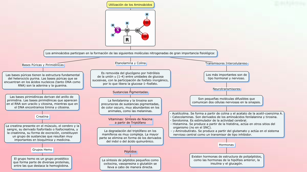Este Cmap, tiene información relacionada con: Utilización de los Aminoácidos mapa 2, Las bases púricas tienen la estructura fundamental del heterociclo purina. Las bases púricas que se encuentran en los ácidos nucleicos (tanto DNA como RNA) son la adenina y la guanina. Las bases pirimidínicas derivan del anillo de pirimidina. Las bases pirimidínicas que aparecen en el RNA son uracilo y citosina, mientras que en el DNA encontramos timina y citosina. Creatina, Hormonas ???? Existen hormonas de estructura de polipéptidos, como las hormonas de la hipófisis anterior, la insulina y el glucagón., Los aminoácidos participan en la formación de las siguientes moléculas nitrogenadas de gran importancia fisiológica: Bases Púricas y Pirimidínicas Las bases púricas tienen la estructura fundamental del heterociclo purina. Las bases púricas que se encuentran en los ácidos nucleicos (tanto DNA como RNA) son la adenina y la guanina., Los más importantes son de tipo hormonal y nervioso. Neurotransmisores Son pequeñas moléculas difusibles que comunican dos células nerviosas en la sinapsis., Los aminoácidos participan en la formación de las siguientes moléculas nitrogenadas de gran importancia fisiológica: Transmisores Intercelulareso Los más importantes son de tipo hormonal y nervioso., La fenilalanina y la tirosina son precursoras de sustancias pigmentadas, de color oscuro, muy abundantes en los animales, como las melaninas. Vitaminas: Síntesis de Niacina a partir de Triptófano La degradación del triptófano en los mamíferos es muy compleja. La mayor parte se elimina en forma de los derivados del indol o del ácido quinurénico., Los aminoácidos participan en la formación de las siguientes moléculas nitrogenadas de gran importancia fisiológica: Etanolamina y Colina Es removida del glucógeno por hidrólisis de la unión α (1-4) entre unidades de glucosa sucesivas, con la participación de fosfato inorgánico, por lo que libera la glucosa-1–fosfato., Creatina La creatina presente en el músculo, el cerebro y la sangre, su derivado fosforilado o fosfocreatina, y la creatinina, su forma de excreción, constituyen un grupo de sustancias que resultan muy importantes en bioquímica y medicina. Grupos Hemo, La degradación del triptófano en los mamíferos es muy compleja. La mayor parte se elimina en forma de los derivados del indol o del ácido quinurénico. Péptidos La síntesis de péptidos pequeños como oxitocina, vasopresina o glutatión se lleva a cabo de manera directa., Grupos Hemo ???? El grupo hemo es un grupo prostético que forma parte de diversas proteínas, entre las que destaca la hemoglobina., Son pequeñas moléculas difusibles que comunican dos células nerviosas en la sinapsis. - Acetilcolina. Se forma a partir de colina y el acetato de la acetil-coenzima A. - Catecolaminas. Son derivados de los aminoácidos fenilalanina y tirosina. - Serotonina. Es estimulador de la actividad cerebral. - Histamina. Se produce a partir de la histidina, actúa en otros sitios del organismo (no en el SNC). - γ-Aminobutirato. Se produce a partir del glutamato y actúa en el sistema nervioso central como un transmisor de tipo inhibidor. Hormonas, Utilización de los Aminoácidos Los aminoácidos participan en la formación de las siguientes moléculas nitrogenadas de gran importancia fisiológica:, Es removida del glucógeno por hidrólisis de la unión α (1-4) entre unidades de glucosa sucesivas, con la participación de fosfato inorgánico, por lo que libera la glucosa-1–fosfato. Sustancias Pigmentadas La fenilalanina y la tirosina son precursoras de sustancias pigmentadas, de color oscuro, muy abundantes en los animales, como las melaninas.