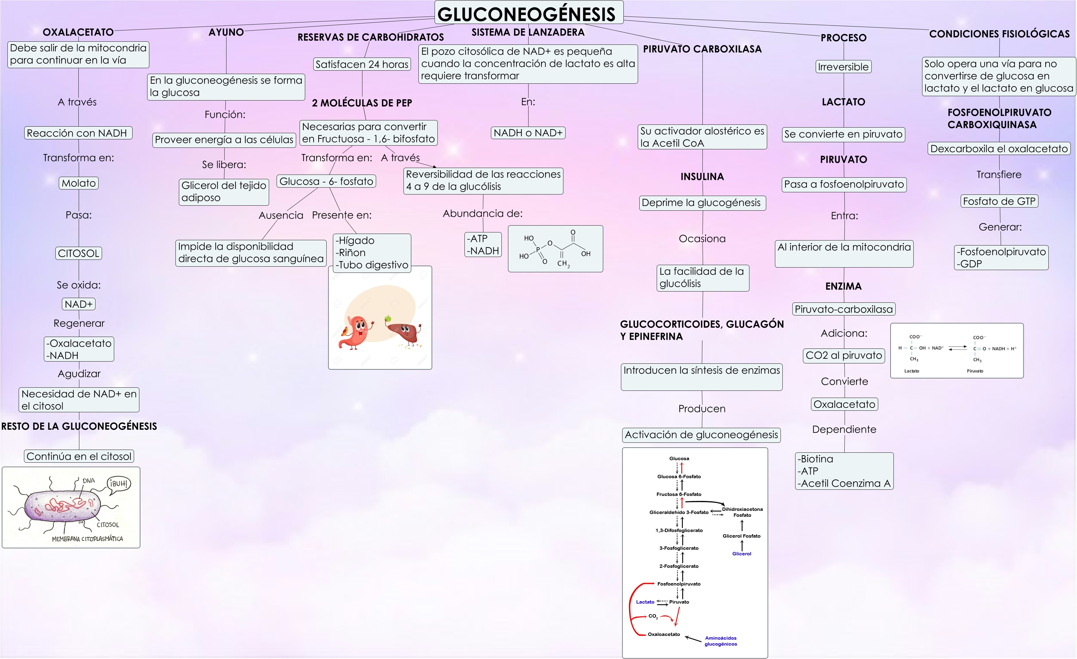 Este Cmap, tiene información relacionada con: GLUCONEOGENESIS, La facilidad de la glucólisis GLUCOCORTICOIDES, GLUCAGÓN Y EPINEFRINA Introducen la síntesis de enzimas, Proveer energía a las células Se libera: Glicerol del tejido adiposo, GLUCONEOGÉNESIS PROCESO Irreversible, Irreversible LACTATO Se convierte en piruvato, CO2 al piruvato Convierte Oxalacetato, Debe salir de la mitocondria para continuar en la vía A través Reacción con NADH, Al interior de la mitocondria ENZIMA Piruvato-carboxilasa, Introducen la síntesis de enzimas Producen Activación de gluconeogénesis, Glucosa - 6- fosfato Ausencia Impide la disponibilidad directa de glucosa sanguínea, Piruvato-carboxilasa Adiciona: CO2 al piruvato, Se convierte en piruvato PIRUVATO Pasa a fosfoenolpiruvato, Reversibilidad de las reacciones 4 a 9 de la glucólisis Abundancia de: -ATP -NADH, Satisfacen 24 horas 2 MOLÉCULAS DE PEP Necesarias para convertir en Fructuosa - 1,6- bifosfato, GLUCONEOGÉNESIS PIRUVATO CARBOXILASA Su activador alostérico es la Acetil CoA, Molato Pasa: CITOSOL, Oxalacetato Dependiente -Biotina -ATP -Acetil Coenzima A, Deprime la glucogénesis Ocasiona La facilidad de la glucólisis, CITOSOL Se oxida: NAD+, -Oxalacetato -NADH Agudizar Necesidad de NAD+ en el citosol, Solo opera una vía para no convertirse de glucosa en lactato y el lactato en glucosa FOSFOENOLPIRUVATO CARBOXIQUINASA Dexcarboxila el oxalacetato