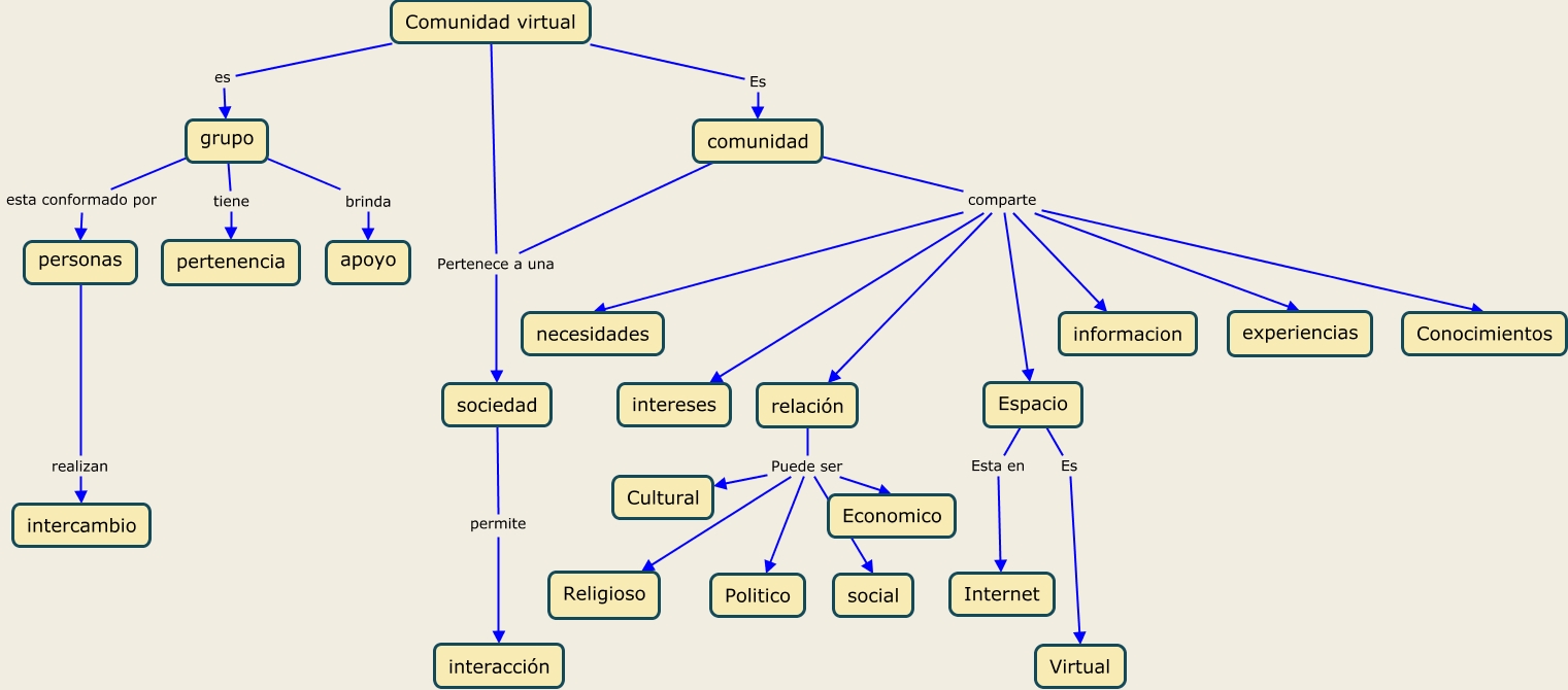 Este Cmap, tiene información relacionada con: Comunidad virtual, Espacio Es Virtual, relación Puede ser Religioso, relación Puede ser Politico, relación Puede ser Cultural, Comunidad virtual Pertenece a una sociedad, grupo esta conformado por personas, relación Puede ser social, comunidad Pertenece a una sociedad, comunidad comparte experiencias, grupo tiene pertenencia, comunidad comparte relación, Comunidad virtual Es comunidad, sociedad permite interacción, personas realizan intercambio, comunidad comparte informacion, Comunidad virtual es grupo, comunidad comparte Espacio, relación Puede ser Economico, comunidad comparte Conocimientos, Espacio Esta en Internet