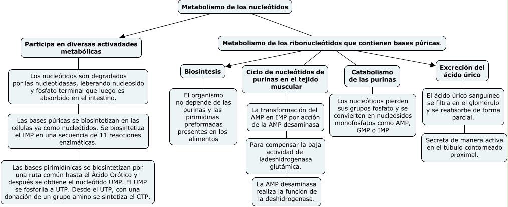 Este Cmap, tiene información relacionada con: 2, Metabolismo de los nucleótidos ???? Participa en diversas activadades metabólicas, La transformación del AMP en IMP por acción de la AMP desaminasa ???? Para compensar la baja actividad de ladeshidrogenasa glutámica., Para compensar la baja actividad de ladeshidrogenasa glutámica. ???? La AMP desaminasa realiza la función de la deshidrogenasa., Ciclo de nucleótidos de purinas en el tejido muscular ???? La transformación del AMP en IMP por acción de la AMP desaminasa, Metabolismo de los ribonucleótidos que contienen bases púricas. ???? Ciclo de nucleótidos de purinas en el tejido muscular, Metabolismo de los nucleótidos ???? Metabolismo de los ribonucleótidos que contienen bases púricas., Metabolismo de los ribonucleótidos que contienen bases púricas. ???? Biosíntesis, Excreción del ácido úrico ???? El ácido úrico sanguíneo se filtra en el glomérulo y se reabsorbe de forma parcial., El ácido úrico sanguíneo se filtra en el glomérulo y se reabsorbe de forma parcial. ???? Secreta de manera activa en el túbulo contorneado proximal., Metabolismo de los ribonucleótidos que contienen bases púricas. ???? Excreción del ácido úrico, Catabolismo de las purinas ???? Los nucleótidos pierden sus grupos fosfato y se convierten en nucleósidos monofosfatos como AMP, GMP o IMP, Los nucleótidos son degradados por las nucleotidasas, leberando nucleosido y fosfato terminal que luego es absorbido en el intestino. ???? Las bases púricas se biosintetizan en las células ya como nucleótidos. Se biosintetiza el IMP en una secuencia de 11 reacciones enzimáticas., Las bases púricas se biosintetizan en las células ya como nucleótidos. Se biosintetiza el IMP en una secuencia de 11 reacciones enzimáticas. ???? Las bases pirimidínicas se biosintetizan por una ruta común hasta el Ácido Orótico y después se obtiene el nucleótido UMP. El UMP se fosforila a UTP. Desde el UTP, con una donación de un grupo amino se sintetiza el CTP,, Biosíntesis ???? El organismo no depende de las purinas y las pirimidinas preformadas presentes en los alimentos, Participa en diversas activadades metabólicas ???? Los nucleótidos son degradados por las nucleotidasas, leberando nucleosido y fosfato terminal que luego es absorbido en el intestino., Metabolismo de los ribonucleótidos que contienen bases púricas. ???? Catabolismo de las purinas