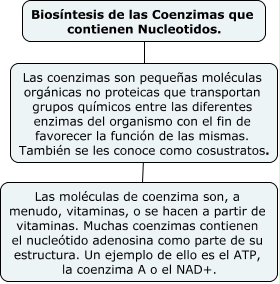 Este Cmap, tiene información relacionada con: 6, Biosíntesis de las Coenzimas que contienen Nucleotidos. ???? Las coenzimas son pequeñas moléculas orgánicas no proteicas que transportan grupos químicos entre las diferentes enzimas del organismo con el fin de favorecer la función de las mismas. También se les conoce como cosustratos., Las coenzimas son pequeñas moléculas orgánicas no proteicas que transportan grupos químicos entre las diferentes enzimas del organismo con el fin de favorecer la función de las mismas. También se les conoce como cosustratos. ???? Las moléculas de coenzima son, a menudo, vitaminas, o se hacen a partir de vitaminas. Muchas coenzimas contienen el nucleótido adenosina como parte de su estructura. Un ejemplo de ello es el ATP, la coenzima A o el NAD+.