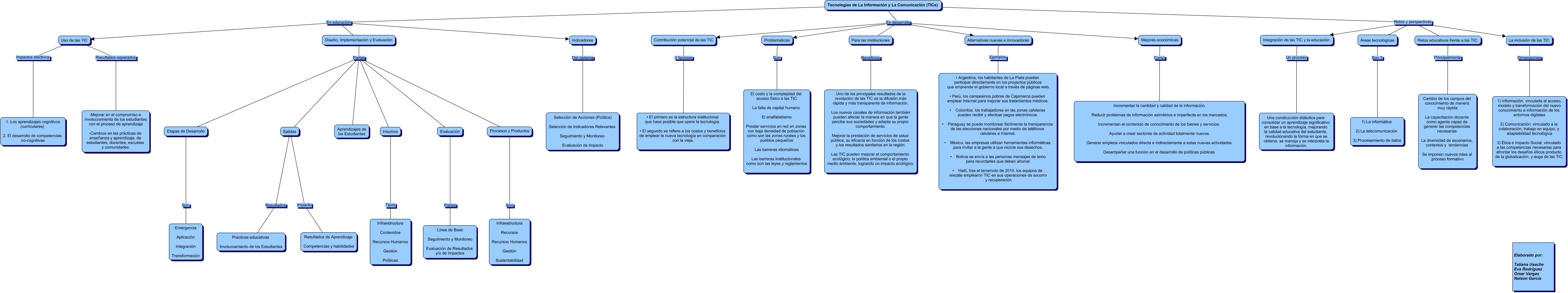 Este Cmap, tiene información relacionada con: Tecnologías de La Información y La Comunicación (TICs) 2, La inclusión de las TIC Dimensiones 1) Información, vinculada al acceso, modelo y transformación del nuevo conocimiento e información de los entornos digitales 2) Comunicación, vinculado a la colaboración, trabajo en equipo, y adaptabilidad tecnológica 3) Ética e Impacto Social, vinculado a las competencias necesarias para afrontar los desafíos éticos producto de la globalización, y auge de las TIC., Diseño, Implementación y Evaluación Partes Salidas, Tecnologías de La Información y La Comunicación (TICs) En desarrollo Mejoras económicas, Indicadores Del sistema Selección de Acciones (Política) Selección de Indicadores Relevantes Seguimiento y Monitoreo Evaluación de Impacto, Diseño, Implementación y Evaluación Partes Procesos y Productos, Problematicas Son El costo y la complejidad del acceso físico a las TIC La falta de capital humano El analfabetismo Prestar servicios en red en zonas con baja densidad de población como son las zonas rurales y los pueblos pequeños Las barreras idiomáticas Las barreras institucionales como son las leyes y reglamentos, Para las instituciones Beneficios Uno de los principales resultados de la revolución de las TIC es la difusión más rápida y más transparente de información. Los nuevos canales de información también pueden afectar la manera en que la gente percibe sus sociedades y adapta su propio comportamiento. Mejorar la prestación de servicios de salud pública, su eficacia en función de los costos y los resultados sanitarios en la región. Las TIC pueden mejorar el comportamiento ecológico, la política ambiental o el propio medio ambiente, logrando un impacto ecológico., Procesos y Productos Son Infraestructura Recursos Recursos Humanos Gestión Sustentabilidad, Diseño, Implementación y Evaluación Partes Aprendizajes de los Estudiantes, Tecnologías de La Información y La Comunicación (TICs) Retos y perspectivas Áreas tecnológicas, Etapas de Desarrollo Son Emergencia Aplicación Integración Transformación, Tecnologías de La Información y La Comunicación (TICs) En desarrollo Alternativas nuevas e innovadoras, Tecnologías de La Información y La Comunicación (TICs) En desarrollo Contribución potencial de las TIC, Integración de las TIC y la educación. Un proceso Una construcción didáctica para consolidar un aprendizaje significativo en base a la tecnología, mejorando la calidad educativa del estudiante, revolucionando la forma en que se obtiene, se maneja y se interpreta la información., Evaluación Partes Línea de Base Seguimiento y Monitoreo Evaluación de Resultados y/o de Impactos, Tecnologías de La Información y La Comunicación (TICs) Retos y perspectivas Integración de las TIC y la educación., Tecnologías de La Información y La Comunicación (TICs) En educación Uso de las TIC, Salidas Impacto Resultados de Aprendizaje Competencias y habilidades, Áreas tecnológicas Son 3 1) La informática 2) La telecomunicación 3) Procesamiento de datos, Tecnologías de La Información y La Comunicación (TICs) En educación Indicadores