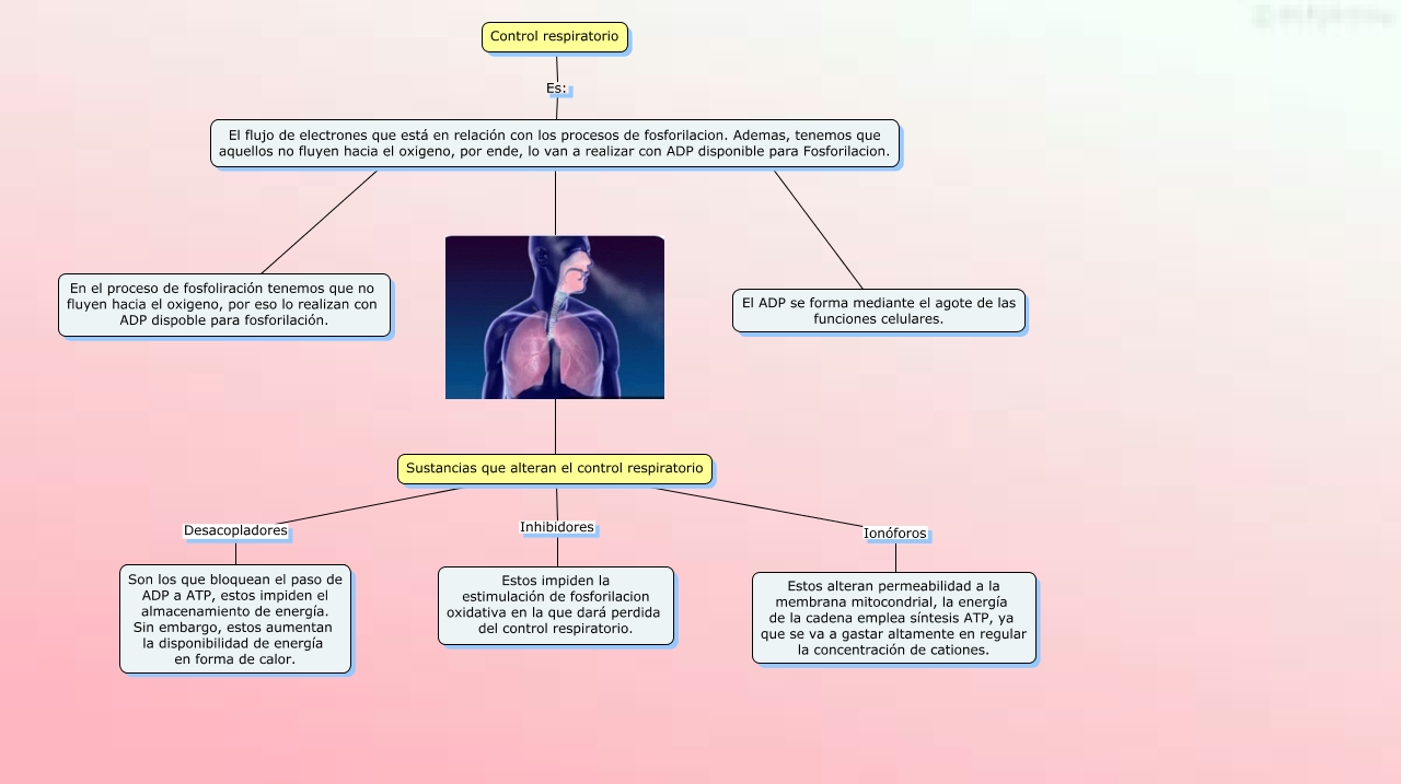 Este Cmap, tiene información relacionada con: control respiratorio, Sustancias que alteran el control respiratorio Ionóforos Estos alteran permeabilidad a la membrana mitocondrial, la energía de la cadena emplea síntesis ATP, ya que se va a gastar altamente en regular la concentración de cationes., El flujo de electrones que está en relación con los procesos de fosforilacion. Ademas, tenemos que aquellos no fluyen hacia el oxigeno, por ende, lo van a realizar con ADP disponible para Fosforilacion. Sustancias que alteran el control respiratorio, El flujo de electrones que está en relación con los procesos de fosforilacion. Ademas, tenemos que aquellos no fluyen hacia el oxigeno, por ende, lo van a realizar con ADP disponible para Fosforilacion. Sustancias que alteran el control respiratorio, El flujo de electrones que está en relación con los procesos de fosforilacion. Ademas, tenemos que aquellos no fluyen hacia el oxigeno, por ende, lo van a realizar con ADP disponible para Fosforilacion. ???? El ADP se forma mediante el agote de las funciones celulares., El flujo de electrones que está en relación con los procesos de fosforilacion. Ademas, tenemos que aquellos no fluyen hacia el oxigeno, por ende, lo van a realizar con ADP disponible para Fosforilacion. ???? En el proceso de fosfoliración tenemos que no fluyen hacia el oxigeno, por eso lo realizan con ADP dispoble para fosforilación., Control respiratorio Es: El flujo de electrones que está en relación con los procesos de fosforilacion. Ademas, tenemos que aquellos no fluyen hacia el oxigeno, por ende, lo van a realizar con ADP disponible para Fosforilacion., Sustancias que alteran el control respiratorio Inhibidores Estos impiden la estimulación de fosforilacion oxidativa en la que dará perdida del control respiratorio., Sustancias que alteran el control respiratorio Desacopladores Son los que bloquean el paso de ADP a ATP, estos impiden el almacenamiento de energía. Sin embargo, estos aumentan la disponibilidad de energía en forma de calor.