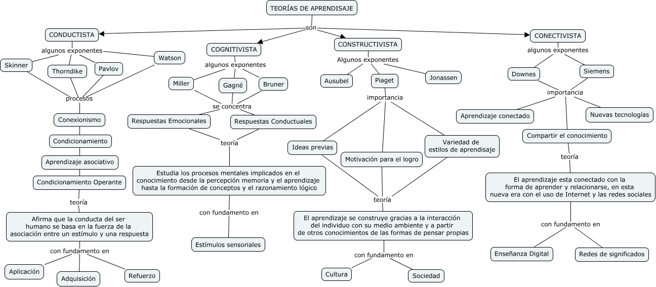 Este Cmap, tiene información relacionada con: TEORÍAS DE APRENDISAJE, CONECTIVISTA algunos exponentes Downes, Downes importancia Compartir el conocimiento, Variedad de estilos de aprendisaje teoría El aprendizaje se construye gracias a la interacción del individuo con su medio ambiente y a partir de otros conocimientos de las formas de pensar propias, TEORÍAS DE APRENDISAJE son COGNITIVISTA, Aprendizaje conectado importancia Compartir el conocimiento, Condicionamiento Operante teoría Afirma que la conducta del ser humano se basa en la fuerza de la asociación entre un estímulo y una respuesta, CONDUCTISTA algunos exponentes Pavlov, Thorndike procesos Conexionismo, Aprendizaje conectado importancia Nuevas tecnologías, El aprendizaje se construye gracias a la interacción del individuo con su medio ambiente y a partir de otros conocimientos de las formas de pensar propias con fundamento en Sociedad, CONECTIVISTA algunos exponentes Siemens, Jonassen Algunos exponentes Ausubel, Respuestas Conductuales teoría Estudia los procesos mentales implicados en el conocimiento desde la percepción memoria y el aprendizaje hasta la formación de conceptos y el razonamiento lógico, CONSTRUCTIVISTA Algunos exponentes Piaget, Miller se concentra Respuestas Conductuales, Miller algunos exponentes Bruner, Skinner algunos exponentes Thorndike, TEORÍAS DE APRENDISAJE son CONECTIVISTA, Afirma que la conducta del ser humano se basa en la fuerza de la asociación entre un estímulo y una respuesta con fundamento en Refuerzo, El aprendizaje esta conectado con la forma de aprender y relacionarse, en esta nueva era con el uso de Internet y las redes sociales con fundamento en Enseñanza Digital