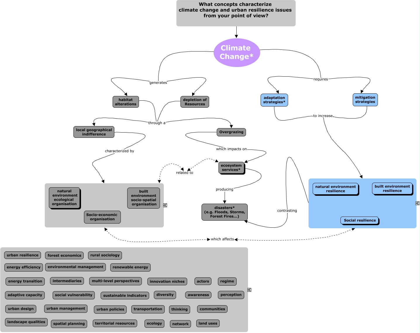 This Concept Map, created with IHMC CmapTools, has information related to: IN-CLIMATE-POCS_postC1.cmap, Climate Change* generates depletion of Resources, mitigation strategies to increase RESILIENCE*, Climate Change* requires adaptation strategies*, adaptation strategies* to increase RESILIENCE*, Climate Change* requires mitigation strategies, depletion of Resources through a local geographical indifference, Climate Change* generates habitat alterations, local geographical indifference characterized by ENVIRONMENTAL ORGANISATION, What concepts characterize climate change and urban resilience issues from your point of view? Climate Change*, RESILIENCE* contrasting disasters* (e.g. Floods, Storms, Forest Fires...), habitat alterations through a Overgrazing, depletion of Resources through a Overgrazing, habitat alterations through a local geographical indifference, ENVIRONMENTAL ORGANISATION which affects RESILIENCE*, ENVIRONMENTAL ORGANISATION related to ecosystem services*, ecosystem services* producing disasters* (e.g. Floods, Storms, Forest Fires...), Overgrazing which impacts on ecosystem services*