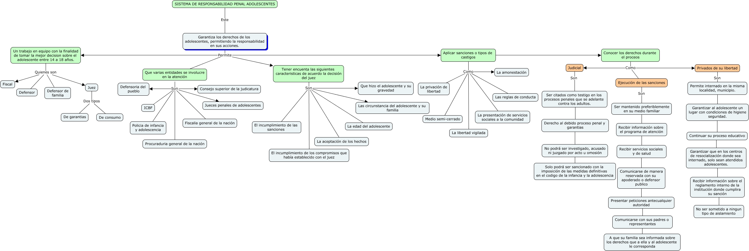 Este Cmap, tiene información relacionada con: sistema de responsabilidad penal adolescentes, Aplicar sanciones o tipos de castigos Como La presentación de servicios sociales a la comunidad, Tener encuenta las siguientes caracteristicas de acuerdo la decisión del juez Son La aceptación de los hechos, Recibir servicios sociales y de salud ???? Comunicarse de manera reservada con su apoderado o defensor publico, Aplicar sanciones o tipos de castigos Como Las reglas de conducta, Que varias entidades se involucre en la atención Son Fiscalia general de la nación, No podrá ser investigado, acusado ni juzgado por acto u omosión ???? Solo podrá ser sancionado con la imposición de las medidas definitivas en el codigo de la infancia y la adolescencia, Juez Dos tipos De consumo, Aplicar sanciones o tipos de castigos Como La privación de libertad, Recibir información sobre el reglamento interno de la institución donde cumplira su sanción ???? No ser sometido a ningun tipo de aislamiento, Ser citados como testigo en los procesos penales que se adelante contra los adultos. ???? Derecho al debido proceso penal y garantias, Ejecución de las sanciones Son Ser mantenido preferiblemente en su medio familiar, Juez Dos tipos De garantias, Conocer los derechos durante el proceos Como Judicial, Tener encuenta las siguientes caracteristicas de acuerdo la decisión del juez Son El incumplimiento de los compromisos que había establecido con el juez, Aplicar sanciones o tipos de castigos Como Medio semi-cerrado, Judicial Son Ser citados como testigo en los procesos penales que se adelante contra los adultos., Presentar peticiones antecualquier autoridad ???? Comunicarse con sus padres o representantes, Un trabajo en equipo con la finalidad de tomar la mejor decision sobre el adolescente entre 14 a 18 años. Quienes son Juez, Permite internado en la misma localidad, municipio. ???? Garantizar al adolescente un lugar con condiciones de higiene seguridad., Garantizar que en los centros de resocialización donde sea internado, solo sean atendidos adolescentes. ???? Recibir información sobre el reglamento interno de la institución donde cumplira su sanción