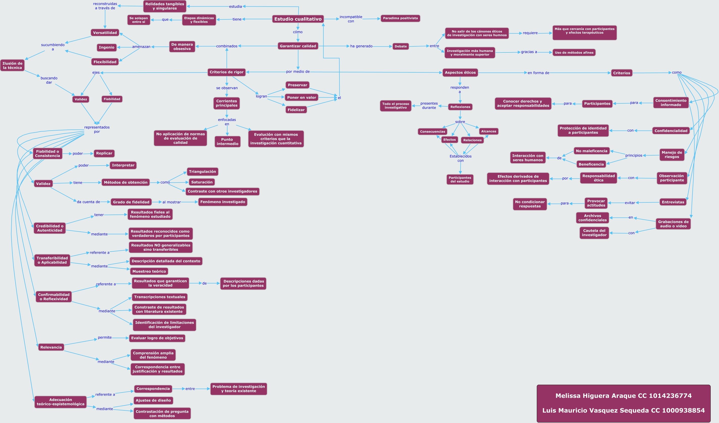 Este Cmap, tiene información relacionada con: Aplicabilidad de los criterios de rigor y éticos en la investigación cualitativa, Criterios de rigor logran Preservar, Garantizar calidad combinados De manera obsesiva, Confirmabilidad o Reflexividad mediante Constraste de resultados con literatura existente, Relaciones Establecidos con Participantes del estudio, Reflexiones presentes durante Todo el proceso investigativo, Grabaciones de audio o video con Cautela del investigador, Resultados que garanticen la veracidad de Descripciones dadas por los participantes, Fiabilidad representados por Fiabilidad o Consistencia, Manejo de riesgos principios Beneficencia, Validez poder Interpretar, Estudio cualitativo incompatible con Paradima positivista, Reflexiones sobre Consecuencias, Validez representados por Credibilidad o Autenticidad, Reflexiones sobre Alcances, De manera obsesiva amenazan Versatilidad, Corrientes principales enfocadas en No aplicación de normas de evaluación de calidad, Criterios como Manejo de riesgos, Corrientes principales enfocadas en Evalución con mismos criterios que la investigación cuantitativa, Relevancia mediante Correspondencia entre justificación y resultados, Relevancia mediante Comprensión amplia del fenómeno