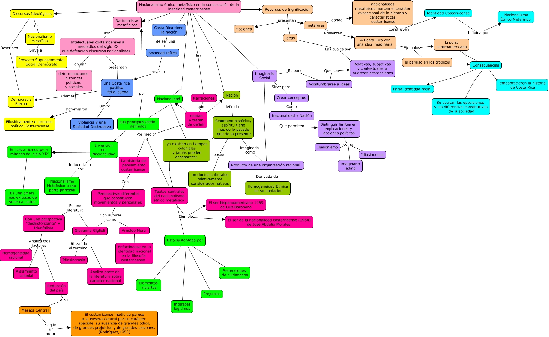 Este Cmap, tiene información relacionada con: parcial filo2.0, nacionalistas metafísicos marcan el carácter excepcional de la historia y caracteristicas costarricense construyen Identidad Costarricense, Recursos de Significación presentan metáforas, relatan y tratan de definir Nacionalidad, Nacionalismo étnico metafísico en la construcción de la identidad costarricense Nacionalidad, Distinguir límites en explicaciones y acciones políticas como Imaginario ladino, Nacionalismo étnico metafísico en la construcción de la identidad costarricense Costa Rica tiene la noción, Invención de Nacionalidad ???? En costa rica surge a mitades del siglo XIX, la suiza centroamericana Consecuencias, relatan y tratan de definir Nación, fenómeno histórico, espíritu tiene más de lo pasado que de lo presente ya existían en tiempos coloniales y jamás pueden desaparecer, Consecuencias Falsa identidad racial, relatan y tratan de definir Por medio de La historia del pensamiento costarricense, Intelectuales costarricenses a mediadios del siglo XX que defendían discursos nacionalistas presentan Una Costa rica pacífica, feliz, buena, Giovanna Giglioli Analiza parte de la literatura sobre carácter nacional, Con una perspectiva "deshistorizante" y triunfalista Analiza tres factores Reducción del país, Narraciones que relatan y tratan de definir, Nacionalidad ya existían en tiempos coloniales y jamás pueden desaparecer, Nacionalismo étnico metafísico en la construcción de la identidad costarricense Nacionalistas metafisicos, el paraíso en los trópicos Consecuencias, A Costa Rica con una idea imaginaria Ejemplos el paraíso en los trópicos