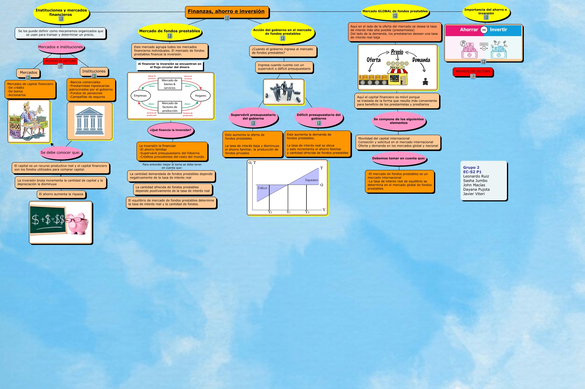 Este Cmap, tiene información relacionada con: Finanzas, Finanzas, ahorro e inversión Instituciones y mercados financieros Se los puede definir como mecanismos organizados que se usan para transar y determinar un precio., La cantidad demandada de fondos prestables depende negativamente de la tasa de interés real La cantidad ofrecida de fondos prestables depende positivamente de la tasa de interés real, Se debe conocer que:, Se los puede definir como mecanismos organizados que se usan para transar y determinar un precio. Mercados e instituciones ARCHIVO DE LECTURA, Finanzas, ahorro e inversión Mercado GLOBAL de fondos prestables Aquí en el lado de la oferta del mercado se desea la tasa de interés más alta posible (prestamistas) Del lado de la demanda, los prestatarios desean una tasa de interés real baja, Se debe conocer que: El ahorro aumenta la riqueza, Se debe conocer que: La inversión bruta incrementa la cantidad de capital y la depreciación la disminuye, La inversión la financian -El ahorro familiar -Supervávit presupuestario del fobierno -Créditos procedentes del resto del mundo Para entender mejor el tema se debe tener en cuenta que: La cantidad demandada de fondos prestables depende negativamente de la tasa de interés real, La cantidad ofrecida de fondos prestables depende positivamente de la tasa de interés real El equilibrio de mercado de fondos prestables determina la tasa de interés real y la cantidad de fondos., Aquí el capital financiero es móvil porque se traslada de la forma que resulte más conveniente para beneficio de los prestamistas y presttarios Se compone de los siguientes elementos Movilidad del capital internacional Conseción y solicitud en el mercado internacional Oferta y demanda en los mercados global y nacional, Se los puede definir como mecanismos organizados que se usan para transar y determinar un precio. Mercados e instituciones Mercados, ¿Qué financia la inversión? ???? La inversión la financian -El ahorro familiar -Supervávit presupuestario del fobierno -Créditos procedentes del resto del mundo, Movilidad del capital internacional Conseción y solicitud en el mercado internacional Oferta y demanda en los mercados global y nacional Debemos tomar en cuenta que: -El mercado de fondos prestables es un mercado internacional -La tasa de interes real de equilibrio se determina en el mercado global de fondos prestables, Se debe conocer que: El capital es un recurso productivo real y el capital financiero son los fondos utilizados para comprar capital., Se los puede definir como mecanismos organizados que se usan para transar y determinar un precio. Mercados e instituciones Instituciones, Finanzas, ahorro e inversión Acción del gobierno en el mercado de fondos prestables ¿Cuando el gobierno ingresa al mercado de fondos prestables?, Finanzas, ahorro e inversión Acción del gobierno en el mercado de fondos prestables Ingresa cuando cuenta con un supervávit o déficit presupuestario, Aquí en el lado de la oferta del mercado se desea la tasa de interés más alta posible (prestamistas) Del lado de la demanda, los prestatarios desean una tasa de interés real baja ???? Aquí el capital financiero es móvil porque se traslada de la forma que resulte más conveniente para beneficio de los prestamistas y presttarios, Este mercado agrupa todos los mercados financieros individuales. El mercado de fondos prestables financia la inversión. Al financiar la inversión se encuentran en el flujo circular del dinero, Finanzas, ahorro e inversión Mercado de fondos prestables Este mercado agrupa todos los mercados financieros individuales. El mercado de fondos prestables financia la inversión.