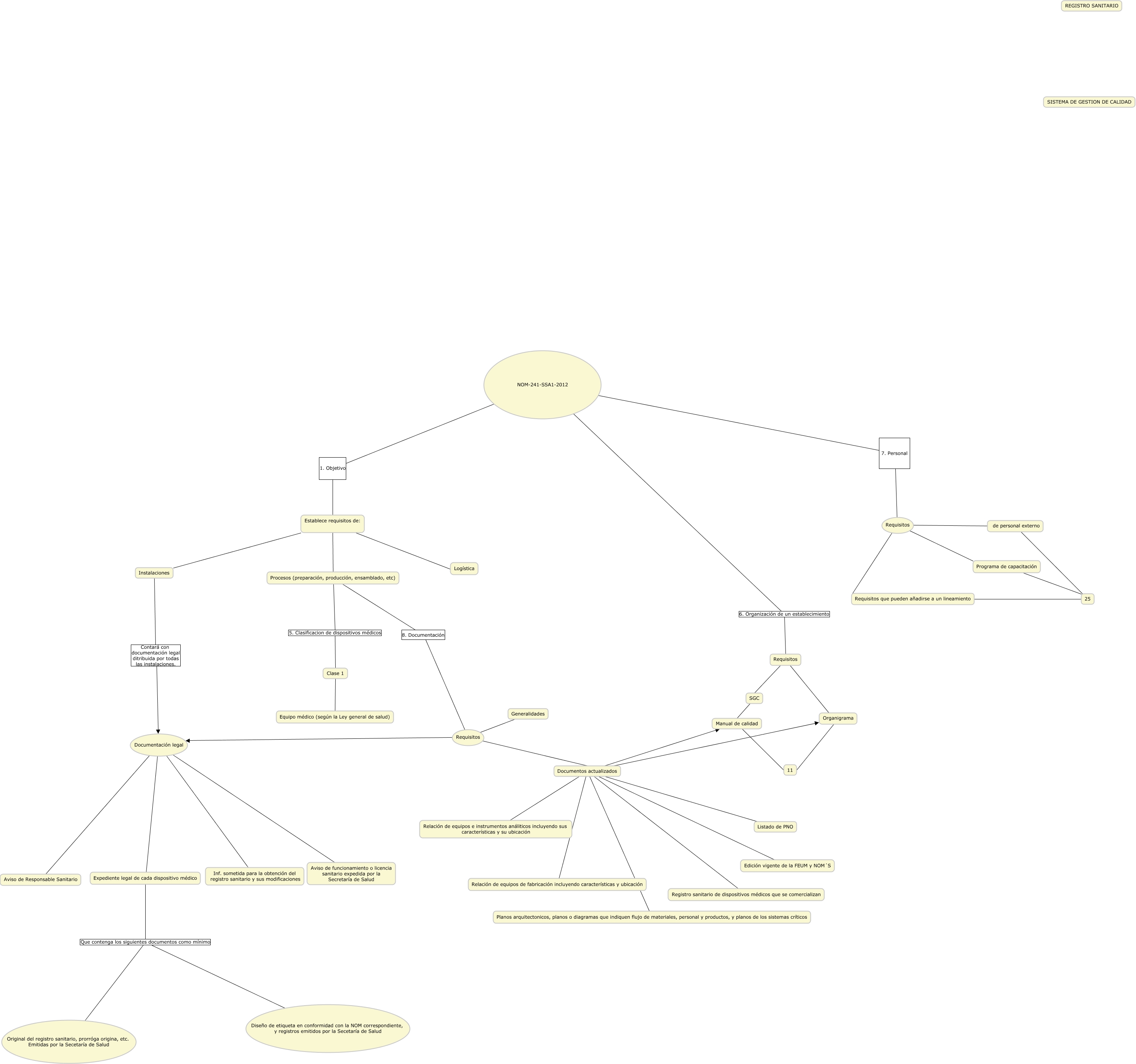 Este Cmap, tiene información relacionada con: DRAFT, Clase 1 Equipo médico (según la Ley general de salud), Documentación legal Aviso de Responsable Sanitario, NOM-241-SSA1-2012 6. Organización de un establecimiento Requisitos, Requisitos Documentación legal, Establece requisitos de: Logística, Requisitos Organigrama, Documentos actualizados Planos arquitectonicos, planos o diagramas que indiquen flujo de materiales, personal y productos, y planos de los sistemas críticos, Requisitos que pueden añadirse a un lineamiento 25, Documentos actualizados Organigrama, Expediente legal de cada dispositivo médico Que contenga los siguientes documentos como mínimo Diseño de etiqueta en conformidad con la NOM correspondiente, y registros emitidos por la Secetaría de Salud, Procesos (preparación, producción, ensamblado, etc) 8. Documentación Requisitos, Requisitos de personal externo, Manual de calidad 11, Requisitos Generalidades, Documentación legal Inf. sometida para la obtención del registro sanitario y sus modificaciones, Organigrama 11, Requisitos SGC, SGC Manual de calidad, Requisitos Programa de capacitación, NOM-241-SSA1-2012 7. Personal Requisitos