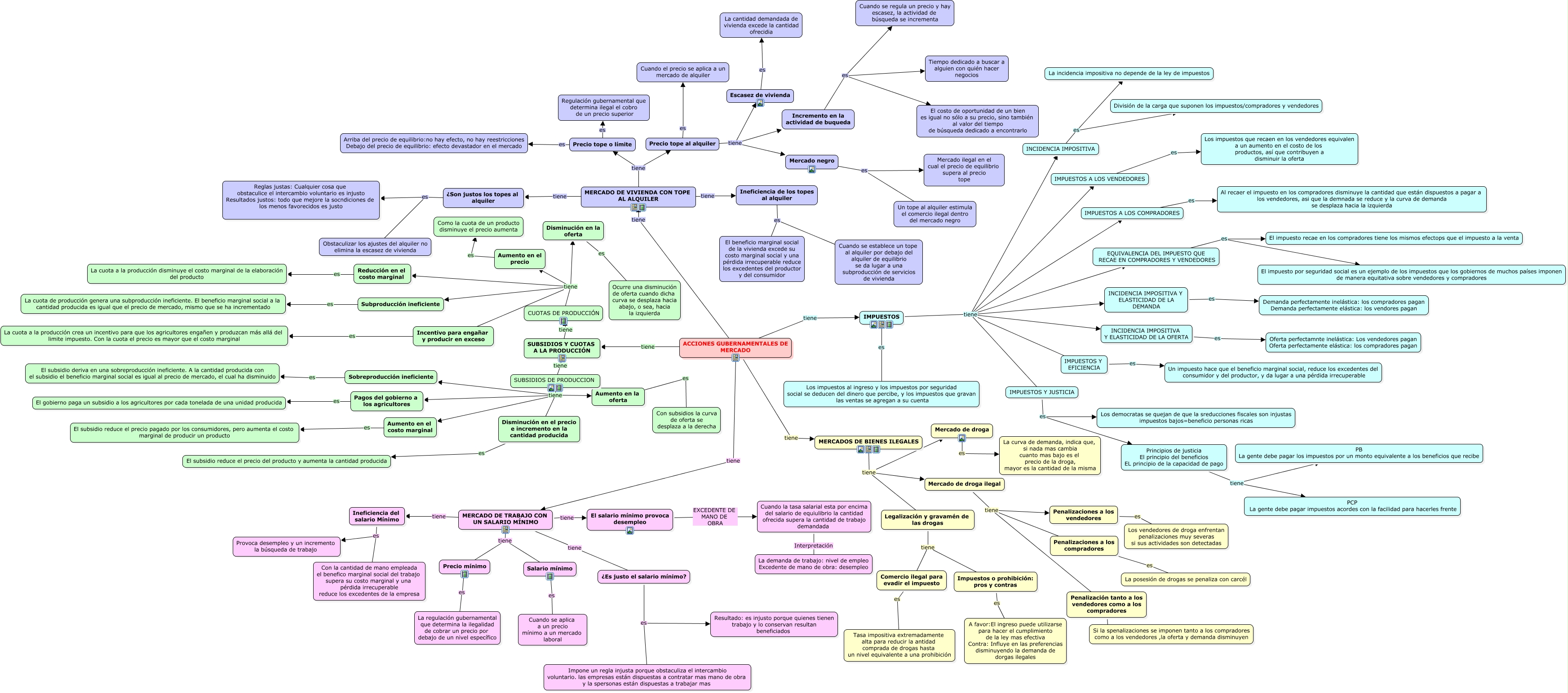 Este Cmap, tiene información relacionada con: TRABAJO GRUPAL 2-ACCIONES GUBERNAMENTALES DE MERCADO, ACCIONES GUBERNAMENTALES DE MERCADO tiene IMPUESTOS, Penalización tanto a los vendedores como a los compradores es Si la spenalizaciones se imponen tanto a los compradores como a los vendedores ,la oferta y demanda disminuyen, Aumento en la oferta es Con subsidios la curva de oferta se desplaza a la derecha, SUBSIDIOS Y CUOTAS A LA PRODUCCIÓN tiene SUBSIDIOS DE PRODUCCION, Precio mínimo es La regulación gubernamental que determina la ilegalidad de cobrar un precio por debajo de un nivel específico, IMPUESTOS tiene IMPUESTOS A LOS VENDEDORES, Ineficiencia del salario Mínimo es Con la cantidad de mano empleada el benefico marginal social del trabajo supera su costo marginal y una pérdida irrecuperable reduce los excedentes de la empresa, INCIDENCIA IMPOSITIVA Y ELASTICIDAD DE LA DEMANDA es Demanda perfectamente inelástica: los compradores pagan Demanda perfectamente elástica: los vendores pagan, CUOTAS DE PRODUCCIÓN tiene Incentivo para engañar y producir en exceso, CUOTAS DE PRODUCCIÓN tiene Subproducción ineficiente, SUBSIDIOS Y CUOTAS A LA PRODUCCIÓN tiene CUOTAS DE PRODUCCIÓN, Comercio ilegal para evadir el impuesto es Tasa impositiva extremadamente alta para reducir la antidad comprada de drogas hasta un nivel equivalente a una prohibición, IMPUESTOS es Los impuestos al ingreso y los impuestos por seguridad social se deducen del dinero que percibe, y los impuestos que gravan las ventas se agregan a su cuenta, IMPUESTOS Y JUSTICIA es Los democratas se quejan de que la sreducciones fiscales son injustas impuestos bajos=beneficio personas ricas, Salario mínimo es Cuando se aplica a un precio mínimo a un mercado laboral, Mercado negro es Un tope al alquiler estimula el comercio ilegal dentro del mercado negro, Mercado de droga ilegal tiene Penalizaciones a los vendedores, Disminución en la oferta es Ocurre una disminución de oferta cuando dicha curva se desplaza hacia abajo, o sea, hacia la izquierda, IMPUESTOS Y JUSTICIA es Principios de justicia El principio del beneficios EL principio de la capacidad de pago, MERCADO DE TRABAJO CON UN SALARIO M�?NIMO tiene Precio mínimo