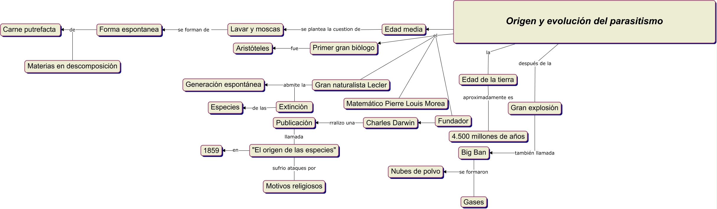 Este Cmap, tiene información relacionada con: Origen y evolucion del parasitismo, Big Ban se formaron Nubes de polvo, Origen y evolución del parasitismo el Matemático Pierre Louis Morea, Charles Darwin rralizo una Publicación, Forma espontanea de Materias en descomposición, Primer gran biólogo fue Aristóteles, Edad de la tierra aproximadamente es 4.500 millones de años, Origen y evolución del parasitismo después de la Gran explosión, Origen y evolución del parasitismo la Edad de la tierra, "El origen de las especies" sufrio ataques por Motivos religiosos, Origen y evolución del parasitismo el Fundador, Origen y evolución del parasitismo ???? Edad media, "El origen de las especies" en 1859, Edad media se plantea la cuestion de Lavar y moscas, Publicación llamada "El origen de las especies", Gran naturalista Lecler abmite la Extinción, Lavar y moscas se forman de Forma espontanea, Fundador ???? Charles Darwin, Origen y evolución del parasitismo el Primer gran biólogo, Extinción de las Especies, Origen y evolución del parasitismo el Gran naturalista Lecler