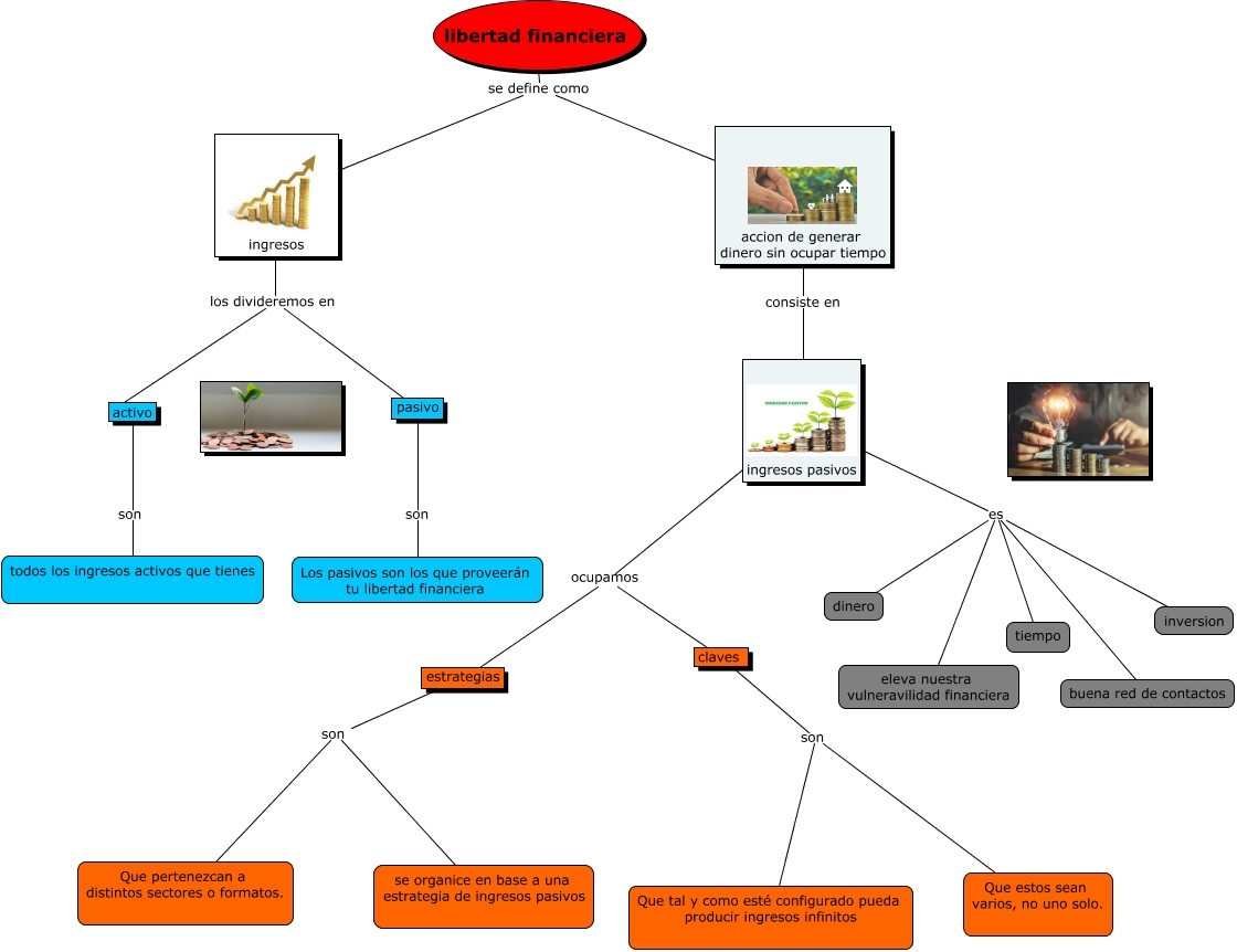 Este Cmap, tiene información relacionada con: Libertad financiera, libertad financiera se define como accion de generar dinero sin ocupar tiempo, ingresos pasivos ocupamos estrategias, ingresos pasivos es dinero, ingresos pasivos ocupamos claves, ingresos pasivos es inversion, ingresos pasivos es eleva nuestra vulneravilidad financiera, ingresos pasivos es buena red de contactos, libertad financiera se define como ingresos, claves son Que tal y como esté configurado pueda producir ingresos infinitos, ingresos los divideremos en activo, claves son Que estos sean varios, no uno solo., ingresos los divideremos en pasivo, estrategias son se organice en base a una estrategia de ingresos pasivos, pasivo son Los pasivos son los que proveerán tu libertad financiera, activo son todos los ingresos activos que tienes, ingresos pasivos es tiempo, accion de generar dinero sin ocupar tiempo consiste en ingresos pasivos, estrategias son Que pertenezcan a distintos sectores o formatos.