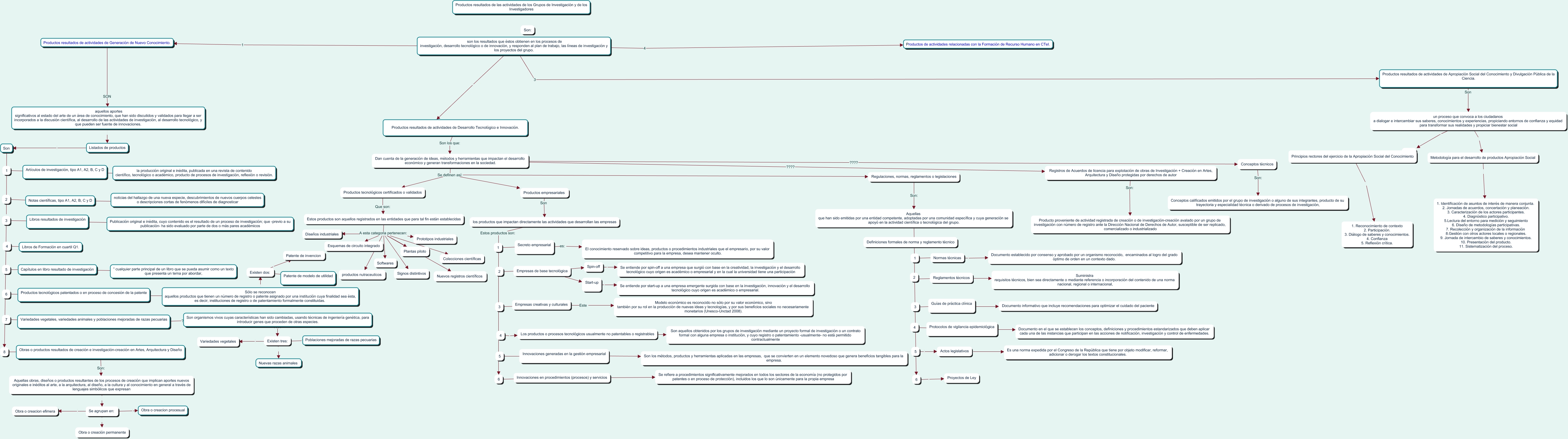 Este Cmap, tiene información relacionada con: PRODUCTOS, Guías de práctica clínica Documento informativo que incluye recomendaciones para optimizar el cuidado del paciente, Existen tres: ???? Poblaciones mejoradas de razas pecuarias, Reglamentos técnicos 6, Estos productos son aquellos registrados en las entidades que para tal fin están establecidas A esta categoria pertenecen: Signos distintivos, 1 ???? Artículos de investigación, tipo A1, A2, B, C y D, Estos productos son aquellos registrados en las entidades que para tal fin están establecidas A esta categoria pertenecen: productos nutraceuticos, Productos resultados de actividades de Generación de Nuevo Conocimiento. SON aquellos aportes significativos al estado del arte de un área de conocimiento, que han sido discutidos y validados para llegar a ser incorporados a la discusión científica, al desarrollo de las actividades de investigación, al desarrollo tecnológico, y que pueden ser fuente de innovaciones., 3 ???? Guías de práctica clínica, Innovaciones en procedimientos (procesos) y servicios ???? Se refiere a procedimientos significativamente mejorados en todos los sectores de la economía (no protegidos por patentes o en proceso de protección), incluidos los que lo son únicamente para la propia empresa, son los resultados que éstos obtienen en los procesos de investigación, desarrollo tecnológico o de innovación, y responden al plan de trabajo, las líneas de investigación y los proyectos del grupo. 4 Productos de actividades relacionadas con la Formación de Recurso Humano en CTeI., un proceso que convoca a los ciudadanos a dialogar e intercambiar sus saberes, conocimientos y experiencias, propiciando entornos de confianza y equidad para transformar sus realidades y propiciar bienestar social ????, Protocolos de vigilancia epidemiológica Documento en el que se establecen los conceptos, definiciones y procedimientos estandarizados que deben aplicar cada una de las instancias que participan en las acciones de notificación, investigación y control de enfermedades., 4 ???? Protocolos de vigilancia epidemiológica, Estos productos son aquellos registrados en las entidades que para tal fin están establecidas A esta categoria pertenecen: Nuevos registros científicos, Existen tres: Variedades vegetales, Reglamentos técnicos Suministra requisitos técnicos, bien sea directamente o mediante referencia o incorporación del contenido de una norma nacional, regional o internacional,, Libros resultados de investigación ???? Publicación original e inédita, cuyo contenido es el resultado de un proceso de investigación; que -previo a su publicación- ha sido evaluado por parte de dos o más pares académicos, son los resultados que éstos obtienen en los procesos de investigación, desarrollo tecnológico o de innovación, y responden al plan de trabajo, las líneas de investigación y los proyectos del grupo. ????, 2 ???? Notas científicas, tipo A1, A2, B, C y D, un proceso que convoca a los ciudadanos a dialogar e intercambiar sus saberes, conocimientos y experiencias, propiciando entornos de confianza y equidad para transformar sus realidades y propiciar bienestar social Metodología para el desarrollo de productos Apropiación Social