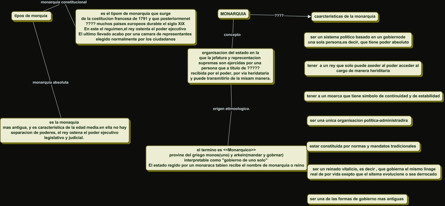 Este Cmap, tiene información relacionada con: la monarquia, MONARQUIA ???? caarcteristicas de la monarquia, MONARQUIA concepto organisacion del estado en la que la jefatura y reprecentacion supremas son ejercidas por una persona que a titulo de ????? recibida por el poder, por via heridataria y puede transmitirlo de la misam manera., organisacion del estado en la que la jefatura y reprecentacion supremas son ejercidas por una persona que a titulo de ????? recibida por el poder, por via heridataria y puede transmitirlo de la misam manera. origen etimoologico. el termino es <<Monarquico>> provine del griego monos(uno) y arkein(mandar y gobrnar) interpretable como "gobierno de uno solo" El estado regido por un monaraca tabien recibe el nombre de monarquia o reino, tipos de morquia monarquia constitucional es el tipom de monarquia que surge de la costitucion francesa de 1791 y que posteriormenet ???? muchos paises europeos durabte el siglo XIX En este el reguimen,el rey ostenta el poder ejecutivo El ultimo llevado acabo por una camara de representantes elegido normalmente por los ciudadanos, tipos de morquia monarquia absoluta es la monaquia mas antigua, y es caracteristica de la edad media.en ella no hay separacion de poderes, el rey ostena el poder ejecutivo legislativo y judicial.