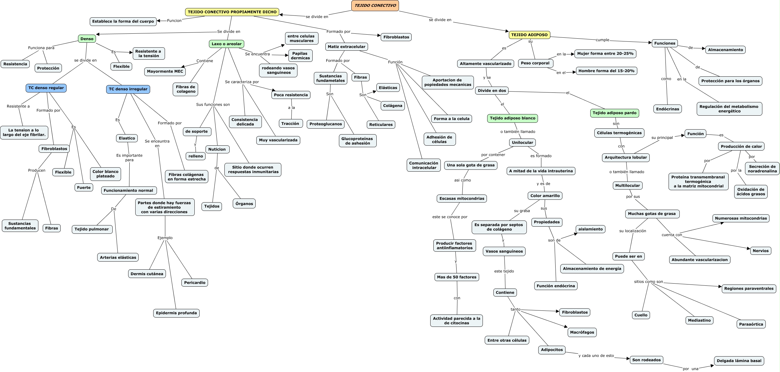 Este Cmap, tiene información relacionada con: mapa tejido c y a, TC denso regular Es Color blanco plateado, Laxo o areolar Se encuentra entre celulas musculares, Muchas gotas de grasa su localización Puede ser en, Funciones de Protección para los órganos, Denso Funciona para Protección, Denso Es Resistente a la tensión, A mitad de la vida intrauterina y es de Color amarillo, Arquitectura lobular su principal Función, Sustancias fundametales Son Glucoproteínas de ashesión, Propiedades son de aislamiento, Puede ser en sitios como son Mediastino, Funcionamiento normal De Arterias elásticas, Una sola gota de grasa asi como Escasas mitocondrias, TEJIDO CONECTIVO PROPIAMENTE DICHO Se divide en Denso, Multilocular por sus Muchas gotas de grasa, TC denso regular Es Fuerte, TEJIDO CONECTIVO PROPIAMENTE DICHO Formado por Fibroblastos, Tejido adiposo pardo son Células termogénicas, Son rodeados por una Delgada lámina basal, Propiedades son de Función endócrina