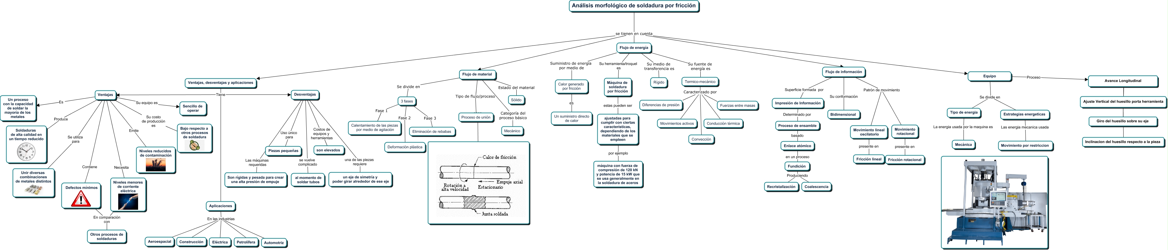 Este Cmap, tiene información relacionada con: Oficial soldadura por friccion, Análisis morfológico de soldadura por fricción se tienen en cuenta Flujo de información, Avance Longitudinal ???? Ajuste Vertical del huesillo porta herramienta, Desventajas Costos de equipos y herramientas son elevados, Flujo de información Su conformación Bidimensional, Flujo de material Se divide en 3 fases, Equipo Se divide en Tipo de energia, Proceso de ensamble basado Enlace atómico, Aplicaciones En las industrias Petrolífera, Impresión de Información Determinado por Proceso de ensamble, Desventajas una de las piezas requiere un eje de simetría y poder girar alrededor de ese eje, Aplicaciones En las industrias Aeroespacial, Ajuste Vertical del huesillo porta herramienta ???? Inclinacion del huesillo respecto a la pieza, Termico-mecánico Caracterizado por Convección, 3 fases Fase 3 Eliminación de rebabas, Avance Longitudinal ???? Ajuste Vertical del huesillo porta herramienta, Aplicaciones En las industrias Eléctrica, Flujo de material Tipo de flujo/proceso Proceso de unión, Ventajas Produce Soldaduras de alta calidad en un tiempo reducido, 3 fases Fase 1 Calentamiento de las piezas por medio de agitación, Ventajas Su costo de producción es Bajo respecto a otros procesos de soldadura