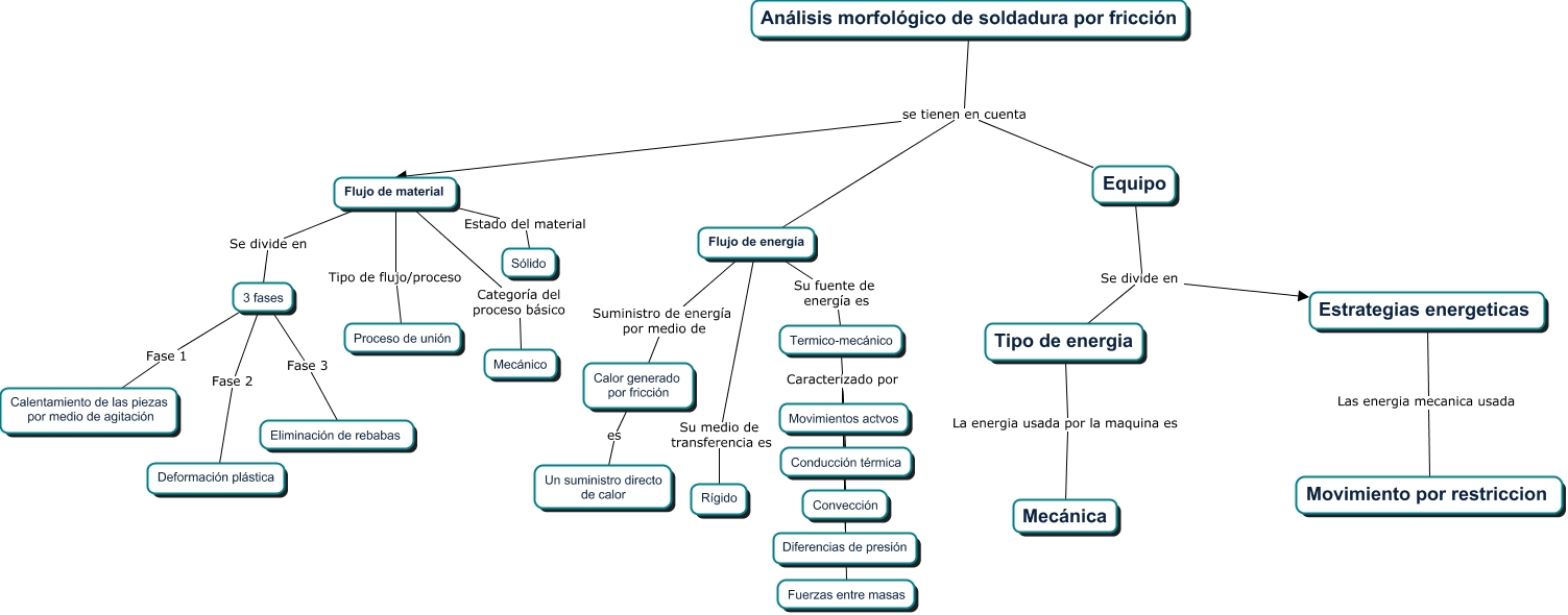 Este Cmap, tiene información relacionada con: Soldadura, Flujo de material Categoría del proceso básico Mecánico, Flujo de material Estado del material Sólido, 3 fases Fase 1 Calentamiento de las piezas por medio de agitación, Análisis morfológico de soldadura por fricción se tienen en cuenta Equipo, Análisis morfológico de soldadura por fricción se tienen en cuenta Flujo de material, 3 fases Fase 2 Deformación plástica, Termico-mecánico Caracterizado por Fuerzas entre masas, Equipo Se divide en Estrategias energeticas, Termico-mecánico Caracterizado por Conducción térmica, Calor generado por fricción es Un suministro directo de calor, Tipo de energia La energia usada por la maquina es Mecánica, Análisis morfológico de soldadura por fricción se tienen en cuenta Flujo de energía, Termico-mecánico Caracterizado por Diferencias de presión, Termico-mecánico Caracterizado por Movimientos actvos, 3 fases Fase 3 Eliminación de rebabas, Flujo de material Tipo de flujo/proceso Proceso de unión, Equipo Se divide en Tipo de energia, Flujo de energía Suministro de energía por medio de Calor generado por fricción, Termico-mecánico Caracterizado por Convección, Flujo de material Se divide en 3 fases
