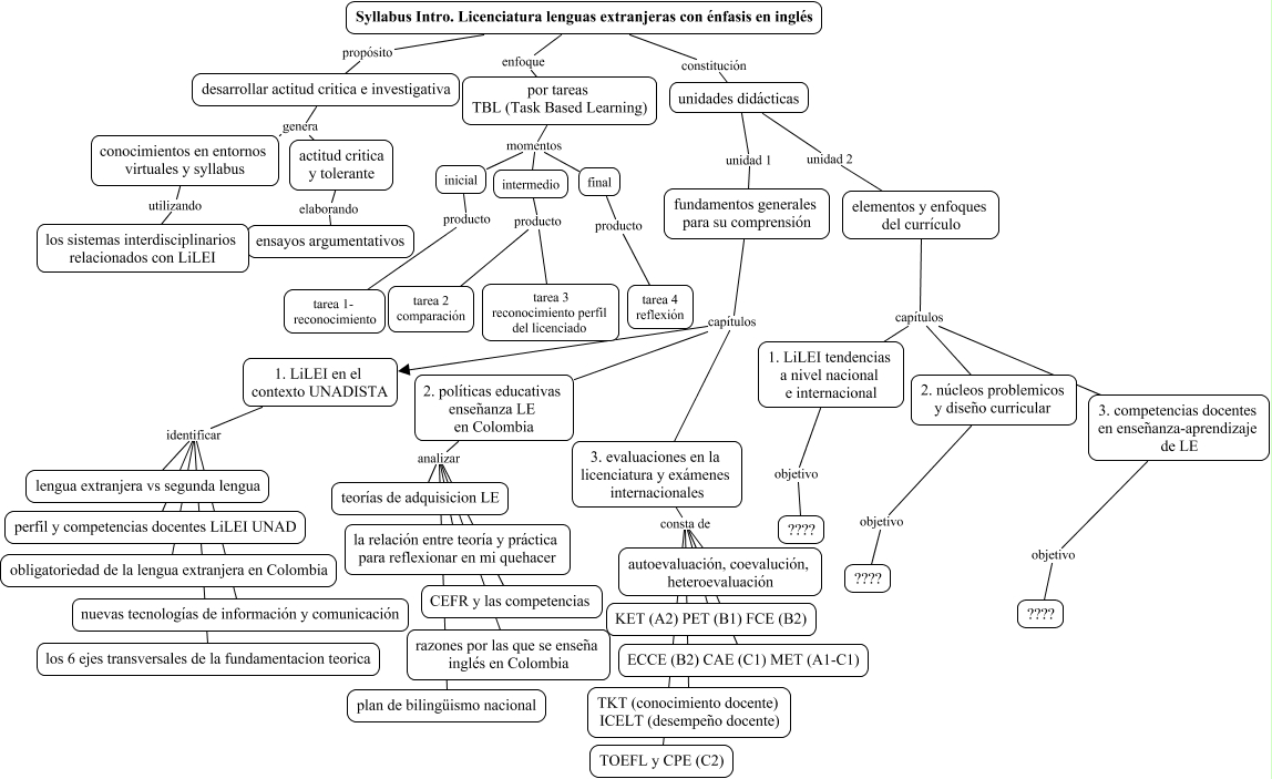 Este Cmap, tiene información relacionada con: Intro. LiLEI prueba 1, fundamentos generales para su comprensión capítulos 3. evaluaciones en la licenciatura y exámenes internacionales, desarrollar actitud critica e investigativa genera actitud critica y tolerante, elementos y enfoques del currículo capítulos 3. competencias docentes en enseñanza-aprendizaje de LE, 2. políticas educativas enseñanza LE en Colombia analizar la relación entre teoría y práctica para reflexionar en mi quehacer, 2. políticas educativas enseñanza LE en Colombia analizar razones por las que se enseña inglés en Colombia, 3. evaluaciones en la licenciatura y exámenes internacionales consta de KET (A2) PET (B1) FCE (B2), por tareas TBL (Task Based Learning) momentos final, Syllabus Intro. Licenciatura lenguas extranjeras con énfasis en inglés propósito desarrollar actitud critica e investigativa, unidades didácticas unidad 1 fundamentos generales para su comprensión, intermedio producto tarea 2 comparación, 2. políticas educativas enseñanza LE en Colombia analizar teorías de adquisicion LE, fundamentos generales para su comprensión capítulos 1. LiLEI en el contexto UNADISTA, 1. LiLEI en el contexto UNADISTA identificar lengua extranjera vs segunda lengua, 2. políticas educativas enseñanza LE en Colombia analizar plan de bilingüismo nacional, 3. evaluaciones en la licenciatura y exámenes internacionales consta de autoevaluación, coevalución, heteroevaluación, 3. competencias docentes en enseñanza-aprendizaje de LE objetivo ????, por tareas TBL (Task Based Learning) momentos inicial, intermedio producto tarea 3 reconocimiento perfil del licenciado, final producto tarea 4 reflexión, Syllabus Intro. Licenciatura lenguas extranjeras con énfasis en inglés constitución unidades didácticas