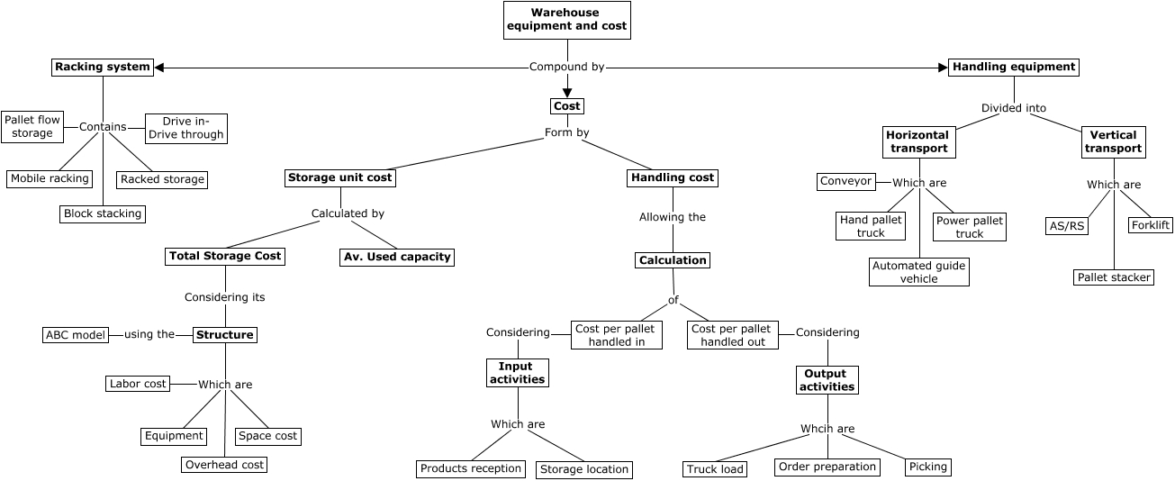 This Concept Map, created with IHMC CmapTools, has information related to: Chapter 2, Cost per pallet handled out Considering Output activities, Horizontal transport Which are Automated guide vehicle, Vertical transport Which are AS/RS, Handling cost Allowing the Calculation, Cost Form by Handling cost, Total Storage Cost Considering its Structure, Structure Which are Space cost, Calculation of Cost per pallet handled in, Storage unit cost Calculated by Total Storage Cost, Racking system Contains Drive in- Drive through, Storage unit cost Calculated by Av. Used capacity, Racking system Contains Mobile racking, Racking system Contains Pallet flow storage, Cost per pallet handled in Considering Input activities, Structure using the ABC model, Output activities Whcih are Order preparation, Handling equipment Divided into Horizontal transport, Calculation of Cost per pallet handled out, Racking system Contains Racked storage, Cost Form by Storage unit cost