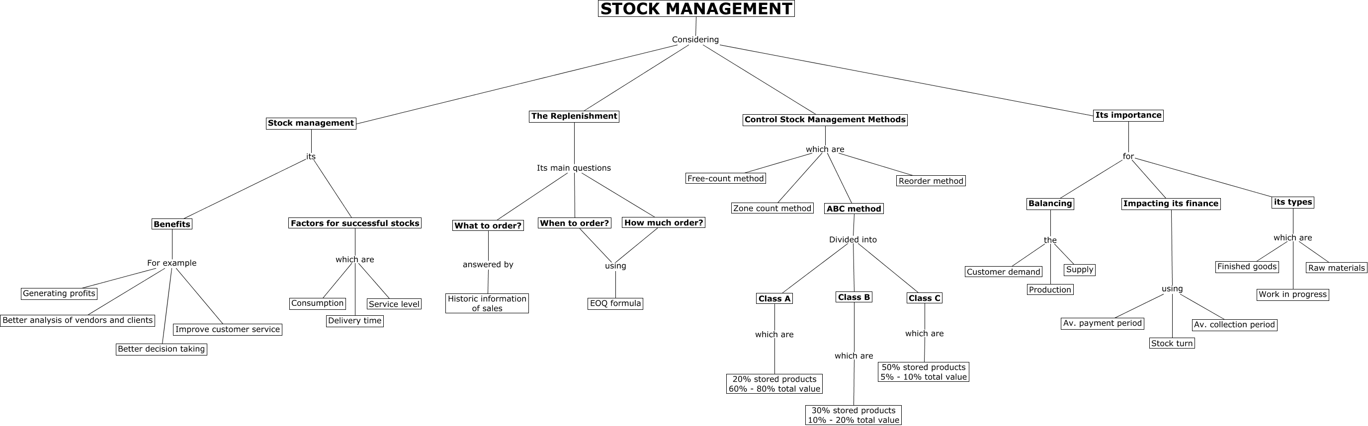 This Concept Map, created with IHMC CmapTools, has information related to: Chapter 5, When to order? using EOQ formula, STOCK MANAGEMENT Considering Stock management, Its importance for Balancing, Class C which are 50% stored products 5% - 10% total value, ABC method Divided into Class B, ABC method Divided into Class A, Factors for successful stocks which are Delivery time, Class B which are 30% stored products 10% - 20% total value, Its importance for Impacting its finance, Benefits For example Improve customer service, Stock management its Factors for successful stocks, Its importance for its types, STOCK MANAGEMENT Considering Control Stock Management Methods, Benefits For example Better analysis of vendors and clients, STOCK MANAGEMENT Considering Its importance, Benefits For example Better decision taking, The Replenishment Its main questions How much order?, Stock management its Benefits, Benefits For example Generating profits, Balancing the Customer demand