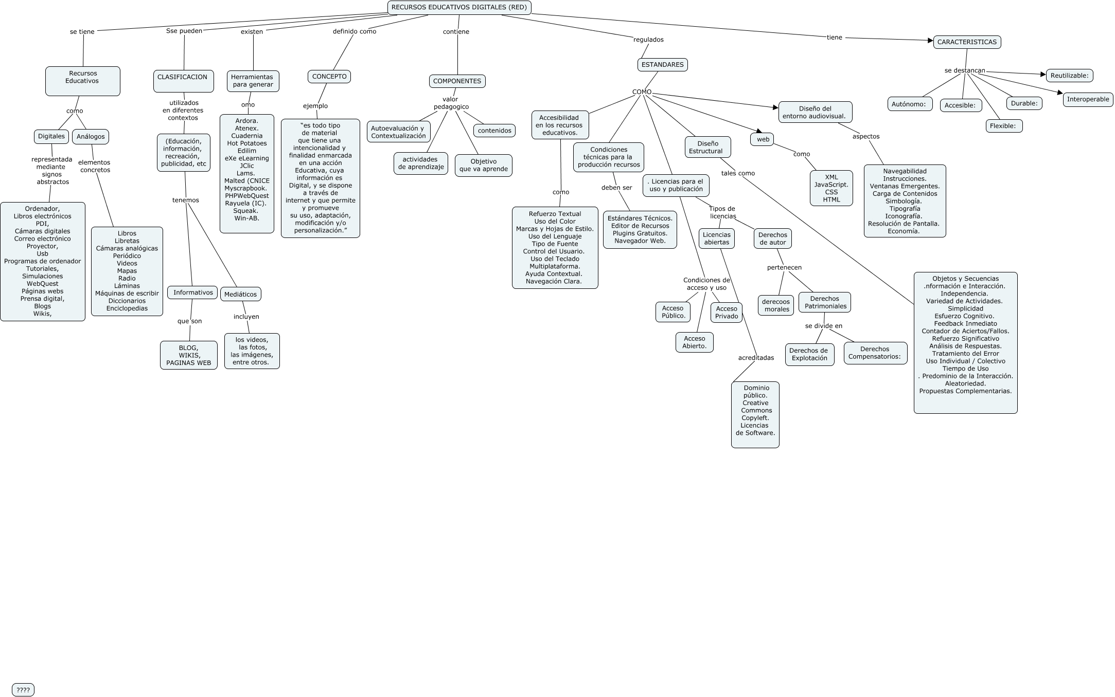 Este Cmap, tiene información relacionada con: RECURSOS EDUCATIVOS DIGITALES, CARACTERISTICAS se destancan Durable:, ESTANDARES COMO web, CONCEPTO ejemplo “es todo tipo de material que tiene una intencionalidad y finalidad enmarcada en una acción Educativa, cuya información es Digital, y se dispone a través de internet y que permite y promueve su uso, adaptación, modificación y/o personalización.”, Análogos elementos concretos Libros Libretas Cámaras analógicas Periódico Videos Mapas Radio Láminas Máquinas de escribir Diccionarios Enciclopedias, CARACTERISTICAS se destancan Reutilizable:, Derechos Patrimoniales se divide en Derechos de Explotación, ESTANDARES COMO Diseño Estructural, . Licencias para el uso y publicación Condiciones de acceso y uso Acceso Abierto., COMPONENTES valor pedagogico actividades de aprendizaje, ESTANDARES COMO Condiciones técnicas para la producción recursos, Diseño del entorno audiovisual. aspectos Navegabilidad Instrucciones. Ventanas Emergentes. Carga de Contenidos Simbología. Tipografía Iconografía. Resolución de Pantalla. Economía., COMPONENTES valor pedagogico Objetivo que va aprende, (Educación, información, recreación, publicidad, etc tenemos Informativos, ESTANDARES COMO . Licencias para el uso y publicación, COMPONENTES valor pedagogico contenidos, Condiciones técnicas para la producción recursos deben ser Estándares Técnicos. Editor de Recursos Plugins Gratuitos. Navegador Web., Recursos Educativos como Digitales, CARACTERISTICAS se destancan Autónomo:, CLASIFICACION utilizados en diferentes contextos (Educación, información, recreación, publicidad, etc, COMPONENTES valor pedagogico Autoevaluación y Contextualización