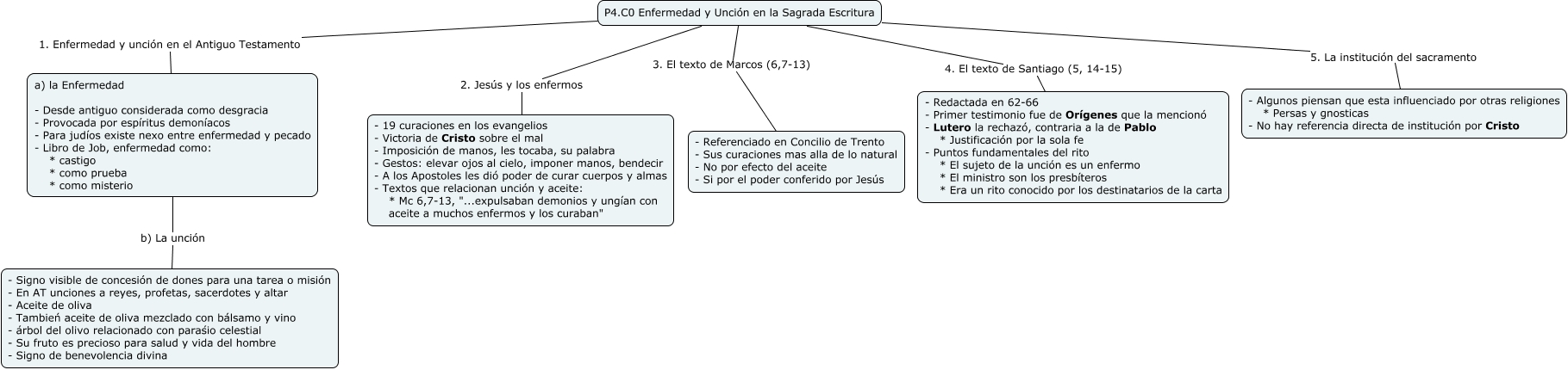 Este Cmap, tiene información relacionada con: P4.C0 Enfermedad y Unción en la Sagrada Escritura, P4.C0 Enfermedad y Unción en la Sagrada Escritura 4. El texto de Santiago (5, 14-15) - Redactada en 62-66 - Primer testimonio fue de Orígenes que la mencionó - Lutero la rechazó, contraria a la de Pablo * Justificación por la sola fe - Puntos fundamentales del rito * El sujeto de la unción es un enfermo * El ministro son los presbíteros * Era un rito conocido por los destinatarios de la carta, P4.C0 Enfermedad y Unción en la Sagrada Escritura 3. El texto de Marcos (6,7-13) - Referenciado en Concilio de Trento - Sus curaciones mas alla de lo natural - No por efecto del aceite - Si por el poder conferido por Jesús, P4.C0 Enfermedad y Unción en la Sagrada Escritura 5. La institución del sacramento - Algunos piensan que esta influenciado por otras religiones * Persas y gnosticas - No hay referencia directa de institución por Cristo, P4.C0 Enfermedad y Unción en la Sagrada Escritura 1. Enfermedad y unción en el Antiguo Testamento a) la Enfermedad - Desde antiguo considerada como desgracia - Provocada por espíritus demoníacos - Para judíos existe nexo entre enfermedad y pecado - Libro de Job, enfermedad como: * castigo * como prueba * como misterio, P4.C0 Enfermedad y Unción en la Sagrada Escritura 2. Jesús y los enfermos - 19 curaciones en los evangelios - Victoria de Cristo sobre el mal - Imposición de manos, les tocaba, su palabra - Gestos: elevar ojos al cielo, imponer manos, bendecir - A los Apostoles les dió poder de curar cuerpos y almas - Textos que relacionan unción y aceite: * Mc 6,7-13, "...expulsaban demonios y ungían con aceite a muchos enfermos y los curaban", a) la Enfermedad - Desde antiguo considerada como desgracia - Provocada por espíritus demoníacos - Para judíos existe nexo entre enfermedad y pecado - Libro de Job, enfermedad como: * castigo * como prueba * como misterio b) La unción - Signo visible de concesión de dones para una tarea o misión - En AT unciones a reyes, profetas, sacerdotes y altar - Aceite de oliva - Tambień aceite de oliva mezclado con bálsamo y vino - árbol del olivo relacionado con paraśio celestial - Su fruto es precioso para salud y vida del hombre - Signo de benevolencia divina