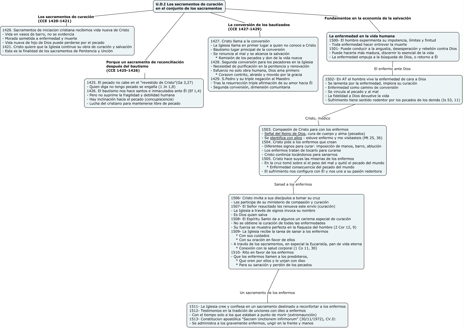 Este Cmap, tiene información relacionada con: U.D.1.1 Los sacramentos de curación en el conjunto de los sacramentos, U.D.I Los sacramentos de curación en el conjunto de los sacramentos Porque un sacramento de reconciliación después del bautismo (CCE 1425-1426) 1425. El pecado no cabe en el "revestido de Cristo"(Ga 3,27) - Quien diga no tengo pecado se engaña (1 Jn 1,8) 1426. El bautismo nos hace santos e inmaculados ante Él (Ef 1,4) - Pero no suprime la fragilidad y debilidad humana - Hay inclinación hacia el pecado (concupiscencia) - Lucha del cristiano para mantenerse libre de pecado, La enfermedad en la vida humana 1500- El hombre experimenta su impotencia, límites y finitud - Toda enfermedad hacer entrever la muerte 1501- Puede conducir a la angustia, desesperación y rebelión contra Dios - Puede hacerla más madura, discernir lo esencial de la vida - La enfermedad empuja a la búsqueda de Dios, o retorno a Él El enfermo ante Dios 1502- En AT el hombre vive la enfermedad de cara a Dios - Se lamenta por la enfermedad, implora su curación - Enfermedad como camino de conversión - Se vincula al pecado y al mal - La fidelidad a Dios devuelve la vida - Sufrimiento tiene sentido redentor por los pecados de los demás (Is 53, 11), U.D.I Los sacramentos de curación en el conjunto de los sacramentos La conversión de los bautizados (CCE 1427-1429) 1427. Cristo llama a la conversión - La Iglesia llama en primer lugar a quien no conoce a Cristo - Bautismo lugar principal de la conversión - Se renuncia al mal y se alcanza la salvación * Remisión de los pecados y don de la vida nueva 1428. Segunda conversión para los pecadores en la Iglesia - Necesidad de purificación en la penitencia y renovación - Esfuerzo no solo obra humana, Dios ama primero * Corazon contrito, atraido y movido por la gracia 1429. S.Pedro y su triple negación al Maestro - Tras la resurrección triple afirmación de su amor hacia Él - Segunda conversión, dimensión comunitaria, 1506- Cristo invita a sus discípulos a tomar su cruz - Les participa de su ministerio de compasión y curación 1507- El Señor resucitado les renueva este envío (curación) - La Iglesia a través de signos invoca su nombre - Es Dios quien salva 1508- El Espíritu Santo da a algunos un carisma especial de curación - No se obtiene la curación de todas las enfermedades - Su fuerza se muestra perfecta en la flaqueza del hombre (2 Cor 12, 9) 1509- La Iglesia recibe la tarea de sanar a los enfermos * Con sus cuidados * Con su oración en favor de ellos - A través de los sacramentos, en especial la Eucaristía, pan de vida eterna * Conexión con la salud corporal (1 Co 11, 30) 1510- Rito en favor de los enfermos - Que los enfermos llamen a los presbiteros, * Que oren por ellos y le unjan con óleo * Para su sanación y perdón de los pecados Un sacramento de los enfermos 1511- La Iglesia cree y confiesa en un sacramento destinado a reconfortar a los enfermos 1512- Testimonios en la tradición de unciones con óleo a enfermos - Con el tiempo solo a los que estaban a punto de morir (extremaunción) 1513- Constitucion apostólica "Sacram Unctionem infirmorum" (30/11/1972), CV.II: - Se administra a los gravemente enfermos, ungir en la frente y manos, 1503. Compasión de Cristo para con los enfermos - Señal del Reino de Dios, cura de cuerpo y alma (pecados) - Se identifica con ellos : estuve enfermo y me visitasteis (Mt 25, 36) 1504. Cristo pide a los enfermos que crean - Diferentes signos para curar: imposición de manos, barro, ablución - Los enfermos tratan de tocarlo para curarse - Cristo continúa tocándonos para sanarnos 1505. Cristo hace suyas las miserias de los enfermos - En la cruz tomó sobre sí el peso del mal y quitó el pecado del mundo * Enfermedad consecuencia del pecado del mundo - El sufrimiento nos configura con Él y nos une a su pasión redentora Sanad a los enfermos 1506- Cristo invita a sus discípulos a tomar su cruz - Les participa de su ministerio de compasión y curación 1507- El Señor resucitado les renueva este envío (curación) - La Iglesia a través de signos invoca su nombre - Es Dios quien salva 1508- El Espíritu Santo da a algunos un carisma especial de curación - No se obtiene la curación de todas las enfermedades - Su fuerza se muestra perfecta en la flaqueza del hombre (2 Cor 12, 9) 1509- La Iglesia recibe la tarea de sanar a los enfermos * Con sus cuidados * Con su oración en favor de ellos - A través de los sacramentos, en especial la Eucaristía, pan de vida eterna * Conexión con la salud corporal (1 Co 11, 30) 1510- Rito en favor de los enfermos - Que los enfermos llamen a los presbiteros, * Que oren por ellos y le unjan con óleo * Para su sanación y perdón de los pecados, 1502- En AT el hombre vive la enfermedad de cara a Dios - Se lamenta por la enfermedad, implora su curación - Enfermedad como camino de conversión - Se vincula al pecado y al mal - La fidelidad a Dios devuelve la vida - Sufrimiento tiene sentido redentor por los pecados de los demás (Is 53, 11) Cristo, médico 1503. Compasión de Cristo para con los enfermos - Señal del Reino de Dios, cura de cuerpo y alma (pecados) - Se identifica con ellos : estuve enfermo y me visitasteis (Mt 25, 36) 1504. Cristo pide a los enfermos que crean - Diferentes signos para curar: imposición de manos, barro, ablución - Los enfermos tratan de tocarlo para curarse - Cristo continúa tocándonos para sanarnos 1505. Cristo hace suyas las miserias de los enfermos - En la cruz tomó sobre sí el peso del mal y quitó el pecado del mundo * Enfermedad consecuencia del pecado del mundo - El sufrimiento nos configura con Él y nos une a su pasión redentora, U.D.I Los sacramentos de curación en el conjunto de los sacramentos Fundamentos en la economía de la salvación La enfermedad en la vida humana 1500- El hombre experimenta su impotencia, límites y finitud - Toda enfermedad hacer entrever la muerte 1501- Puede conducir a la angust