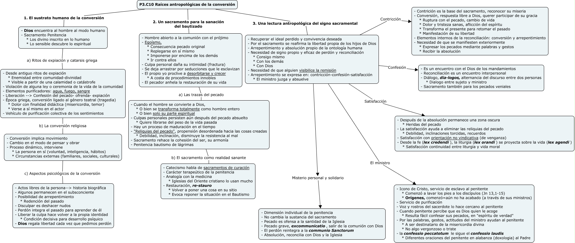 Este Cmap, tiene información relacionada con: P3.C10 Raíces antropológicas de la conversión, - Recuperar el ideal perdido y convivencia deseada - Por el sacramento se reafirma la libertad propia de los hijos de Dios - Arrepentimiento y absolución propio de la ontología humana - Necesidad de signo propio y eficaz de perdón y reconciliación * Consigo mismo * Con los demás * Con Dios - Necesidad de que alguien visibilice la remisión - Arrepentimiento se expresa en: contricción-confesión-satisfacción * El ministro juzga y absuelve Confesión - Es un encuentro con el Dios de los mandamientos - Reconciliación es un encuentro interpersonal - Diálogo, dia-logos,alternancia del discurso entre dos personas * Dialogo entre sujeto y ministro - Sacramento también para los pecados veniales, - Dios encuentra al hombre al modo humano - Sacramento Penitencia * Los divino inscrito en lo humano * Lo sensible descubre lo espiritual a) Ritos de expiación y catarsis griega - Desde antiguo ritos de expiación * Enemistad entre comunidad-divinidad * Visible a partir de una calamidad o catástrofe - Violación de alguna ley o ceremonia de la vida de la comunidad - Elementos purificadores: agua, fuego, sangre - Liberación --> Confesión del pecado- ofrenda- expiación - Época griega, conversión ligado al género teatral (tragedia) * Dolor con finalidad didáctica (misericordia, temor) * Verse a sí mismo en el actor - Vehículo de purificación colectiva de los sentimientos, - Recuperar el ideal perdido y convivencia deseada - Por el sacramento se reafirma la libertad propia de los hijos de Dios - Arrepentimiento y absolución propio de la ontología humana - Necesidad de signo propio y eficaz de perdón y reconciliación * Consigo mismo * Con los demás * Con Dios - Necesidad de que alguien visibilice la remisión - Arrepentimiento se expresa en: contricción-confesión-satisfacción * El ministro juzga y absuelve Satisfacción - Después de la absolución permanece una zona oscura * Heridas del pecado - La satisfacción ayuda a eliminar las reliquias del pecado * Debilidad, inclinaciones torcidas, recuerdos - Satisfacción con orientación no vindicativa (de venganza) - Desde la fe (lex credendi), la liturgia (lex orandi) se proyecta sobre la vida (lex agendi) * Satisfacción continuidad entre liturgia y vida moral, - Hombre abierto a la comunión con el prójimo - Egoísmo, * Consecuencia pecado original * Replegarse en sí mismo * Imponerse por encima de los demás * Ir contra ellos - Culpa personal daña su intimidad (fractura) - Se deja arrastrar por seducciones que le esclavizan - El propio yo proclive a desorbitarse y crecer * A costa de procedimientos innobles - El pecador anhela la restauración de su vida a) Las trazas del pecado - Cuando el hombre se convierte a Dios, * O bien se transforma totalmente como hombre entero * O bien solo su parte espiritual - Culpas personales persisten aún después del pecado absuelto * Quiere librarse del peso de la vida pasada - Hay un proceso de maduración en el tiempo - "Reliquias del pecado", propensión desordenada hacia las cosas creadas * Debilidad, inclinación, disminuye la resistencia al mal - Sacramento rehace la cohesión del ser, su armonía - Penitencia bautismo de lágrimas, P3.C10 Raíces antropológicas de la conversión 2. Un sacramento para la sanación del bautizado - Hombre abierto a la comunión con el prójimo - Egoísmo, * Consecuencia pecado original * Replegarse en sí mismo * Imponerse por encima de los demás * Ir contra ellos - Culpa personal daña su intimidad (fractura) - Se deja arrastrar por seducciones que le esclavizan - El propio yo proclive a desorbitarse y crecer * A costa de procedimientos innobles - El pecador anhela la restauración de su vida, P3.C10 Raíces antropológicas de la conversión 1. El sustrato humano de la conversión - Dios encuentra al hombre al modo humano - Sacramento Penitencia * Los divino inscrito en lo humano * Lo sensible descubre lo espiritual, - Recuperar el ideal perdido y convivencia deseada - Por el sacramento se reafirma la libertad propia de los hijos de Dios - Arrepentimiento y absolución propio de la ontología humana - Necesidad de signo propio y eficaz de perdón y reconciliación * Consigo mismo * Con los demás * Con Dios - Necesidad de que alguien visibilice la remisión - Arrepentimiento se expresa en: contricción-confesión-satisfacción * El ministro juzga y absuelve Misterio personal y solidario - Dimensión individual de la penitencia - No cambia la sustancia del sacramento - Pecado es ofensa a la santidad de la Iglesia - Pecado grave, excommunicatio, salir de la comunión con Dios - El perdón reintegra a la communio Sanctorum - Absolución, reconcilia con Dios y la Iglesia, - Conversión implica movimiento - Cambio en el modo de pensar y obrar - Proceso dinámico, interviene * La persona en sí (voluntad, inteligencia, hábitos) * Circunstancias externas (familiares, sociales, culturales) c) Aspectos psicológicos de la conversión - Actos libres de la persona--> historia biográfica - Algunos permanecen en el subsconciente - Posibilidad de arrepentimiento * Redención del pasado - Disculpar es deshacer nudos - Perdón integra el pasado para aprender de él - Liberar la culpa hace volver a la propia identidad * Condición decisiva para desarrollo psíquico - Dios regala libertad cada vez que pedimos perdón, - Recuperar el ideal perdido y convivencia deseada - Por el sacramento se reafirma la libertad propia de los hijos de Dios - Arrepentimiento y absolución propio de la ontología humana - Necesidad de signo propio y eficaz de perdón y reconciliación * Consigo mismo * Con los demás * Con Dios - Necesidad de que alguien visibilice la remisión - Arrepentimiento se expresa en: contricción-confesión-satisfacción * El ministro juzga y absuelve El ministro - Icono de Cristo, servicio de esclavo al penitente * Comenzó a lavar los pies a los discípulos (Jn 13