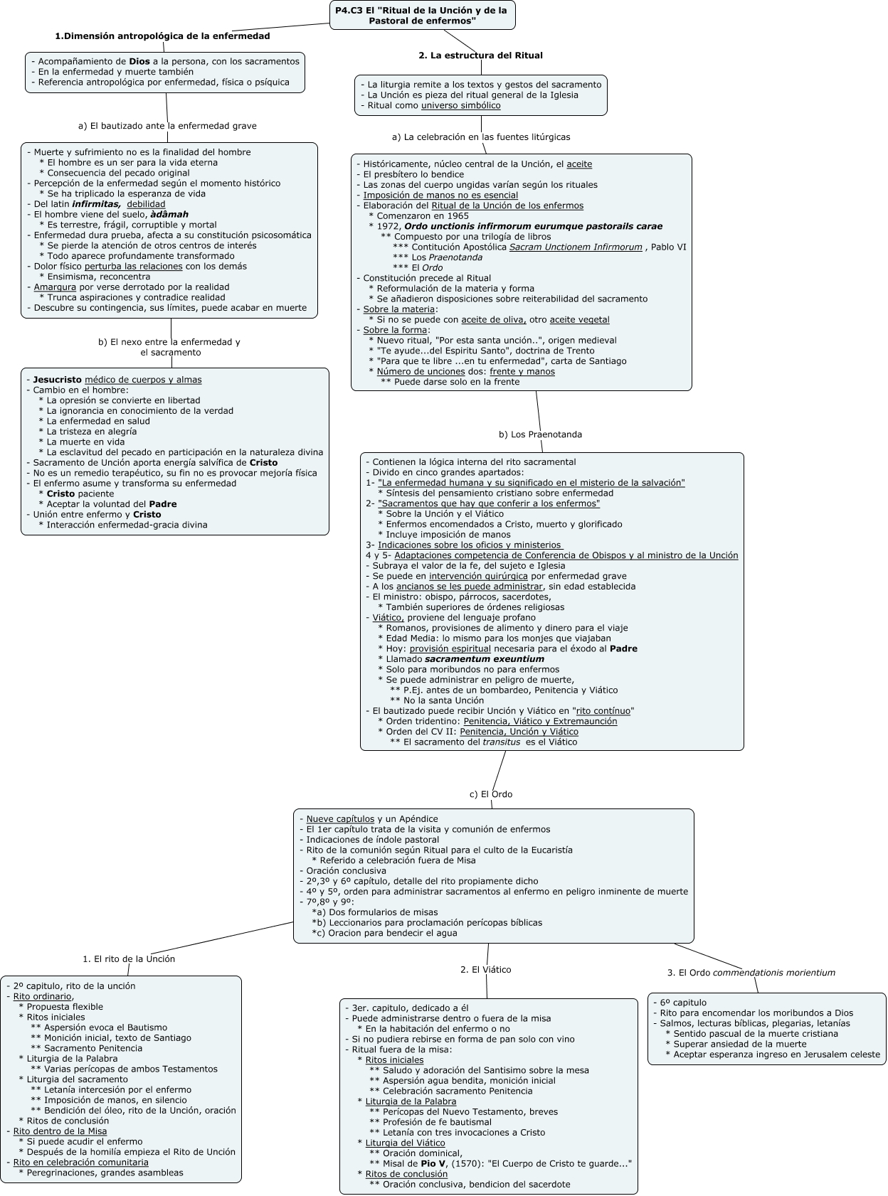 Este Cmap, tiene información relacionada con: P4.C3 El Ritual de la Unción y de la Pastoral de enfermos, - Nueve capítulos y un Apéndice - El 1er capítulo trata de la visita y comunión de enfermos - Indicaciones de índole pastoral - Rito de la comunión según Ritual para el culto de la Eucaristía * Referido a celebración fuera de Misa - Oración conclusiva - 2º,3º y 6º capítulo, detalle del rito propiamente dicho - 4º y 5º, orden para administrar sacramentos al enfermo en peligro inminente de muerte - 7º,8º y 9º: *a) Dos formularios de misas *b) Leccionarios para proclamación perícopas bíblicas *c) Oracion para bendecir el agua 3. El Ordo commendationis morientium - 6º capitulo - Rito para encomendar los moribundos a Dios - Salmos, lecturas bíblicas, plegarias, letanías * Sentido pascual de la muerte cristiana * Superar ansiedad de la muerte * Aceptar esperanza ingreso en Jerusalem celeste, - Históricamente, núcleo central de la Unción, el aceite - El presbítero lo bendice - Las zonas del cuerpo ungidas varían según los rituales - Imposición de manos no es esencial - Elaboración del Ritual de la Unción de los enfermos * Comenzaron en 1965 * 1972, Ordo unctionis infirmorum eurumque pastorails carae ** Compuesto por una trilogía de libros *** Contitución Apostólica Sacram Unctionem Infirmorum, Pablo VI *** Los Praenotanda *** El Ordo - Constitución precede al Ritual * Reformulación de la materia y forma * Se añadieron disposiciones sobre reiterabilidad del sacramento - Sobre la materia: * Si no se puede con aceite de oliva, otro aceite vegetal - Sobre la forma: * Nuevo ritual, "Por esta santa unción..", origen medieval * "Te ayude...del Espiritu Santo", doctrina de Trento * "Para que te libre ...en tu enfermedad", carta de Santiago * Número de unciones dos: frente y manos ** Puede darse solo en la frente b) Los Praenotanda - Contienen la lógica interna del rito sacramental - Divido en cinco grandes apartados: 1- "La enfermedad humana y su significado en el misterio de la salvación" * Síntesis del pensamiento cristiano sobre enfermedad 2- "Sacramentos que hay que conferir a los enfermos" * Sobre la Unción y el Viático * Enfermos encomendados a Cristo, muerto y glorificado * Incluye imposición de manos 3- Indicaciones sobre los oficios y ministerios 4 y 5- Adaptaciones competencia de Conferencia de Obispos y al ministro de la Unción - Subraya el valor de la fe, del sujeto e Iglesia - Se puede en intervención quirúrgica por enfermedad grave - A los ancianos se les puede administrar, sin edad establecida - El ministro: obispo, párrocos, sacerdotes, * También superiores de órdenes religiosas - Viático, proviene del lenguaje profano * Romanos, provisiones de alimento y dinero para el viaje * Edad Media: lo mismo para los monjes que viajaban * Hoy: provisión espiritual necesaria para el éxodo al Padre * Llamado sacramentum exeuntium * Solo para moribundos no para enfermos * Se puede administrar en peligro de muerte, ** P.Ej. antes de un bombardeo, Penitencia y Viático ** No la santa Unción - El bautizado puede recibir Unción y Viático en "rito contínuo" * Orden tridentino: Penitencia, Viático y Extremaunción * Orden del CV II: Penitencia, Unción y Viático ** El sacramento del transitus es el Viático, P4.C3 El "Ritual de la Unción y de la Pastoral de enfermos" 1.Dimensión antropológica de la enfermedad - Acompañamiento de Dios a la persona, con los sacramentos - En la enfermedad y muerte también - Referencia antropológica por enfermedad, física o psíquica, - La liturgia remite a los textos y gestos del sacramento - La Unción es pieza del ritual general de la Iglesia - Ritual como universo simbólico a) La celebración en las fuentes litúrgicas - Históricamente, núcleo central de la Unción, el aceite - El presbítero lo bendice - Las zonas del cuerpo ungidas varían según los rituales - Imposición de manos no es esencial - Elaboración del Ritual de la Unción de los enfermos * Comenzaron en 1965 * 1972, Ordo unctionis infirmorum eurumque pastorails carae ** Compuesto por una trilogía de libros *** Contitución Apostólica Sacram Unctionem Infirmorum, Pablo VI *** Los Praenotanda *** El Ordo - Constitución precede al Ritual * Reformulación de la materia y forma * Se añadieron disposiciones sobre reiterabilidad del sacramento - Sobre la materia: * Si no se puede con aceite de oliva, otro aceite vegetal - Sobre la forma: * Nuevo ritual, "Por esta santa unción..", origen medieval * "Te ayude...del Espiritu Santo", doctrina de Trento * "Para que te libre ...en tu enfermedad", carta de Santiago * Número de unciones dos: frente y manos ** Puede darse solo en la frente, P4.C3 El "Ritual de la Unción y de la Pastoral de enfermos" 2. La estructura del Ritual - La liturgia remite a los textos y gestos del sacramento - La Unción es pieza del ritual general de la Iglesia - Ritual como universo simbólico, - Nueve capítulos y un Apéndice - El 1er capítulo trata de la visita y comunión de enfermos - Indicaciones de índole pastoral - Rito de la comunión según Ritual para el culto de la Eucaristía * Referido a celebración fuera de Misa - Oración conclusiva - 2º,3º y 6º capítulo, detalle del rito propiamente dicho - 4º y 5º, orden para administrar sacramentos al enfermo en peligro inminente de muerte - 7º,8º y 9º: *a) Dos formularios de misas *b) Leccionarios para proclamación perícopas bíblicas *c) Oracion para bendecir el agua 1. El rito de la Unción - 2º capitulo, rito de la unción - Rito ordinario, * Propuesta flexible * Ritos iniciales ** Aspersión evoca el Bautismo ** Monición inicial, texto de Santiago ** Sacramento Penitencia * Liturgia de la Palabra ** Varias perícopas de ambos Testamentos * Liturgia del sacramento ** Letanía intercesión por el enfermo ** Imposición de manos, en silencio ** Bendición del óleo, rito de la Unción, oración * Ritos de conclusión - Rito dentro de la Misa