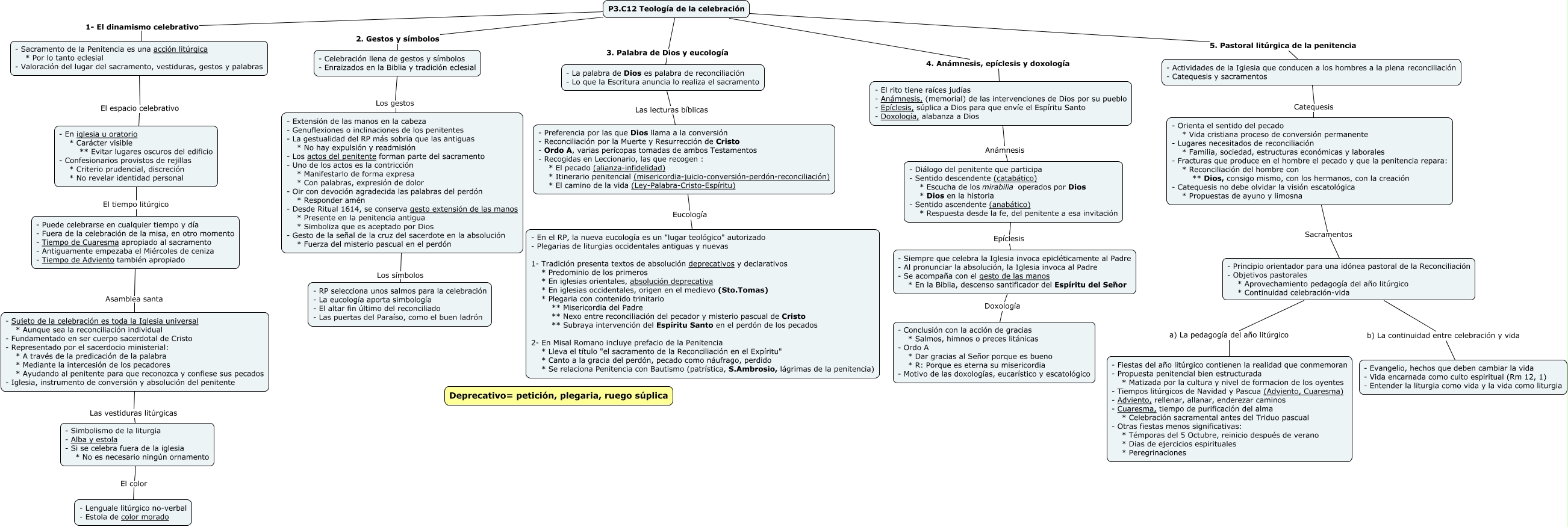 Este Cmap, tiene información relacionada con: P3.C12 Teología de la celebración, - Actividades de la Iglesia que conducen a los hombres a la plena reconciliación - Catequesis y sacramentos Catequesis - Orienta el sentido del pecado * Vida cristiana proceso de conversión permanente - Lugares necesitados de reconciliación * Familia, sociedad, estructuras económicas y laborales - Fracturas que produce en el hombre el pecado y que la penitencia repara: * Reconciliación del hombre con ** Dios, consigo mismo, con los hermanos, con la creación - Catequesis no debe olvidar la visión escatológica * Propuestas de ayuno y limosna, - Siempre que celebra la Iglesia invoca epicléticamente al Padre - Al pronunciar la absolución, la Iglesia invoca al Padre - Se acompaña con el gesto de las manos * En la Biblia, descenso santificador del Espíritu del Señor Doxología - Conclusión con la acción de gracias * Salmos, himnos o preces litánicas - Ordo A * Dar gracias al Señor porque es bueno * R: Porque es eterna su misericordia - Motivo de las doxologías, eucarístico y escatológico, - Extensión de las manos en la cabeza - Genuflexiones o inclinaciones de los penitentes - La gestualidad del RP más sobria que las antiguas * No hay expulsión y readmisión - Los actos del penitente forman parte del sacramento - Uno de los actos es la contricción * Manifestarlo de forma expresa * Con palabras, expresión de dolor - Oir con devoción agradecida las palabras del perdón * Responder amén - Desde Ritual 1614, se conserva gesto extensión de las manos * Presente en la penitencia antigua * Simboliza que es aceptado por Dios - Gesto de la señal de la cruz del sacerdote en la absolución * Fuerza del misterio pascual en el perdón Los símbolos - RP selecciona unos salmos para la celebración - La eucología aporta simbología - El altar fin último del reconciliado - Las puertas del Paraíso, como el buen ladrón, P3.C12 Teología de la celebración 4. Anámnesis, epíclesis y doxología - El rito tiene raíces judías - Anámnesis, (memorial) de las intervenciones de Dios por su pueblo - Epíclesis, súplica a Dios para que envíe el Espíritu Santo - Doxología, alabanza a Dios, - Diálogo del penitente que participa - Sentido descendente (catabático) * Escucha de los mirabilia operados por Dios * Dios en la historia - Sentido ascendente (anabático) * Respuesta desde la fe, del penitente a esa invitación Epíclesis - Siempre que celebra la Iglesia invoca epicléticamente al Padre - Al pronunciar la absolución, la Iglesia invoca al Padre - Se acompaña con el gesto de las manos * En la Biblia, descenso santificador del Espíritu del Señor, - Principio orientador para una idónea pastoral de la Reconciliación - Objetivos pastorales * Aprovechamiento pedagogía del año litúrgico * Continuidad celebración-vida a) La pedagogía del año litúrgico - Fiestas del año litúrgico contienen la realidad que conmemoran - Propuesta penitencial bien estructurada * Matizada por la cultura y nivel de formacion de los oyentes - Tiempos litúrgicos de Navidad y Pascua (Adviento, Cuaresma) - Adviento, rellenar, allanar, enderezar caminos - Cuaresma, tiempo de purificación del alma * Celebración sacramental antes del Triduo pascual - Otras fiestas menos significativas: * Témporas del 5 Octubre, reinicio después de verano * Dias de ejercicios espirituales * Peregrinaciones, P3.C12 Teología de la celebración 2. Gestos y símbolos - Celebración llena de gestos y símbolos - Enraizados en la Biblia y tradición eclesial, - Preferencia por las que Dios llama a la conversión - Reconciliación por la Muerte y Resurrección de Cristo - Ordo A, varias perícopas tomadas de ambos Testamentos - Recogidas en Leccionario, las que recogen : * El pecado (alianza-infidelidad) * Itinerario penitencial (misericordia-juicio-conversión-perdón-reconciliación) * El camino de la vida (Ley-Palabra-Cristo-Espíritu) Eucología - En el RP, la nueva eucología es un "lugar teológico" autorizado - Plegarias de liturgias occidentales antiguas y nuevas 1- Tradición presenta textos de absolución deprecativos y declarativos * Predominio de los primeros * En iglesias orientales, absolución deprecativa * En iglesias occidentales, origen en el medievo (Sto.Tomas) * Plegaria con contenido trinitario ** Misericordia del Padre ** Nexo entre reconciliación del pecador y misterio pascual de Cristo ** Subraya intervención del Espíritu Santo en el perdón de los pecados 2- En Misal Romano incluye prefacio de la Penitencia * Lleva el título "el sacramento de la Reconciliación en el Expíritu" * Canto a la gracia del perdón, pecado como náufrago, perdido * Se relaciona Penitencia con Bautismo (patrística, S.Ambrosio, lágrimas de la penitencia), P3.C12 Teología de la celebración 5. Pastoral litúrgica de la penitencia - Actividades de la Iglesia que conducen a los hombres a la plena reconciliación - Catequesis y sacramentos, - Puede celebrarse en cualquier tiempo y día - Fuera de la celebración de la misa, en otro momento - Tiempo de Cuaresma apropiado al sacramento - Antiguamente empezaba el Miércoles de ceniza - Tiempo de Adviento también apropiado Asamblea santa - Sujeto de la celebración es toda la Iglesia universal * Aunque sea la reconciliación individual - Fundamentado en ser cuerpo sacerdotal de Cristo - Representado por el sacerdocio ministerial: * A través de la predicación de la palabra * Mediante la intercesión de los pecadores * Ayudando al penitente para que reconozca y confiese sus pecados - Iglesia, instrumento de conversión y absolución del penitente, - Orienta el sentido del pecado * Vida cristiana proceso de conversión permanente - Lugares necesitados de reconciliación * Familia, sociedad, estructuras económicas y laborales - Fracturas que produce en el hombre el pecado y que la penitencia repara: * Reconciliación del hombre con ** Dios, consigo mismo, con los hermanos, con la creaci