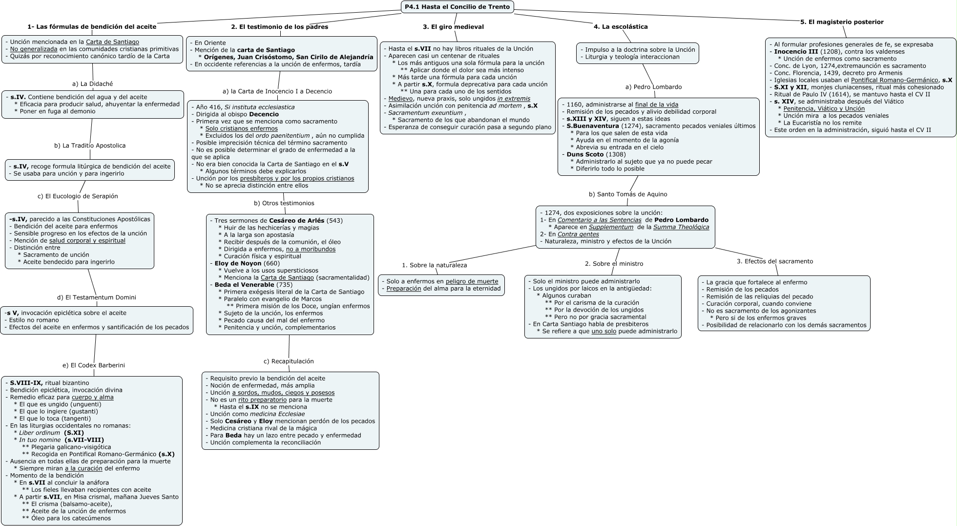 Este Cmap, tiene información relacionada con: P4.C1 Hasta el Concilio de Trento, - Tres sermones de Cesáreo de Arlés (543) * Huir de las hechicerías y magias * A la larga son apostasía * Recibir después de la comunión, el óleo * Dirigida a enfermos, no a moribundos * Curación física y espiritual - Eloy de Noyon (660) * Vuelve a los usos supersticiosos * Menciona la Carta de Santiago (sacramentalidad) - Beda el Venerable (735) * Primera exégesis literal de la Carta de Santiago * Paralelo con evangelio de Marcos ** Primera misión de los Doce, ungían enfermos * Sujeto de la unción, los enfermos * Pecado causa del mal del enfermo * Penitencia y unción, complementarios c) Recapitulación - Requisito previo la bendición del aceite - Noción de enfermedad, más amplia - Unción a sordos, mudos, ciegos y posesos - No es un rito preparatorio para la muerte * Hasta el s.IX no se menciona - Unción como medicina Ecclesiae - Solo Cesáreo y Eloy mencionan perdón de los pecados - Medicina cristiana rival de la mágica - Para Beda hay un lazo entre pecado y enfermedad - Unción complementa la reconciliación, P4.1 Hasta el Concilio de Trento 4. La escolástica - Impulso a la doctrina sobre la Unción - Liturgia y teología interaccionan, - 1274, dos exposiciones sobre la unción: 1- En Comentario a las Sentencias de Pedro Lombardo * Aparece en Supplementum de la Summa Theológica 2- En Contra gentes - Naturaleza, ministro y efectos de la Unción 3. Efectos del sacramento - La gracia que fortalece al enfermo - Remisión de los pecados - Remisión de las reliquias del pecado - Curación corporal, cuando conviene - No es sacramento de los agonizantes * Pero si de los enfermos graves - Posibilidad de relacionarlo con los demás sacramentos, P4.1 Hasta el Concilio de Trento 2. El testimonio de los padres - En Oriente - Mención de la carta de Santiago * Orígenes, Juan Crisóstomo, San Cirilo de Alejandría - En occidente referencias a la unción de enfermos, tardía, - s.IV. Contiene bendición del agua y del aceite * Eficacia para producir salud, ahuyentar la enfermedad * Poner en fuga al demonio b) La Traditio Apostolica - s.IV, recoge formula litúrgica de bendición del aceite - Se usaba para unción y para ingerirlo, P4.1 Hasta el Concilio de Trento 1- Las fórmulas de bendición del aceite - Unción mencionada en la Carta de Santiago - No generalizada en las comunidades cristianas primitivas - Quizás por reconocimiento canónico tardío de la Carta, - 1274, dos exposiciones sobre la unción: 1- En Comentario a las Sentencias de Pedro Lombardo * Aparece en Supplementum de la Summa Theológica 2- En Contra gentes - Naturaleza, ministro y efectos de la Unción 2. Sobre el ministro - Solo el ministro puede administrarlo - Los ungidos por laicos en la antigüedad: * Algunos curaban ** Por el carisma de la curación ** Por la devoción de los ungidos ** Pero no por gracia sacramental - En Carta Santiago habla de presbiteros * Se refiere a que uno solo puede administrarlo, - Unción mencionada en la Carta de Santiago - No generalizada en las comunidades cristianas primitivas - Quizás por reconocimiento canónico tardío de la Carta a) La Didaché - s.IV. Contiene bendición del agua y del aceite * Eficacia para producir salud, ahuyentar la enfermedad * Poner en fuga al demonio, - Año 416, Si instituta ecclesiastica - Dirigida al obispo Decencio - Primera vez que se menciona como sacramento * Solo cristianos enfermos * Excluidos los del ordo paenitentium, aún no cumplida - Posible imprecisión técnica del término sacramento - No es posible determinar el grado de enfermedad a la que se aplica - No era bien conocida la Carta de Santiago en el s.V * Algunos términos debe explicarlos - Unción por los presbíteros y por los propios cristianos * No se aprecia distinción entre ellos b) Otros testimonios - Tres sermones de Cesáreo de Arlés (543) * Huir de las hechicerías y magias * A la larga son apostasía * Recibir después de la comunión, el óleo * Dirigida a enfermos, no a moribundos * Curación física y espiritual - Eloy de Noyon (660) * Vuelve a los usos supersticiosos * Menciona la Carta de Santiago (sacramentalidad) - Beda el Venerable (735) * Primera exégesis literal de la Carta de Santiago * Paralelo con evangelio de Marcos ** Primera misión de los Doce, ungían enfermos * Sujeto de la unción, los enfermos * Pecado causa del mal del enfermo * Penitencia y unción, complementarios, - 1274, dos exposiciones sobre la unción: 1- En Comentario a las Sentencias de Pedro Lombardo * Aparece en Supplementum de la Summa Theológica 2- En Contra gentes - Naturaleza, ministro y efectos de la Unción 1. Sobre la naturaleza - Solo a enfermos en peligro de muerte - Preparación del alma para la eternidad, -s V, invocación epiclética sobre el aceite - Estilo no romano - Efectos del aceite en enfermos y santificación de los pecados e) El Codex Barberini - S.VIII-IX, ritual bizantino - Bendición epiclética, invocación divina - Remedio eficaz para cuerpo y alma * El que es ungido (unguenti) * El que lo ingiere (gustanti) * El que lo toca (tangenti) - En las liturgias occidentales no romanas: * Liber ordinum (S.XI) * In tuo nomine (s.VII-VIII) ** Plegaria galicano-visigótica ** Recogida en Pontifical Romano-Germánico (s.X) - Ausencia en todas ellas de preparación para la muerte * Siempre miran a la curación del enfermo - Momento de la bendición * En s.VII al concluir la anáfora ** Los fieles llevaban recipientes con aceite * A partir s.VII, en Misa crismal, mañana Jueves Santo ** El crisma (balsamo-aceite), ** Aceite de la unción de enfermos ** Óleo para los catecúmenos, - 1160, administrarse al final de la vida - Remisión de los pecados y alivio debilidad corporal - s.XIII y XIV, siguen a estas ideas - S.Buenaventura (1274), sacramento pecados veniales últimos * Para los que salen de esta vida * Ayuda en el momento de la agonía * Abrevia su entrada en el cielo - Duns Sc