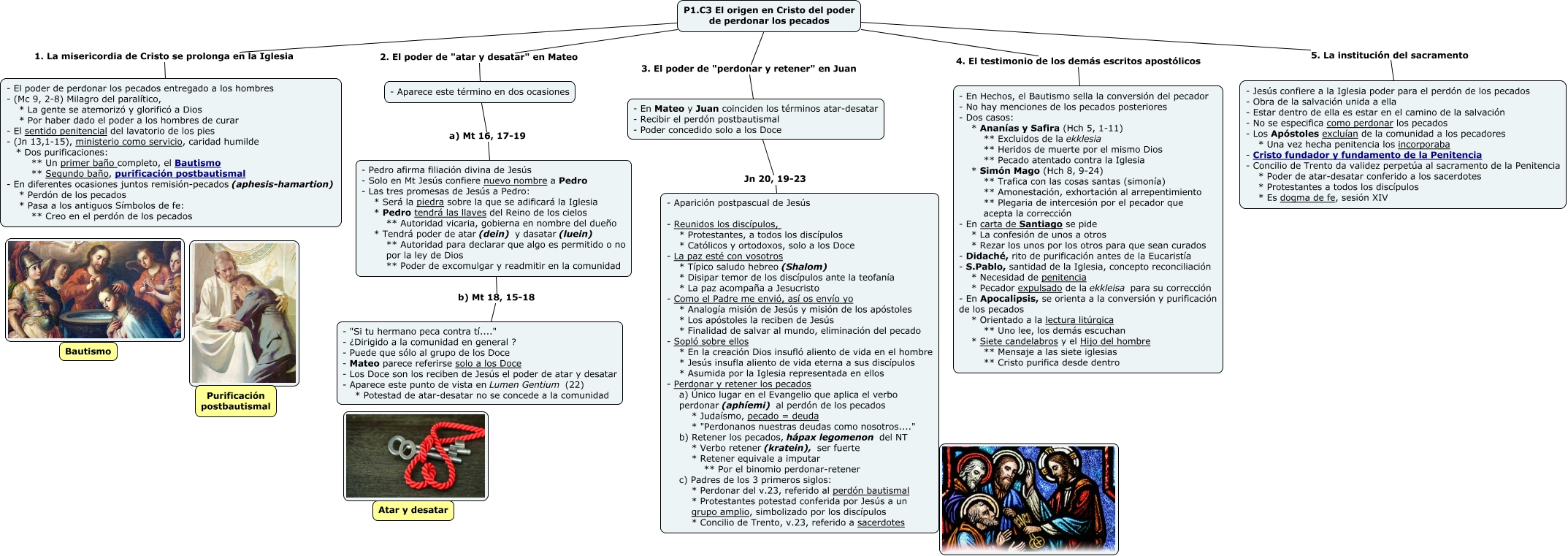 Este Cmap, tiene información relacionada con: P1.C3 El origen en Cristo del poder de perdonar los pecados, - Pedro afirma filiación divina de Jesús - Solo en Mt Jesús confiere nuevo nombre a Pedro - Las tres promesas de Jesús a Pedro: * Será la piedra sobre la que se adificará la Iglesia * Pedro tendrá las llaves del Reino de los cielos ** Autoridad vicaria, gobierna en nombre del dueño * Tendrá poder de atar (dein) y dasatar (luein) ** Autoridad para declarar que algo es permitido o no por la ley de Dios ** Poder de excomulgar y readmitir en la comunidad b) Mt 18, 15-18 - "Si tu hermano peca contra tí...." - ¿Dirigido a la comunidad en general ? - Puede que sólo al grupo de los Doce - Mateo parece referirse solo a los Doce - Los Doce son los reciben de Jesús el poder de atar y desatar - Aparece este punto de vista en Lumen Gentium (22) * Potestad de atar-desatar no se concede a la comunidad, P1.C3 El origen en Cristo del poder de perdonar los pecados 5. La institución del sacramento - Jesús confiere a la Iglesia poder para el perdón de los pecados - Obra de la salvación unida a ella - Estar dentro de ella es estar en el camino de la salvación - No se especifica como perdonar los pecados - Los Apóstoles excluían de la comunidad a los pecadores * Una vez hecha penitencia los incorporaba - Cristo fundador y fundamento de la Penitencia - Concilio de Trento da validez perpetúa al sacramento de la Penitencia * Poder de atar-desatar conferido a los sacerdotes * Protestantes a todos los discípulos * Es dogma de fe, sesión XIV, P1.C3 El origen en Cristo del poder de perdonar los pecados 2. El poder de "atar y desatar" en Mateo - Aparece este término en dos ocasiones, P1.C3 El origen en Cristo del poder de perdonar los pecados 1. La misericordia de Cristo se prolonga en la Iglesia - El poder de perdonar los pecados entregado a los hombres - (Mc 9, 2-8) Milagro del paralítico, * La gente se atemorizó y glorificó a Dios * Por haber dado el poder a los hombres de curar - El sentido penitencial del lavatorio de los pies - (Jn 13,1-15), ministerio como servicio, caridad humilde * Dos purificaciones: ** Un primer baño completo, el Bautismo ** Segundo baño, purificación postbautismal - En diferentes ocasiones juntos remisión-pecados (aphesis-hamartion) * Perdón de los pecados * Pasa a los antiguos Símbolos de fe: ** Creo en el perdón de los pecados, P1.C3 El origen en Cristo del poder de perdonar los pecados 4. El testimonio de los demás escritos apostólicos - En Hechos, el Bautismo sella la conversión del pecador - No hay menciones de los pecados posteriores - Dos casos: * Ananías y Safira (Hch 5, 1-11) ** Excluidos de la ekklesia ** Heridos de muerte por el mismo Dios ** Pecado atentado contra la Iglesia * Simón Mago (Hch 8, 9-24) ** Trafica con las cosas santas (simonía) ** Amonestación, exhortación al arrepentimiento ** Plegaria de intercesión por el pecador que acepta la corrección - En carta de Santiago se pide * La confesión de unos a otros * Rezar los unos por los otros para que sean curados - Didaché, rito de purificación antes de la Eucaristía - S.Pablo, santidad de la Iglesia, concepto reconciliación * Necesidad de penitencia * Pecador expulsado de la ekkleisa para su corrección - En Apocalipsis, se orienta a la conversión y purificación de los pecados * Orientado a la lectura litúrgica ** Uno lee, los demás escuchan * Siete candelabros y el Hijo del hombre ** Mensaje a las siete iglesias ** Cristo purifica desde dentro, - En Mateo y Juan coinciden los términos atar-desatar - Recibir el perdón postbautismal - Poder concedido solo a los Doce Jn 20, 19-23 - Aparición postpascual de Jesús - Reunidos los discípulos, * Protestantes, a todos los discípulos * Católicos y ortodoxos, solo a los Doce - La paz esté con vosotros * Típico saludo hebreo (Shalom) * Disipar temor de los discípulos ante la teofanía * La paz acompaña a Jesucristo - Como el Padre me envió, así os envío yo * Analogía misión de Jesús y misión de los apóstoles * Los apóstoles la reciben de Jesús * Finalidad de salvar al mundo, eliminación del pecado - Sopló sobre ellos * En la creación Dios insufló aliento de vida en el hombre * Jesús insufla aliento de vida eterna a sus discípulos * Asumida por la Iglesia representada en ellos - Perdonar y retener los pecados a) Único lugar en el Evangelio que aplica el verbo perdonar (aphíemi) al perdón de los pecados * Judaísmo, pecado = deuda * "Perdonanos nuestras deudas como nosotros...." b) Retener los pecados, hápax legomenon del NT * Verbo retener (kratein), ser fuerte * Retener equivale a imputar ** Por el binomio perdonar-retener c) Padres de los 3 primeros siglos: * Perdonar del v.23, referido al perdón bautismal * Protestantes potestad conferida por Jesús a un grupo amplio, simbolizado por los discípulos * Concilio de Trento, v.23, referido a sacerdotes, - Aparece este término en dos ocasiones a) Mt 16, 17-19 - Pedro afirma filiación divina de Jesús - Solo en Mt Jesús confiere nuevo nombre a Pedro - Las tres promesas de Jesús a Pedro: * Será la piedra sobre la que se adificará la Iglesia * Pedro tendrá las llaves del Reino de los cielos ** Autoridad vicaria, gobierna en nombre del dueño * Tendrá poder de atar (dein) y dasatar (luein) ** Autoridad para declarar que algo es permitido o no por la ley de Dios ** Poder de excomulgar y readmitir en la comunidad, P1.C3 El origen en Cristo del poder de perdonar los pecados 3. El poder de "perdonar y retener" en Juan - En Mateo y Juan coinciden los términos atar-desatar - Recibir el perdón postbautismal - Poder concedido solo a los Doce