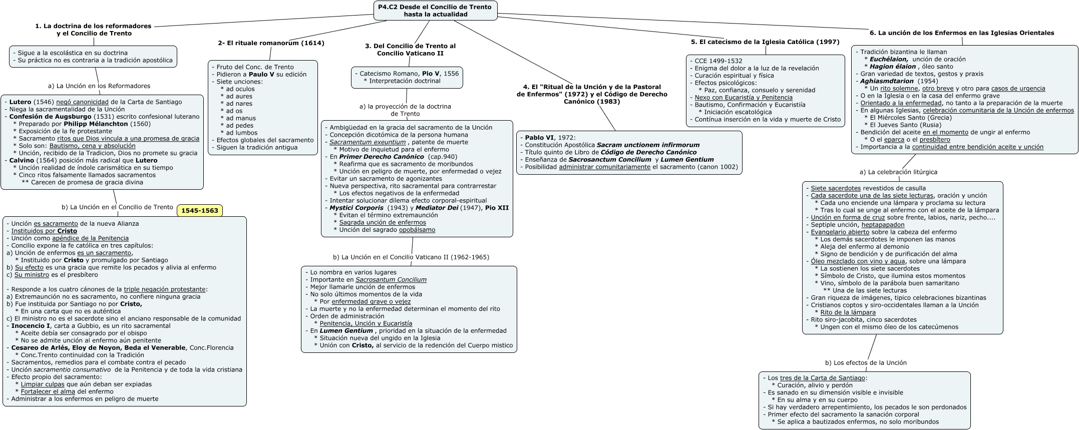 Este Cmap, tiene información relacionada con: P4.C2 Desde el Concilio de Trento hasta la actualidad, - Sigue a la escolástica en su doctrina - Su práctica no es contraria a la tradición apostólica a) La Unción en los Reformadores - Lutero (1546) negó canonicidad de la Carta de Santiago - Niega la sacramentalidad de la Unción - Confesión de Augsburgo (1531) escrito confesional luterano * Preparado por Philipp Mélanchton (1560) * Exposición de la fe protestante * Sacramento ritos que Dios vincula a una promesa de gracia * Solo son: Bautismo, cena y absolución * Unción, recibido de la Tradicion, Dios no promete su gracia - Calvino (1564) posición más radical que Lutero * Unción realidad de índole carismática en su tiempo * Cinco ritos falsamente llamados sacramentos ** Carecen de promesa de gracia divina, P4.C2 Desde el Concilio de Trento hasta la actualidad 3. Del Concilio de Trento al Concilio Vaticano II - Catecismo Romano, Pio V, 1556 * Interpretación doctrinal, P4.C2 Desde el Concilio de Trento hasta la actualidad 6. La unción de los Enfermos en las Iglesias Orientales - Tradición bizantina le llaman * Euchélaion, unción de oración * Hagion élaion, óleo santo - Gran variedad de textos, gestos y praxis - Aghiasmdtarion (1954) * Un rito solemne, otro breve y otro para casos de urgencia - O en la Iglesia o en la casa del enfermo grave - Orientado a la enfermedad, no tanto a la preparación de la muerte - En algunas Iglesias, celebración comunitaria de la Unción de enfermos * El Miércoles Santo (Grecia) * El Jueves Santo (Rusia) - Bendición del aceite en el momento de ungir al enfermo * O el eparca o el presbítero - Importancia a la continuidad entre bendición aceite y unción, - Lutero (1546) negó canonicidad de la Carta de Santiago - Niega la sacramentalidad de la Unción - Confesión de Augsburgo (1531) escrito confesional luterano * Preparado por Philipp Mélanchton (1560) * Exposición de la fe protestante * Sacramento ritos que Dios vincula a una promesa de gracia * Solo son: Bautismo, cena y absolución * Unción, recibido de la Tradicion, Dios no promete su gracia - Calvino (1564) posición más radical que Lutero * Unción realidad de índole carismática en su tiempo * Cinco ritos falsamente llamados sacramentos ** Carecen de promesa de gracia divina b) La Unción en el Concilio de Trento - Unción es sacramento de la nueva Alianza - Instituidos por Cristo - Unción como apéndice de la Penitencia - Concilio expone la fe católica en tres capítulos: a) Unción de enfermos es un sacramento, * Instituido por Cristo y promulgado por Santiago b) Su efecto es una gracia que remite los pecados y alivia al enfermo c) Su ministro es el presbítero - Responde a los cuatro cánones de la triple negación protestante: a) Extremaunción no es sacramento, no confiere ninguna gracia b) Fue instituida por Santiago no por Cristo, * En una carta que no es auténtica c) El ministro no es el sacerdote sino el anciano responsable de la comunidad - Inocencio I, carta a Gubbio, es un rito sacramental * Aceite debía ser consagrado por el obispo * No se admite unción al enfermo aún penitente - Cesareo de Arlés, Eloy de Noyon, Beda el Venerable, Conc.Florencia * Conc.Trento continuidad con la Tradición - Sacramentos, remedios para el combate contra el pecado - Unción sacramentio consumativo de la Penitencia y de toda la vida cristiana - Efecto propio del sacramento: * Limpiar culpas que aún deban ser expiadas * Fortalecer el alma del enfermo - Administrar a los enfermos en peligro de muerte, - Ambigüedad en la gracia del sacramento de la Unción - Concepción dicotómica de la persona humana - Sacramentum exeuntium, patente de muerte * Motivo de inquietud para el enfermo - En PrimerDerecho Canónico (cap.940) * Reafirma que es sacramento de moribundos * Unción en peligro de muerte, por enfermedad o vejez - Evitar un sacramento de agonizantes - Nueva perspectiva, rito sacramental para contrarrestar * Los efectos negativos de la enfermedad - Intentar solucionar dilema efecto corporal-espiritual - Mystici Corporis (1943) y Mediator Dei(1947), Pio XII * Evitan el término extremaunción * Sagrada unción de enfermos * Unción del sagrado opobálsamo b) La Unción en el Concilio Vaticano II (1962-1965) - Lo nombra en varios lugares - Importante en Sacrosantum Concilium - Mejor llamarle unción de enfermos - No solo últimos momentos de la vida * Por enfermedad grave o vejez - La muerte y no la enfermedad determinan el momento del rito - Orden de administración * Penitencia, Unción y Eucaristía - En Lumen Gentium, prioridad en la situación de la enfermedad * Situación nueva del ungido en la Iglesia * Unión con Cristo, al servicio de la redención del Cuerpo mistico, P4.C2 Desde el Concilio de Trento hasta la actualidad 1. La doctrina de los reformadores y el Concilio de Trento - Sigue a la escolástica en su doctrina - Su práctica no es contraria a la tradición apostólica, - Tradición bizantina le llaman * Euchélaion, unción de oración * Hagion élaion, óleo santo - Gran variedad de textos, gestos y praxis - Aghiasmdtarion (1954) * Un rito solemne, otro breve y otro para casos de urgencia - O en la Iglesia o en la casa del enfermo grave - Orientado a la enfermedad, no tanto a la preparación de la muerte - En algunas Iglesias, celebración comunitaria de la Unción de enfermos * El Miércoles Santo (Grecia) * El Jueves Santo (Rusia) - Bendición del aceite en el momento de ungir al enfermo * O el eparca o el presbítero - Importancia a la continuidad entre bendición aceite y unción a) La celebración litúrgica - Siete sacerdotes revestidos de casulla - Cada sacerdote una de las siete lecturas, oración y unción * Cada uno enciende una lámpara y proclama su lectura * Tras lo cual se unge al enfermo con el aceite de la lámpara - Unción en forma de cruz sobre frente, labios, nariz, pecho.... - Septiple unción, heptapapadon - Evangelario abierto sobr