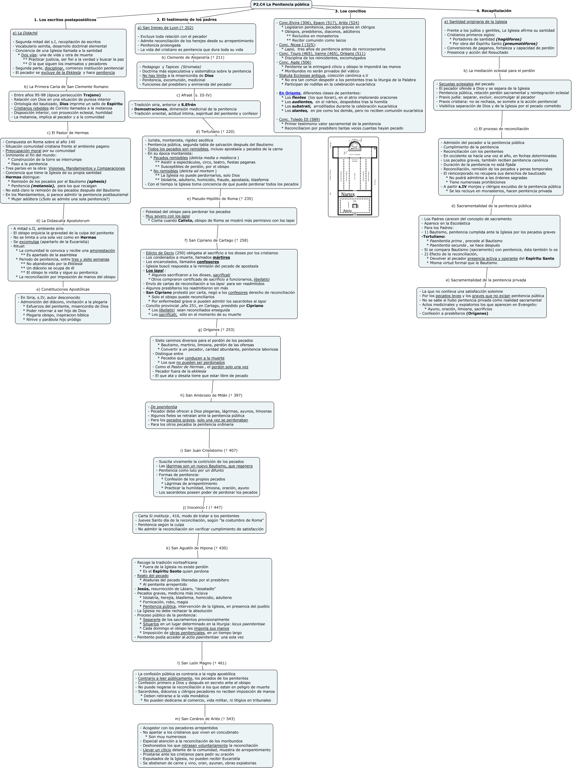 Este Cmap, tiene información relacionada con: P2.C4 La Penitencia pública, - Pedagogo y Tapices (Stromata) - Doctrina más especulativa y sistemática sobre la penitencia - No hay límite a la misericordia de Dios - Penitencia, excomunión, medicinal - Funciones del presbítero y enmienda del pecador c) Afraat (s. III-IV) - Tradición siria, anterior a S.Efrén - Demostraciones, dimensión medicinal de la penitencia - Tradición oriental, actitud íntima, espiritual del penitente y confesor, a) Santidad originaria de la Iglesia - Frente a los judíos y gentiles, La Iglesia afirma su santidad - Cristianos primeros siglos: * Portadores de santidad (hagióforos) * Por obra del Espíritu Santo (pneumatóforos) - Conversiones de paganos, fortaleza y capacidad de perdón - Presencia y acción del Resucitado b) La mediación eclesial para el perdón - Secuelas eclesiales del pecado - El pecador ofende a Dios y se separa de la Iglesia - Penitencia pública, relación perdón sacramental y reintegración eclesial - Praxis judía: separar, excluir, excomulgar al pecador - Praxis cristiana: no se rechaza, se somete a la acción penitencial - Visibiliza separación de Dios y de la Iglesia por el pecado cometido, - Siete caminos diversos para el perdón de los pecados * Bautismo, martirio, limosna, perdón de las ofensas * Convertir a un pecador, caridad abundante, penitencia laboriosa - Distingue entre * Pecados que conducen a la muerte * Los que no pueden ser perdonados - Como el Pastor de Hermas, el perdón solo una vez - Pecador fuera de la ekklesía - El que ata y desata tiene que estar libre de pecado h) San Ambrosio de Milán († 397) - De poenitentia - Pecador debe ofrecer a Dios plegarias, lágrimas, ayunos, limosnas - Algunos fieles se retraían ante la penitencia pública - Para los pecados graves, solo una vez se perdonaban - Para los otros pecados la penitencia ordinaria, P2.C4 La Penitencia pública 1. Los escritos postapostólicos a) La Didaché - Segunda mitad del s.I, recopilación de escritos - Vocabulario semita, desarrollo doctrinal elemental - Conciencia de una Iglesia llamada a la santidad * Dos vías: una de vida y otra de muerte ** Practicar justicia, ser fiel a la verdad y buscar la paz ** O la que siguen los insensatos y pecadores - Segunda parte, disciplinar, comienzo institución penitencial - El pecador se excluye de la Ekklesía y hace penitencia, - Jurista, montanista, rigidez ascética - Penitencia pública, segunda tabla de salvación después del Bautismo - Todos los pecados son remisibles, incluso apostasía y pecados de la carne - En su época montanista: * Pecados remisibles (delicta media o mediocra) ** Asistir a espectáculos, circo, teatro, fiestas paganas ** Susceptibles de perdón, por el obispo * No remisibles (delicta ad mortem) ** La Iglesia no puede perdornarlos, solo Dios ** Idolatría, adulterio, homicidio, fraude, apostasía, blasfemia - Con el tiempo la Iglesia toma conciencia de que puede perdonar todos los pecados e) Pseudo-Hipólito de Roma († 235) - Potestad del obispo para perdonar los pecados - Muy severo con los lapsi * Cisma cuando Calixto, obispo de Roma se mostró más permisivo con los lapsi, - Edicto de Decio (250) obligaba al sacrificio a los dioses por los cristianos - Los condenados a muerte, llamados mártires - Los encarcelados, llamados confesores - Iglesia buscó respuesta a la remisión del pecado de apostasía - Los lapsi: * Algunos sacrificaron a los dioses, sacrificati *Otros compraron certificado de sacrificio a funcionarios, libellatici - Envío de cartas de reconciliación a los lapsi para ser readmitidos - Algunos presbíteros los readmitieron sin más - San Cipriano protestó por carta, negó a los confesores derecho de reconciliación * Solo el obispo puede reconciliarlos * Por enfermedad grave si pueden admitir los sacerdotes al lapsi - Concilio provincial ,año 251, en Cartago, presidido por Cipriano * Los libellatici sean reconciliados enseguida * Los sacrificati, sólo en el momento de su muerte g) Orígenes († 253) - Siete caminos diversos para el perdón de los pecados * Bautismo, martirio, limosna, perdón de las ofensas * Convertir a un pecador, caridad abundante, penitencia laboriosa - Distingue entre * Pecados que conducen a la muerte * Los que no pueden ser perdonados - Como el Pastor de Hermas, el perdón solo una vez - Pecador fuera de la ekklesía - El que ata y desata tiene que estar libre de pecado, - Secuelas eclesiales del pecado - El pecador ofende a Dios y se separa de la Iglesia - Penitencia pública, relación perdón sacramental y reintegración eclesial - Praxis judía: separar, excluir, excomulgar al pecador - Praxis cristiana: no se rechaza, se somete a la acción penitencial - Visibiliza separación de Dios y de la Iglesia por el pecado cometido c) El proceso de reconciliación - Admisión del pecador a la penitencia pública - Cumplimiento de la penitencia - Reconciliación con los penitentes - En occidente se hacía una vez al año, en fechas determinadas - Los pecados graves, también reciben penitencia canónica - Duración de la penitencia no está fijada - Reconciliación, remisión de los pecados y penas temporales - El reincorporado no recupera sus derechos de bautizado * No podrá admitirse a las órdenes sagradas * Tiene numerosas prohibiciones - A partir s.IV monjes y clérigos excuidos de la penitencia pública * Se les recluye en monasterios, hacen penitencia privada, P2.C4 La Penitencia pública 3. Los concilios - Conc.Elvira (306), Epaon (517), Arlés (524) * Legislaron penitencia, pecados graves en clérigos * Obispos, presbíteros, diaconos, adúlteros ** Recluidos en monasterios ** Recibir comunión como laicos - Conc. Nicea I (325): * Lapsi, tres años de penitencia antes de reincorporarlos - Conc. Tours (465), Vanne (465), Orleans (511) * Disciplina de los reincidentes, excomulgados - Conc. Agde (506) * Penitente se le entregará cilicio y obispo le impondrá las manos 