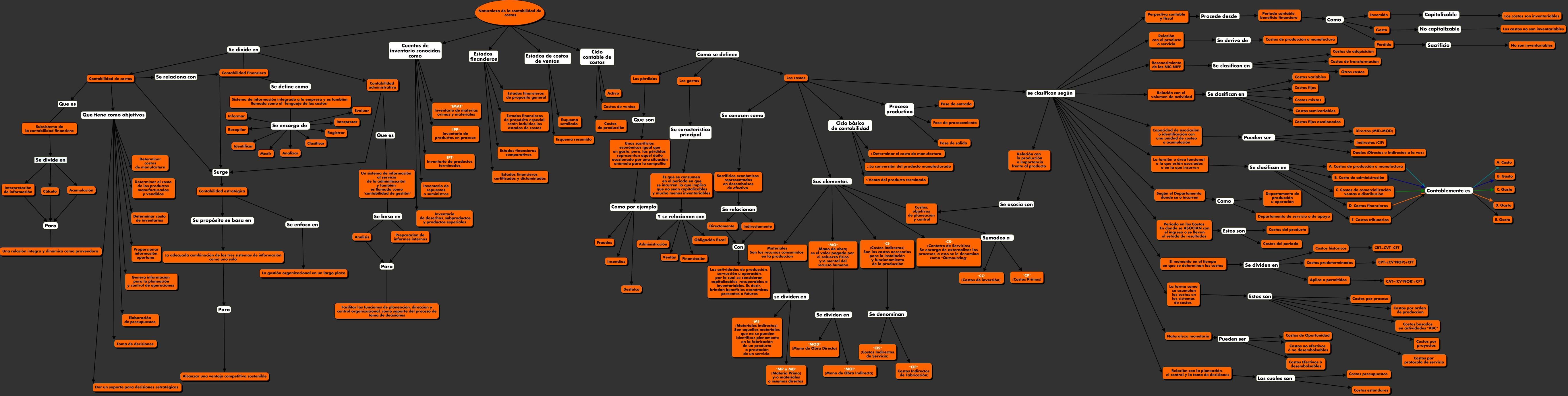 Este Cmap, tiene información relacionada con: Naturaleza de los costos, Costos, objetivos de planeación y control Sus elementos "CS" (Contatro de Servicios) Se encarga de externalizar los procesos, a esto se le denomina como "Outsourcing", Los gastos Su característica principal Es que se consumen en el periodo en que se incurren, lo que implica que no sean capitalizables y mucho menos inventariables, Relación con el volumen de actividad Se clasifican en Costos mixtos, Sistema de información integrado a la empresa y es también llamada como el "lenguaje de los costos" Se encarga de Recopilar, Los costos se clasifican según Reconocimiento de las NIC-NIFF, Costos historicos ???? CRT=CVT+CFT, Periodo contable, beneficio financiero Como Gasto, Es que se consumen en el periodo en que se incurren, lo que implica que no sean capitalizables y mucho menos inventariables Y se relacionan con Obligación fiscal, B. Costo de administración Contablemente es A. Costo, El momento en el tiempo en que se determinan los costos Se dividen en Costos historicos, Contabilidad administrativa Surge Contabilidad estratégica, C. Costos de comercialización, ventas o distribución Contablemente es A. Costo, Relación con el producto o servicio Se deriva de Costos de producción o manufactura, Pérdida Sacrificio No son inventariables, Periodo contable, beneficio financiero Como Pérdida, C. Costos de comercialización, ventas o distribución Contablemente es B. Gasto, Unos sacrificios económicos igual que un gasto, pero, las pérdidas representan aquel daño ocasionado por una situación anómala para la compañia Como por ejemplo Fraudes, Naturaleza de la contabilidad de costos Se divide en Contabilidad administrativa, Materiales Son los recursos consumidos en la producción se dividen en "MP ó MD" (Materia Prima) y/o materiales o insumos directos, El momento en el tiempo en que se determinan los costos Se dividen en Costos predeterminados